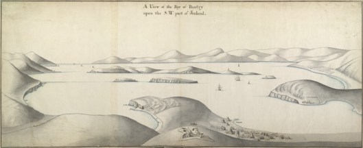 Description: View of Bantry Bay in Ireland. Richard Pococke (1704-1765) an Irish traveller, wrote the following words about Bantry Bay, when he journey there in 1758, ‘The bay as far as we could see it, lock’d in by the land, appear’d like a long lake, with beautiful Islands in it, fine small bays which they call coves and well cultivated heads of land making into it, and within them, small hills under corn, and all bounded by very high rocky mountains, at a proper distance, altogether making the most pleasing and with that the most awful sight that can be imagined. At the bottom of the South east Cove of this bay of Bantre, the town of Bantre is situated, which tho’ small is the best on the coast to the west of Kingsale.’