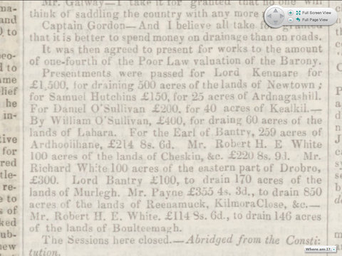 Robert Hedges Eyre White, Glengariff Castle. Attended Great Meeting in Bantry 1840 re Poor Laws. Grand Jury grant for drainage of 140 acres at Boultenagh.