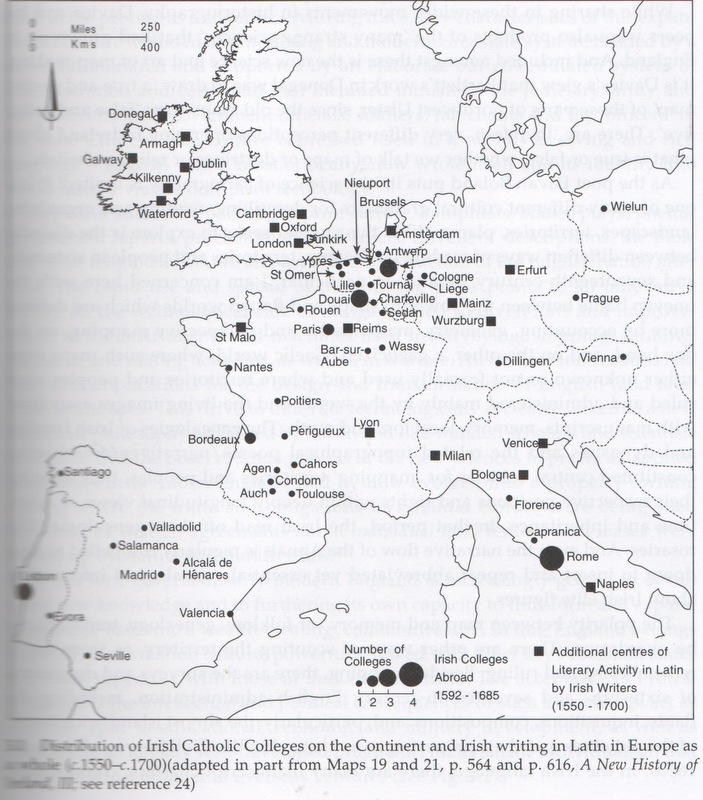 In William J. Smyth’s book, ‘Map-Making, Landscapes and Memory, A Geography of Colonial and Early Modern Ireland c.1530-1750’, he produces a map of the Irish Colleges in Europe and Irish writing in Latin c 1550-c1700. He mentions that 1,000 Irish soldiers served in Spanish Flanders between 1585 and 1630.