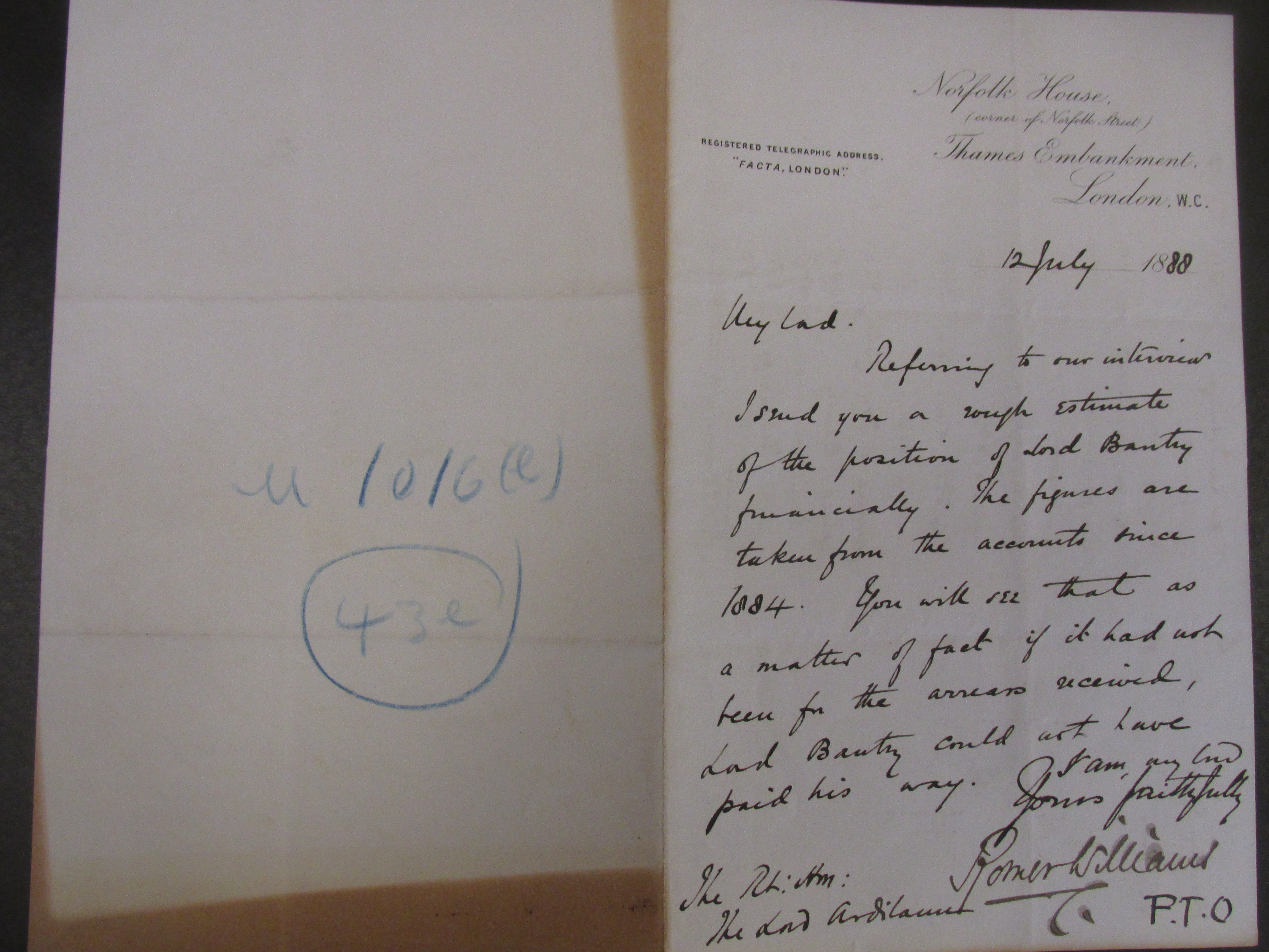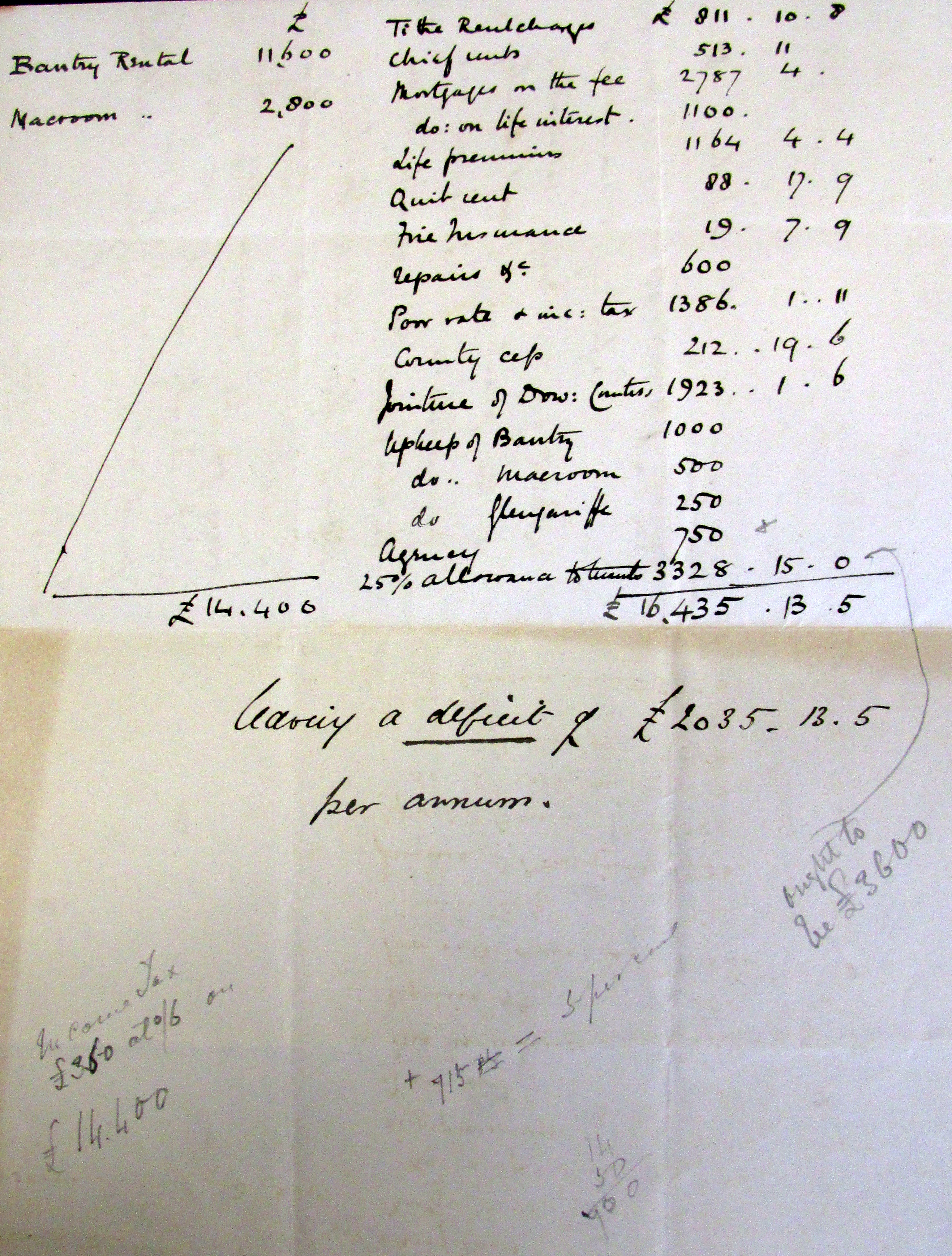 Snapshot of Finances of Bantry Estate, 1888, West Cork, requested by Lord Ardilaun (one of the Guinness Family married to Whites) showing rents of £11,600 for Bantry and £4,800 for Macroom, totalling £14,000 (present day €1.5 million), deficit of £2,035, with rent reductions for tenants of 25%.