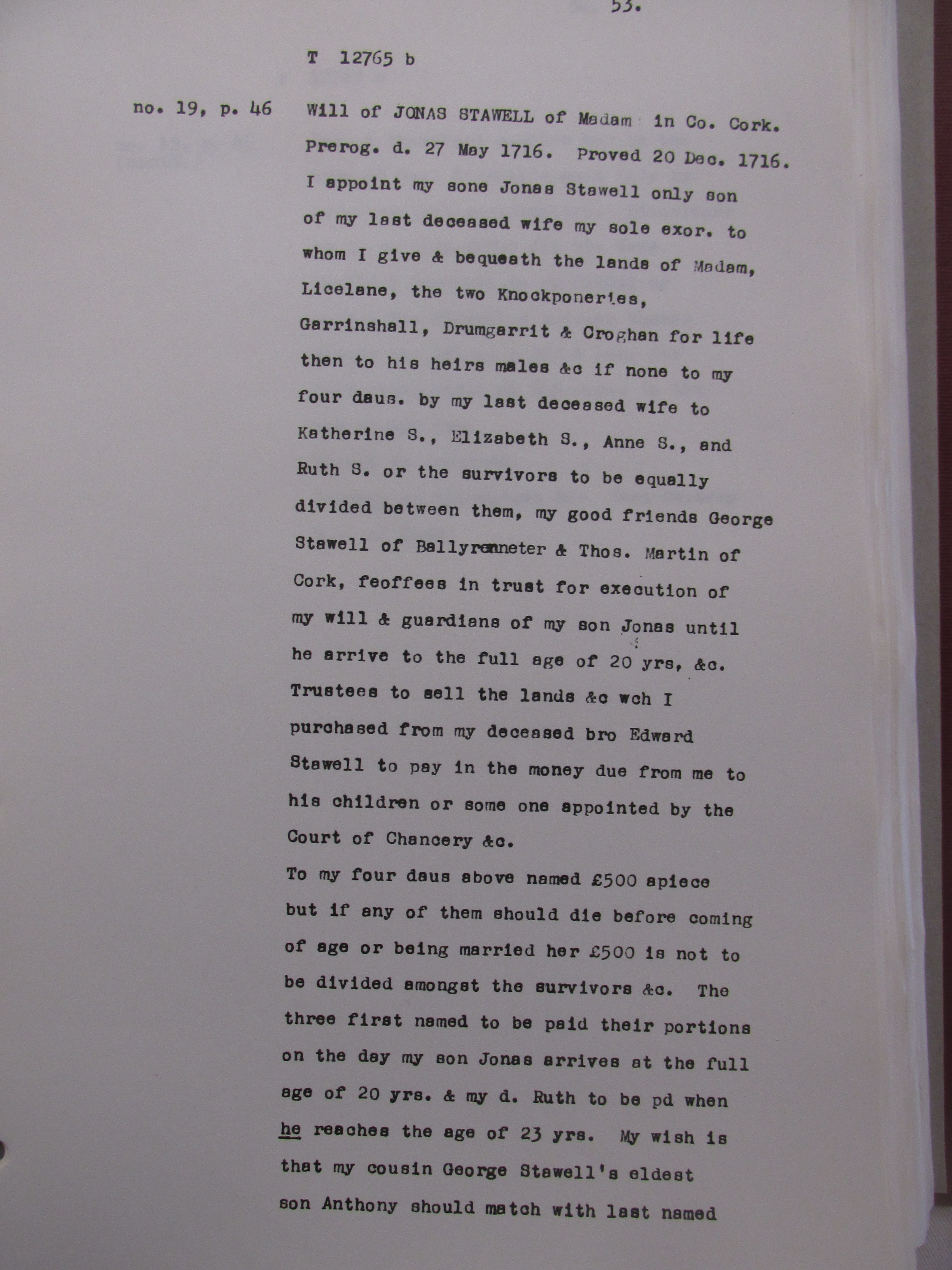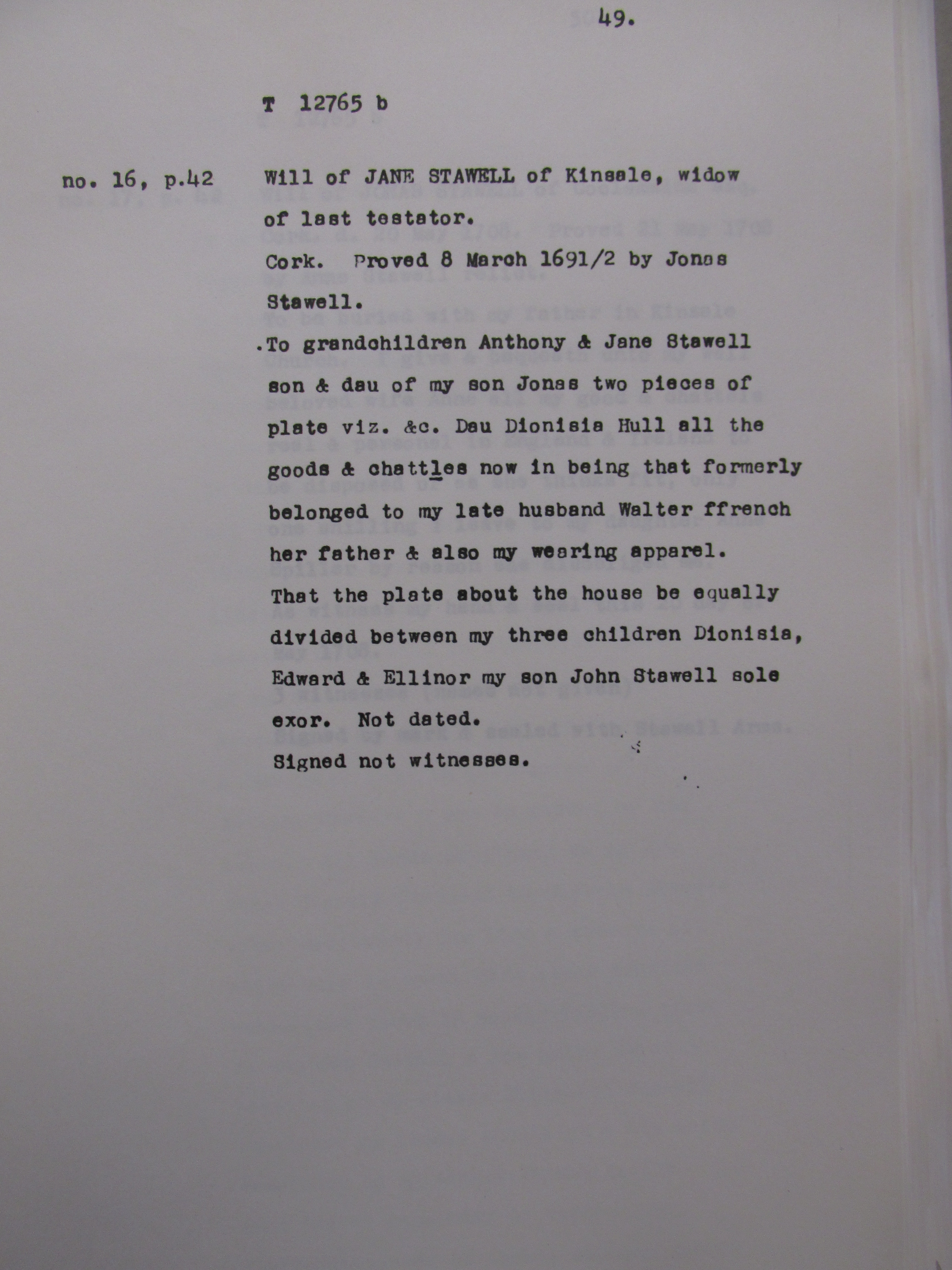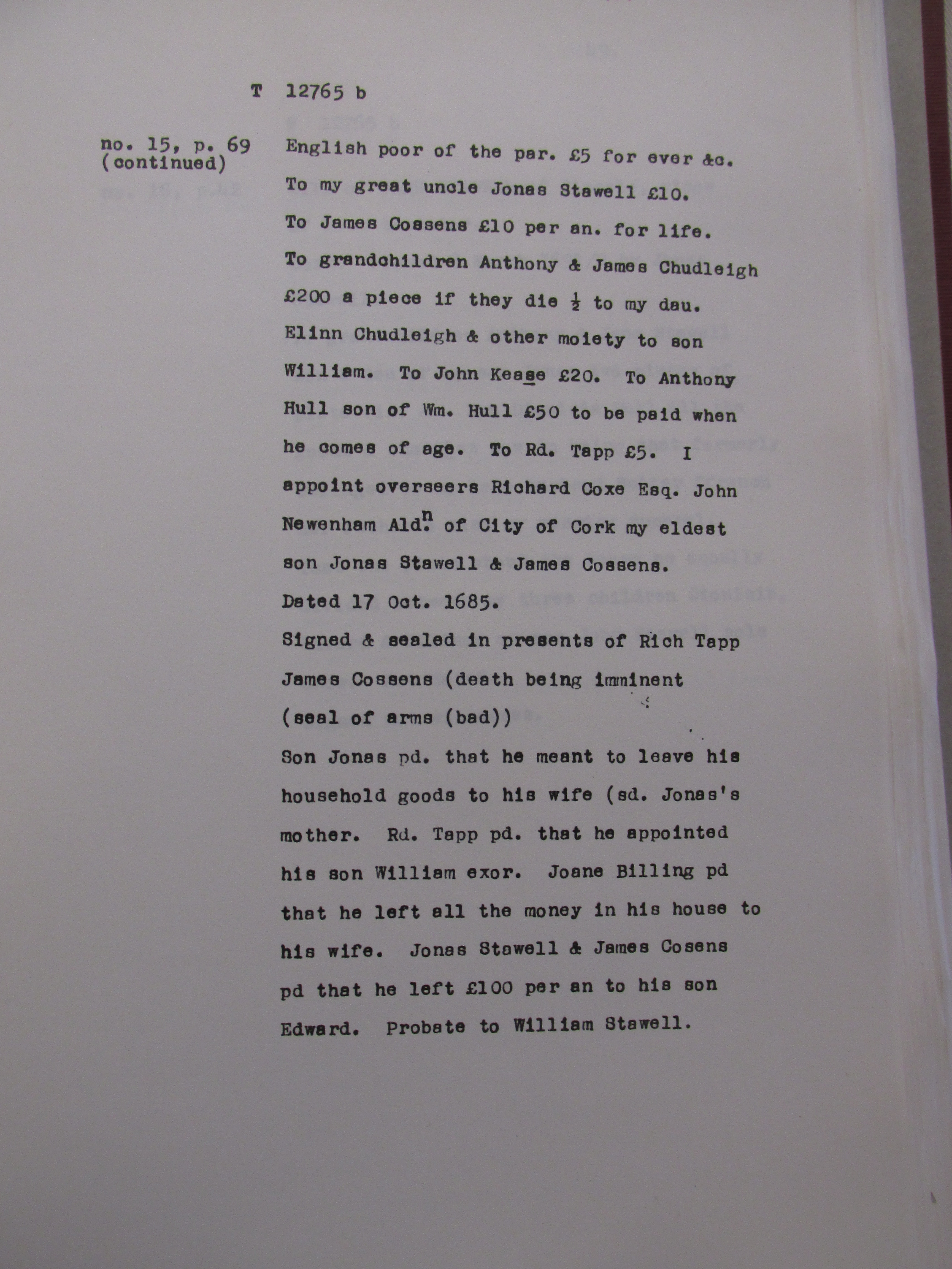 Wills associated with the Stawell family, Kinsale, Co.Cork from the 1690s. The Stawells were a Landed family associated with the Kinsale area. Among names mentione , Travers, Bldwin, Crone, Aldworth, Allen, Cox, Hull, Spiller, Chudlegh, Keefe/O’Keeffe, Mills, Nagle, O’Riordan, Rice.