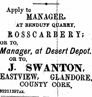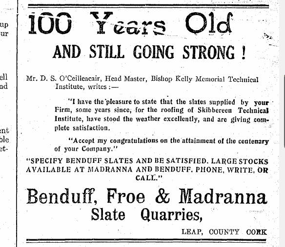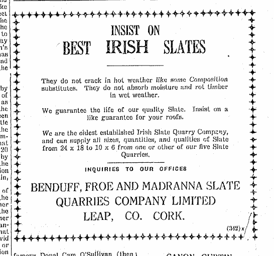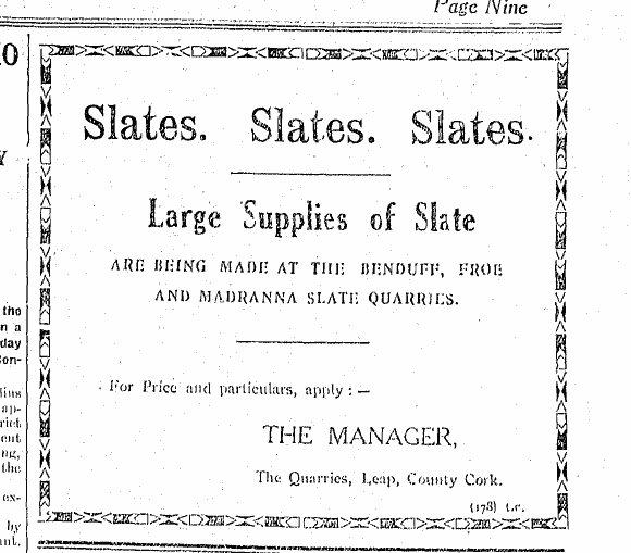 Madranagh (Cononagh) and Drinagh Slate Quarries, 1830s,1880s, early 1900s and 1940s West Cork. 24 Sunday Aug 2014 Posted by durrushistory in Uncategorized ≈ Leave a comment Courtesy De La Salle Publication, Skibbereen Drinagh: https://www.google.ie/maps/place/Drinagh,+Co.+Cork/@51.6365015,-9.1251297,12z/data=!4m2!3m1!1s0x4845aa1a8b511ff3:0x2600c7a819bb5a12 From this newspaper ad it may hve been operational since 1830s. 1935 1935 1934 Madranna: https://www.google.ie/maps/place/Madranna,+Co.+Cork/@51.6015377,-9.1139979,13z/data=!4m2!3m1!1s0x4845ab97c911cc71:0x2600c7a7bab4fc62 https://durrushistory.wordpress.com/2014/06/10/19th-century-mines-and-quarries-rossmore-and-friendly-cove-slate-quarries-durrus-copper-clonee-scart-bantry-barytes-rooska-and-killoveenogue-silver-and-lead-mine-west-cork/ https://durrushistory.wordpress.com/2014/06/18/geological-relations-in-the-south-of-ireland-by-thomas-weaver-including-west-cork-mines-1835/ https://durrushistory.wordpress.com/2014/06/09/slate-quarries-drimoleague-sea-lodge-durrus-kilcrohane-west-cork-skibbereen-and-west-carbery-eagle-or-south-western-advertiser-18656-and-lead-mine-1310-belamire-durrus/ Share this: Click to share on X (Opens in new window) X More Click to share on Facebook (Opens in new window) Facebook Like Loading...