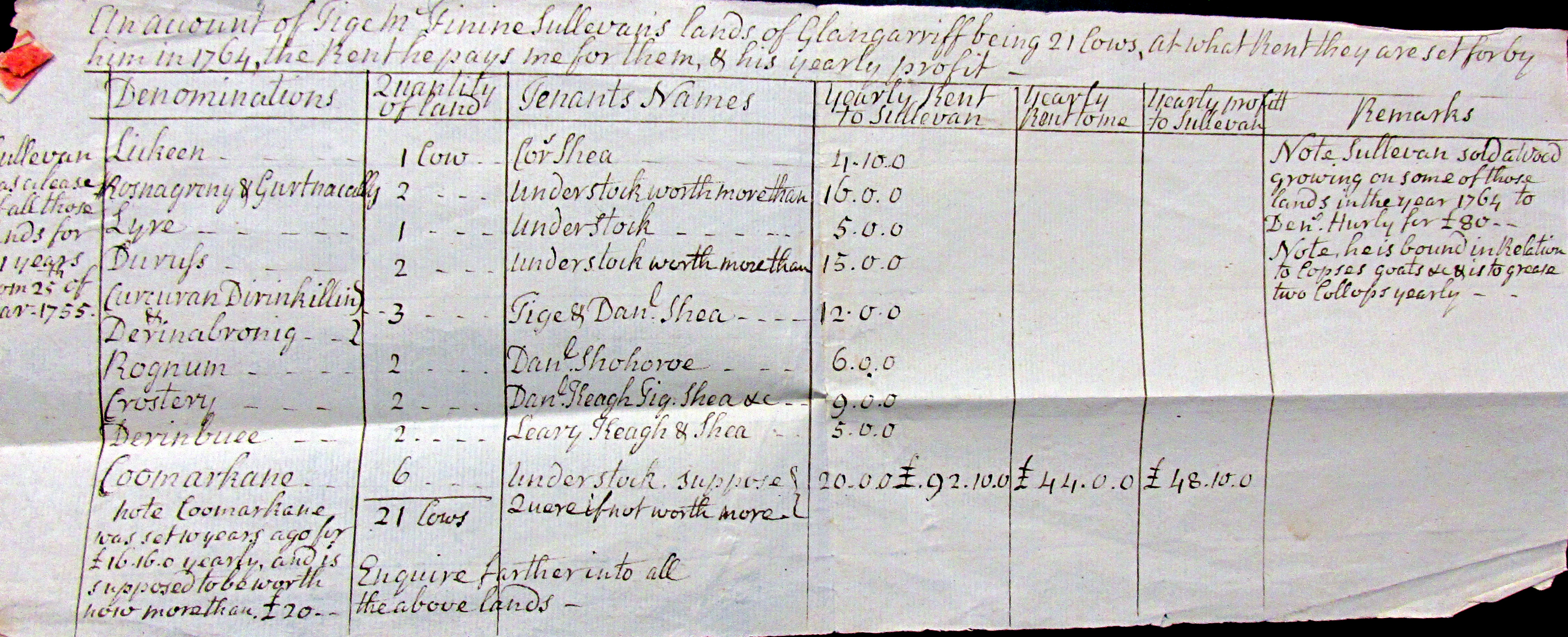 Estate of Tige M Finine Sullevan’s Estate, Glengariff, West Cork consisting of 21 Ploughlands with Tenants and rents, leased for 31 years from 1755, from Richard White, of Bantry House.