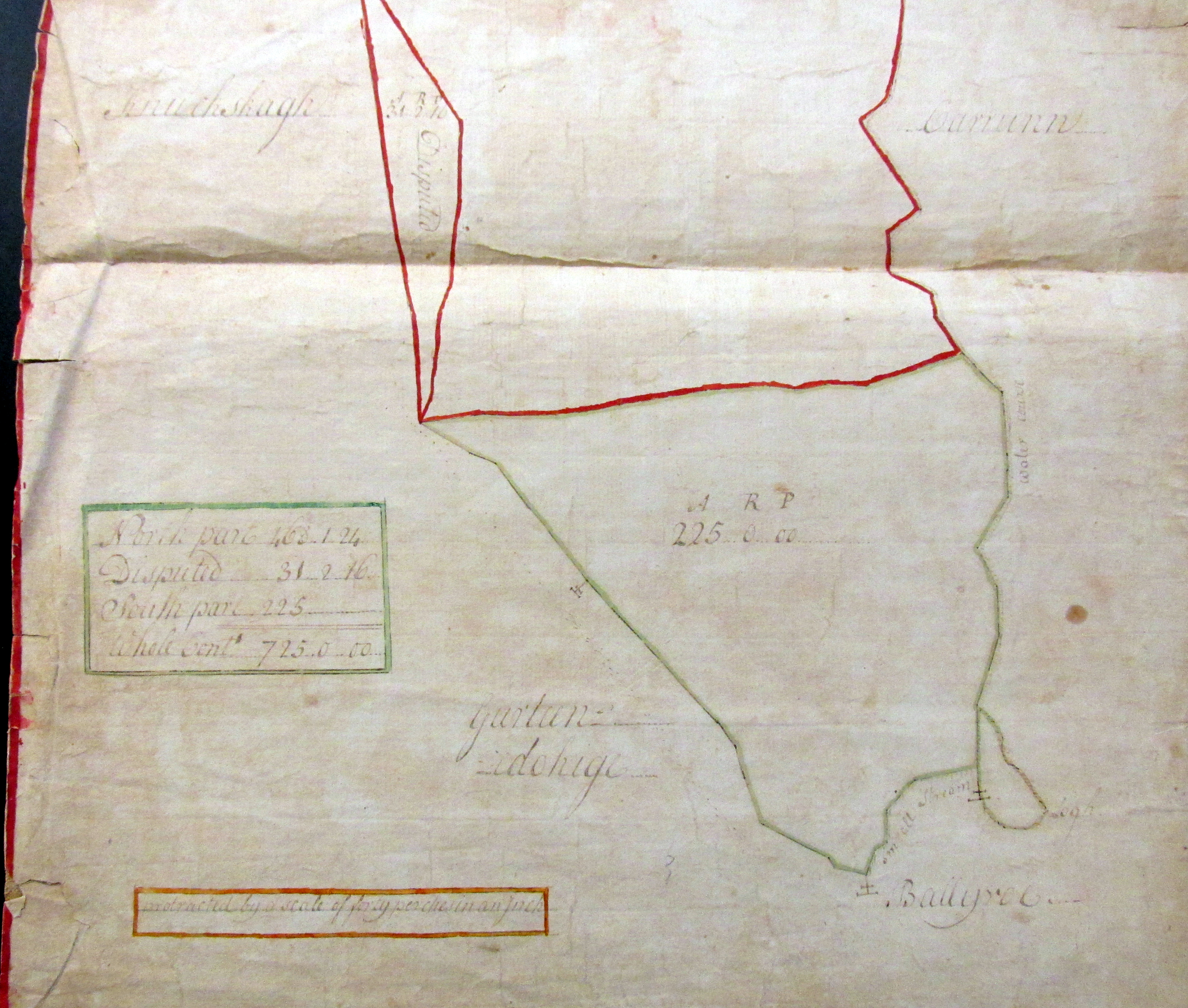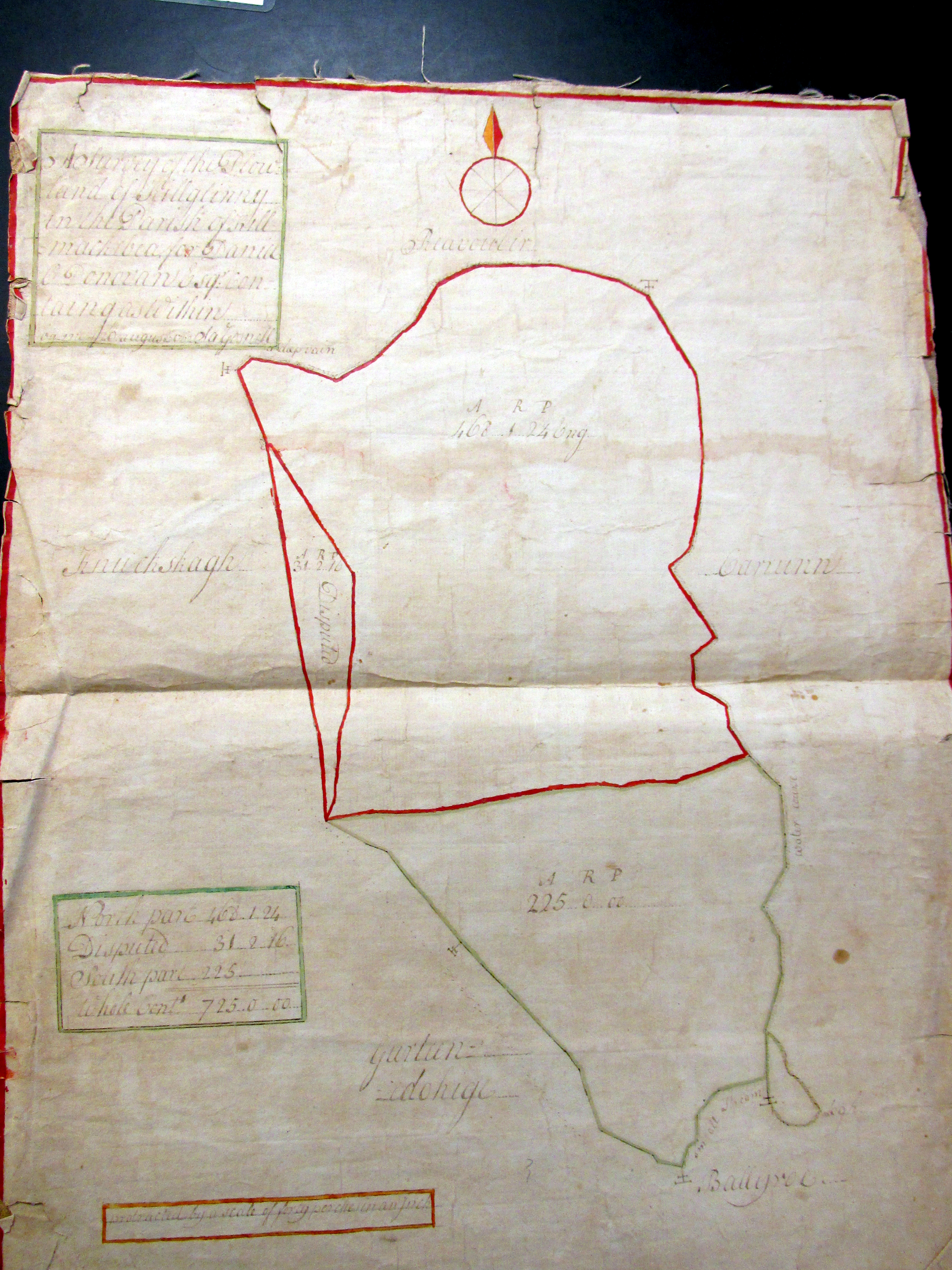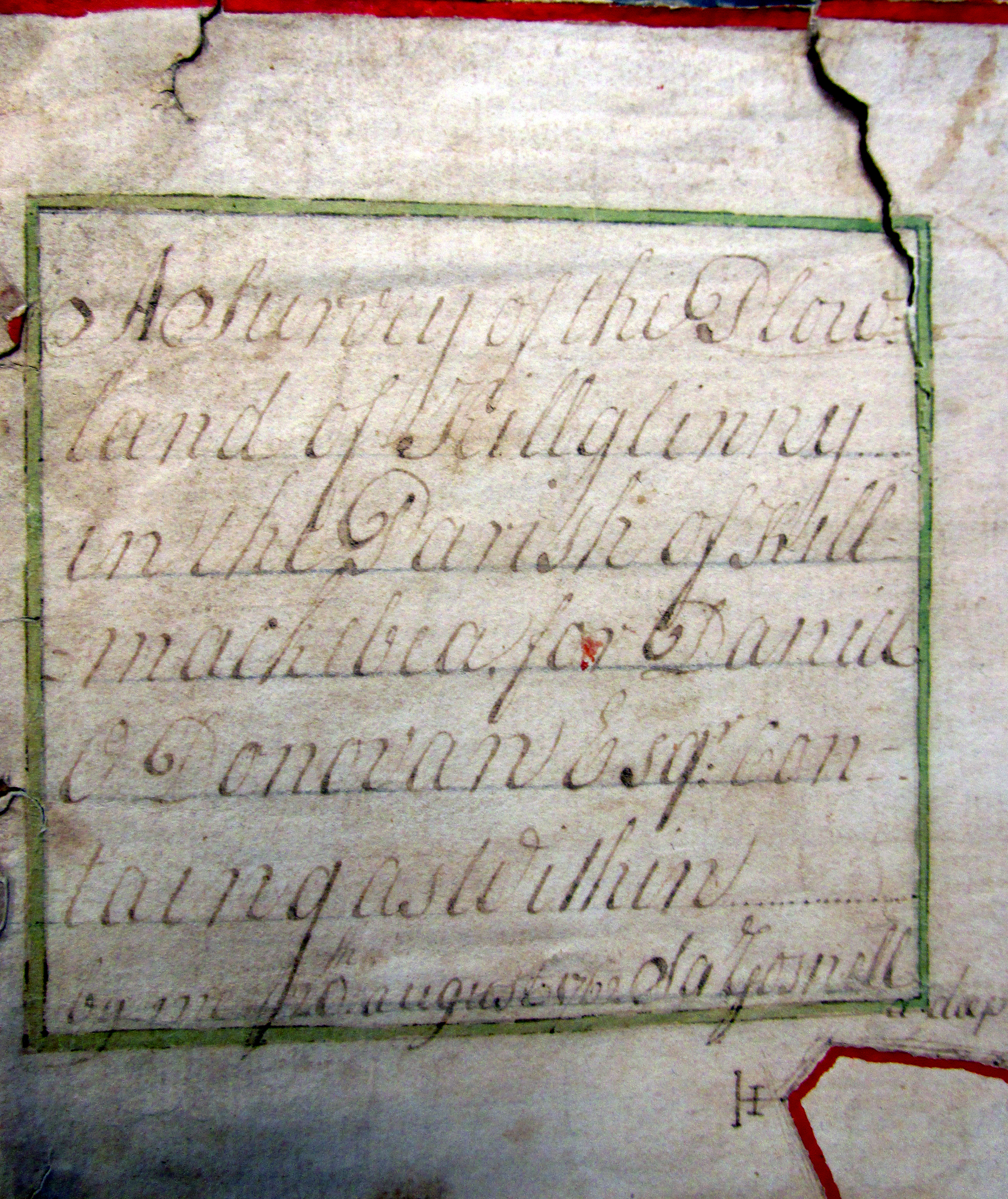 Survey of Estate of Daniel O’Donovan, Esq., 725 acres (31 in dispute) by Samuel Gosnell (Ancestor of Dr. Richard Caulfield, Cork Antiquarian), 20th June 1762 , at Knuckskagh, Currunn, Gurteeneddige, Ballyroe, Reavoulir referred to