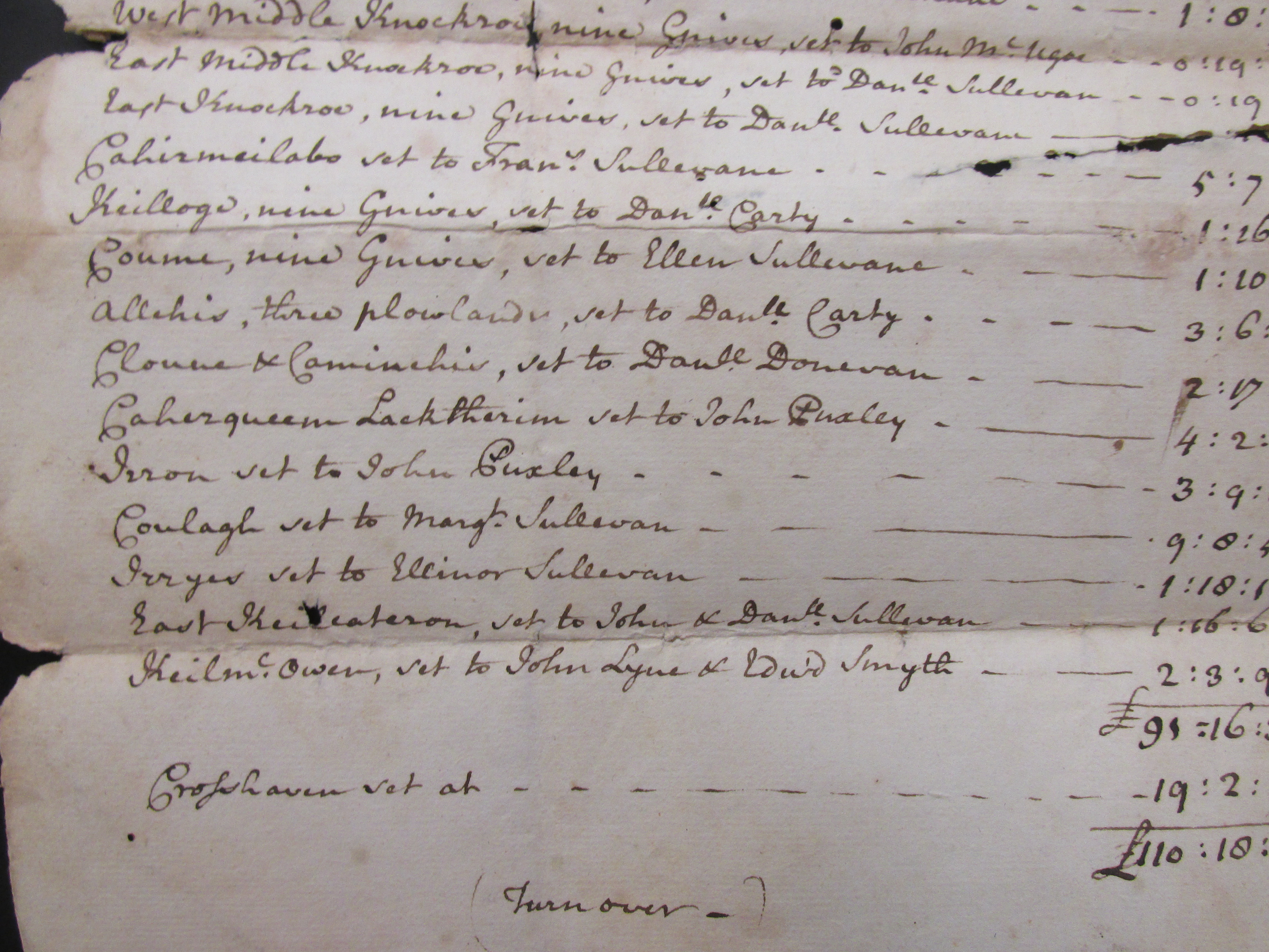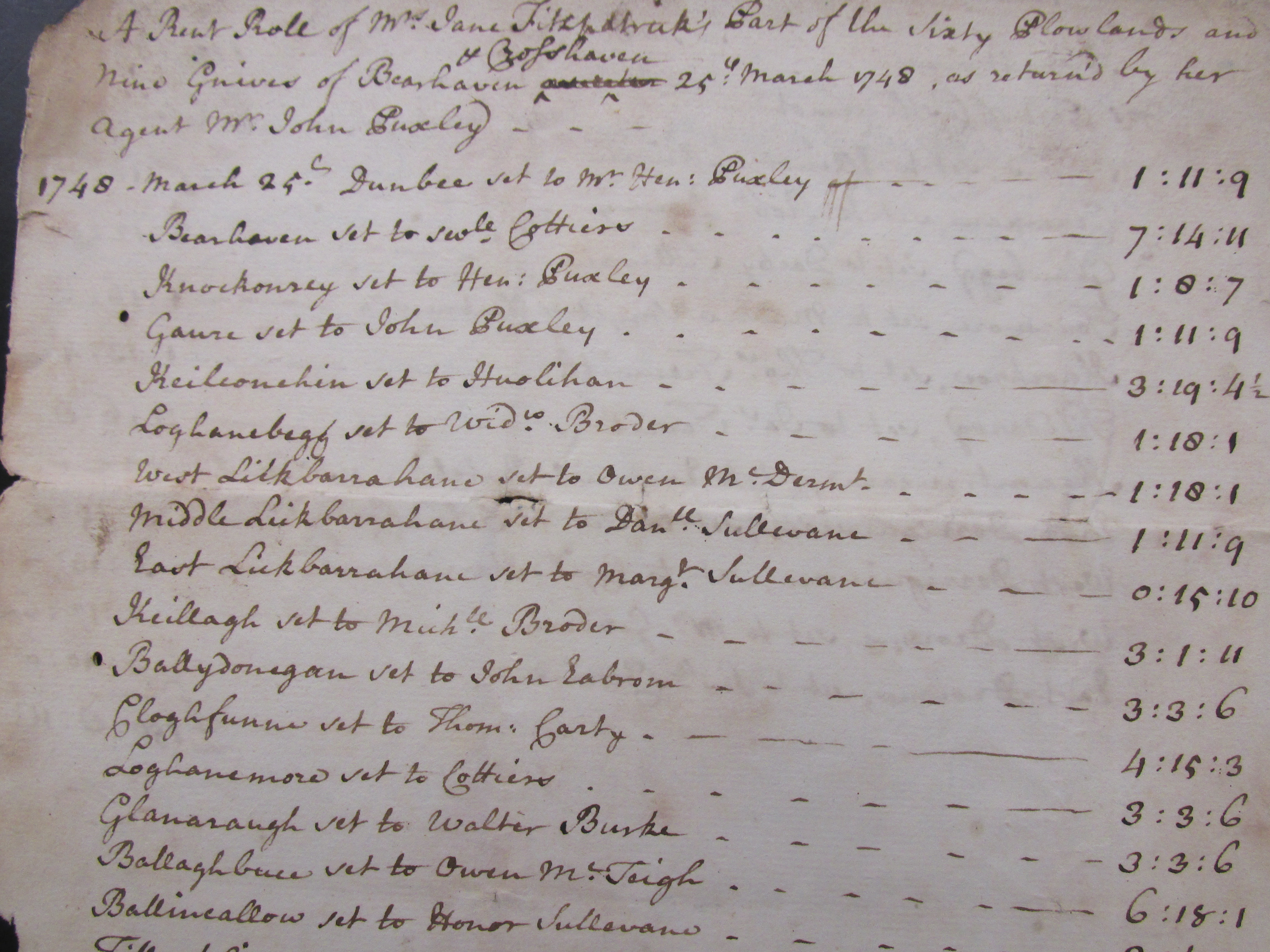 Power of Attorney of Mrs Jane Fitzpatrick, Galway, Devisee of Edward Eyre Esq., Macroom including Agent John Puxleys report 25th March 1748 of 60 Ploughlands and Gnives with Tenants names and holdings at Berehaven and Crosshaven, Co. Cork, Ireland