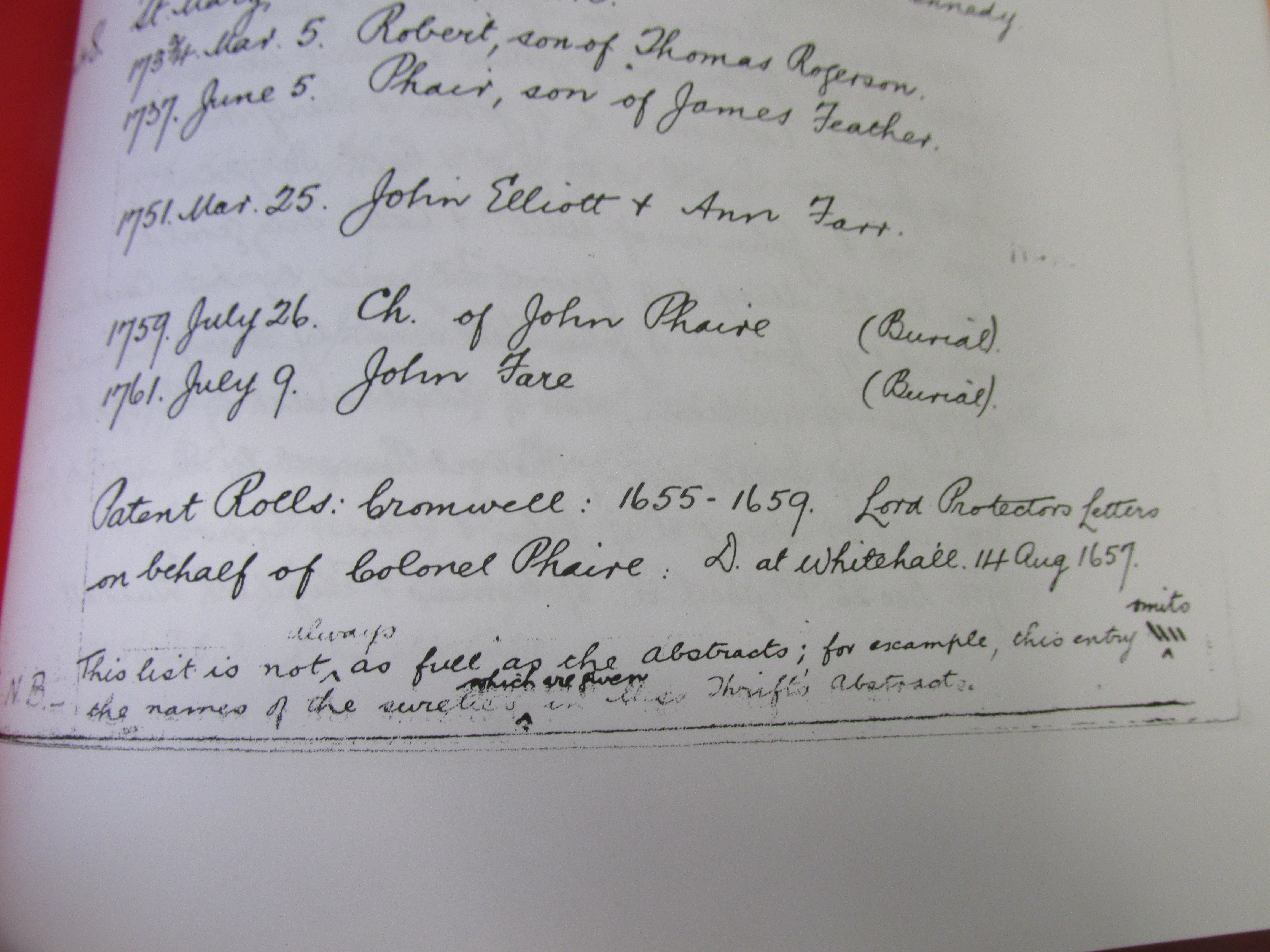 Phairs/Fairs, Patent Rolls Cromwell 1655-1659, Lord Protectors Letters on behalf of Colonel Phaire, died Whitehall, Skibbereen, West Cork, 14th August 1657, from Thrift’s Abstracts.