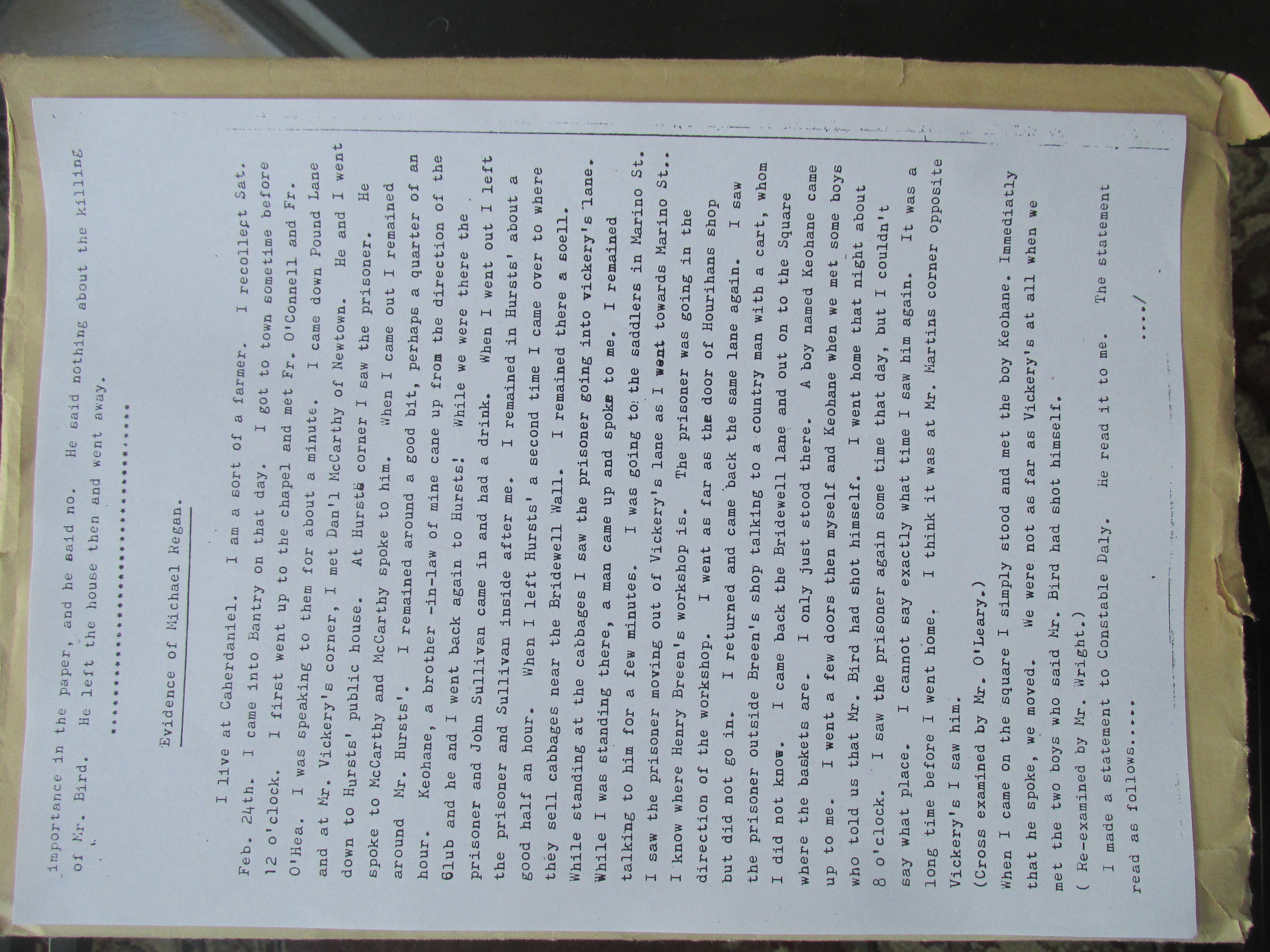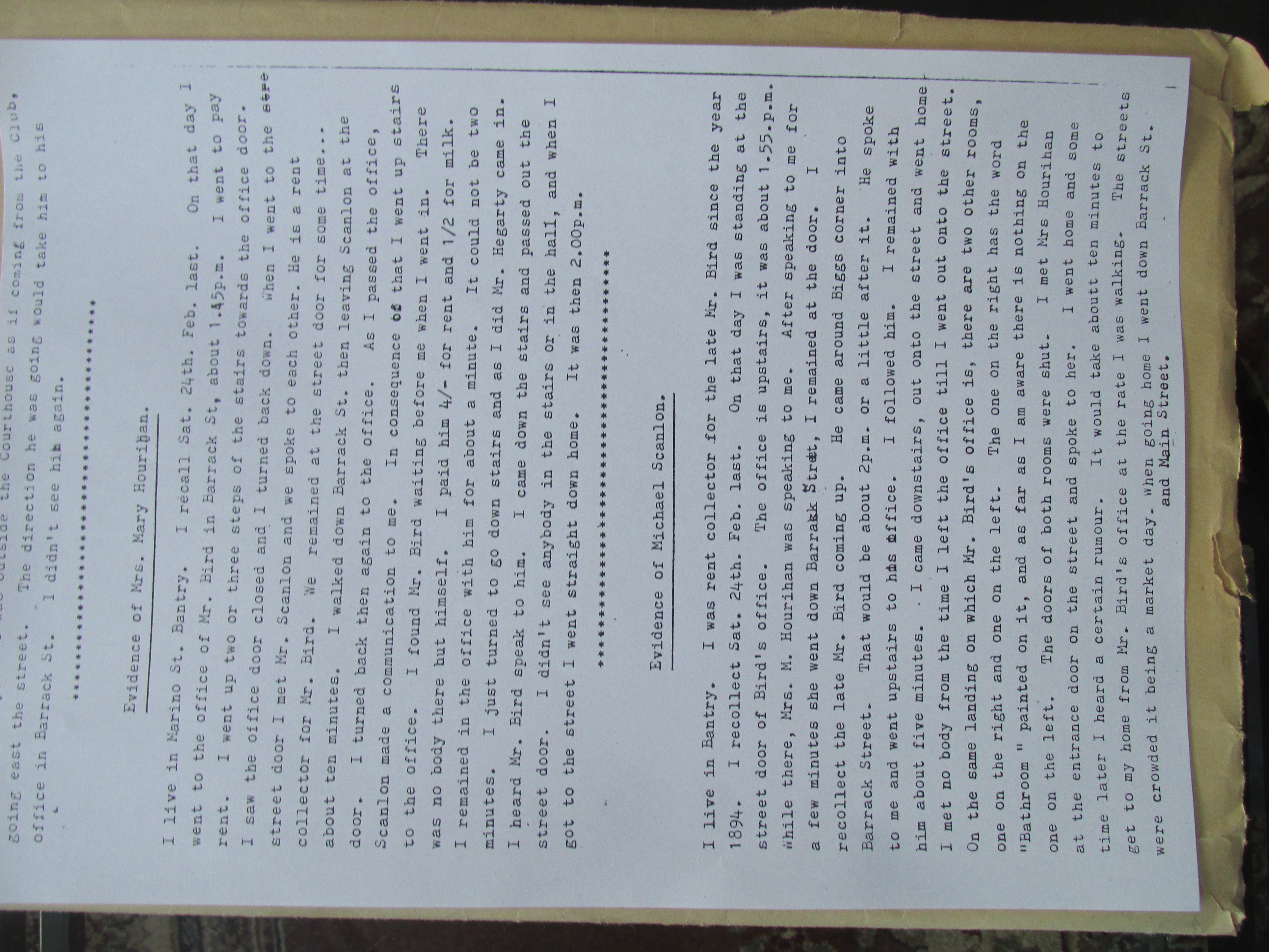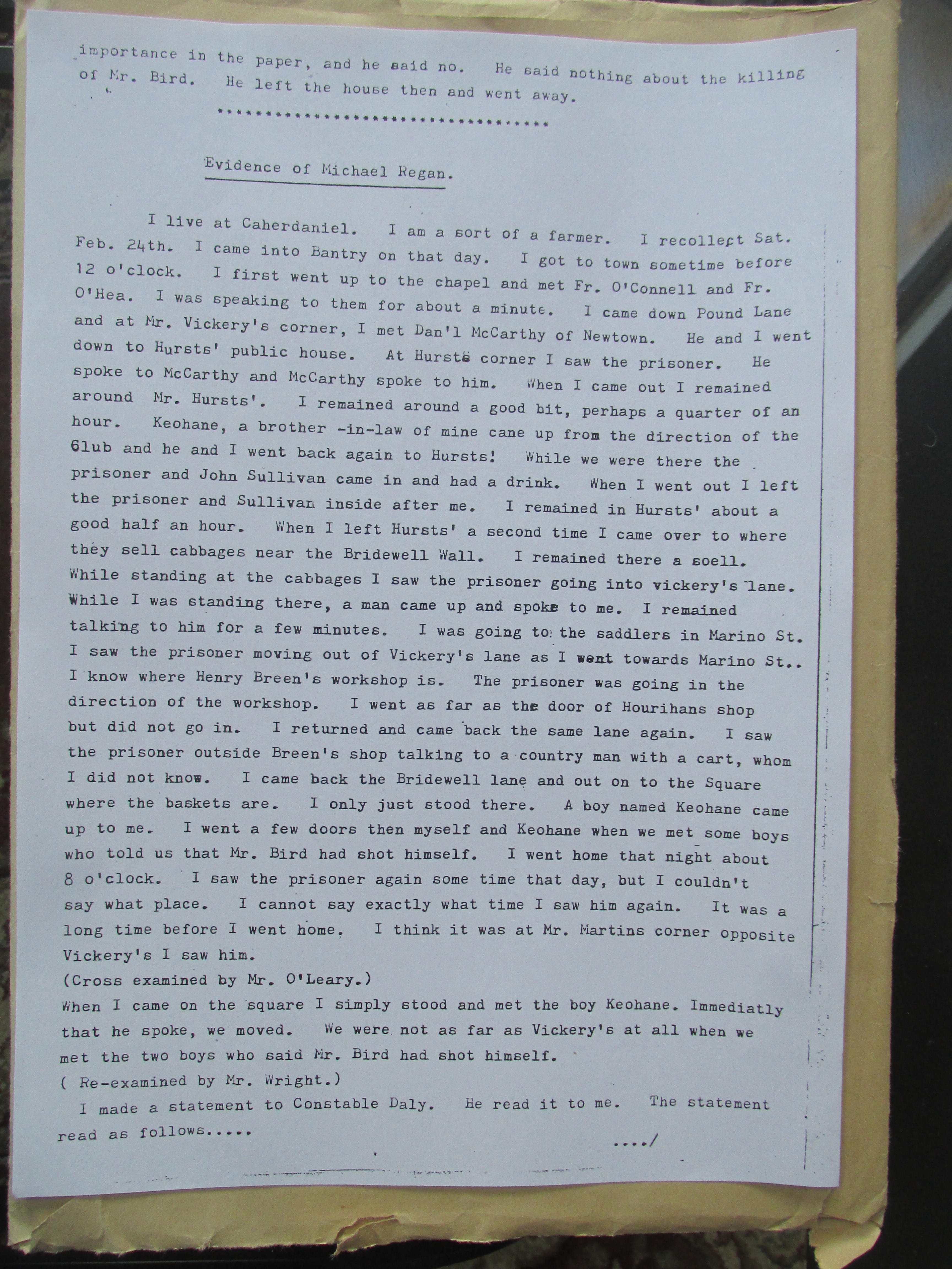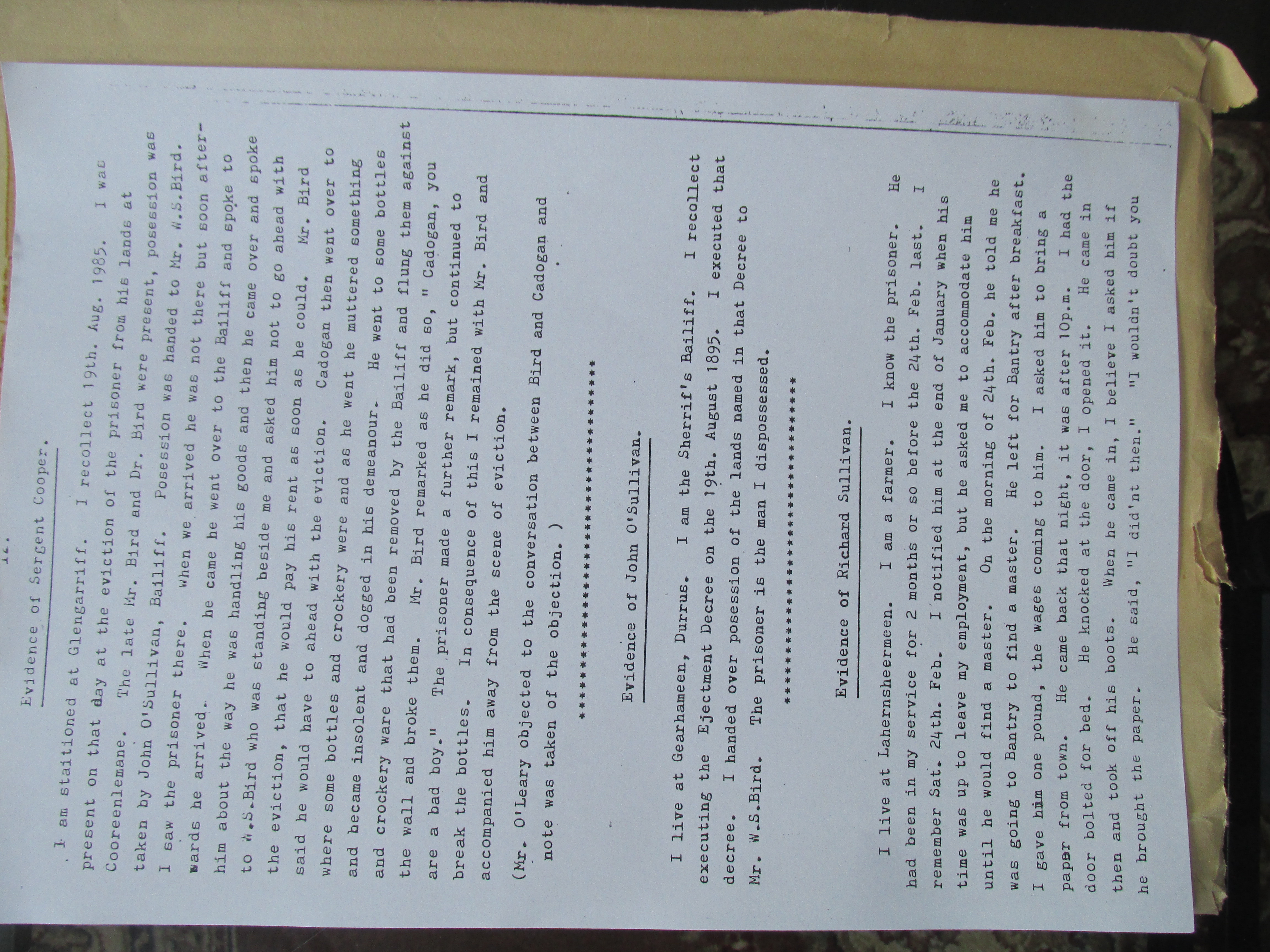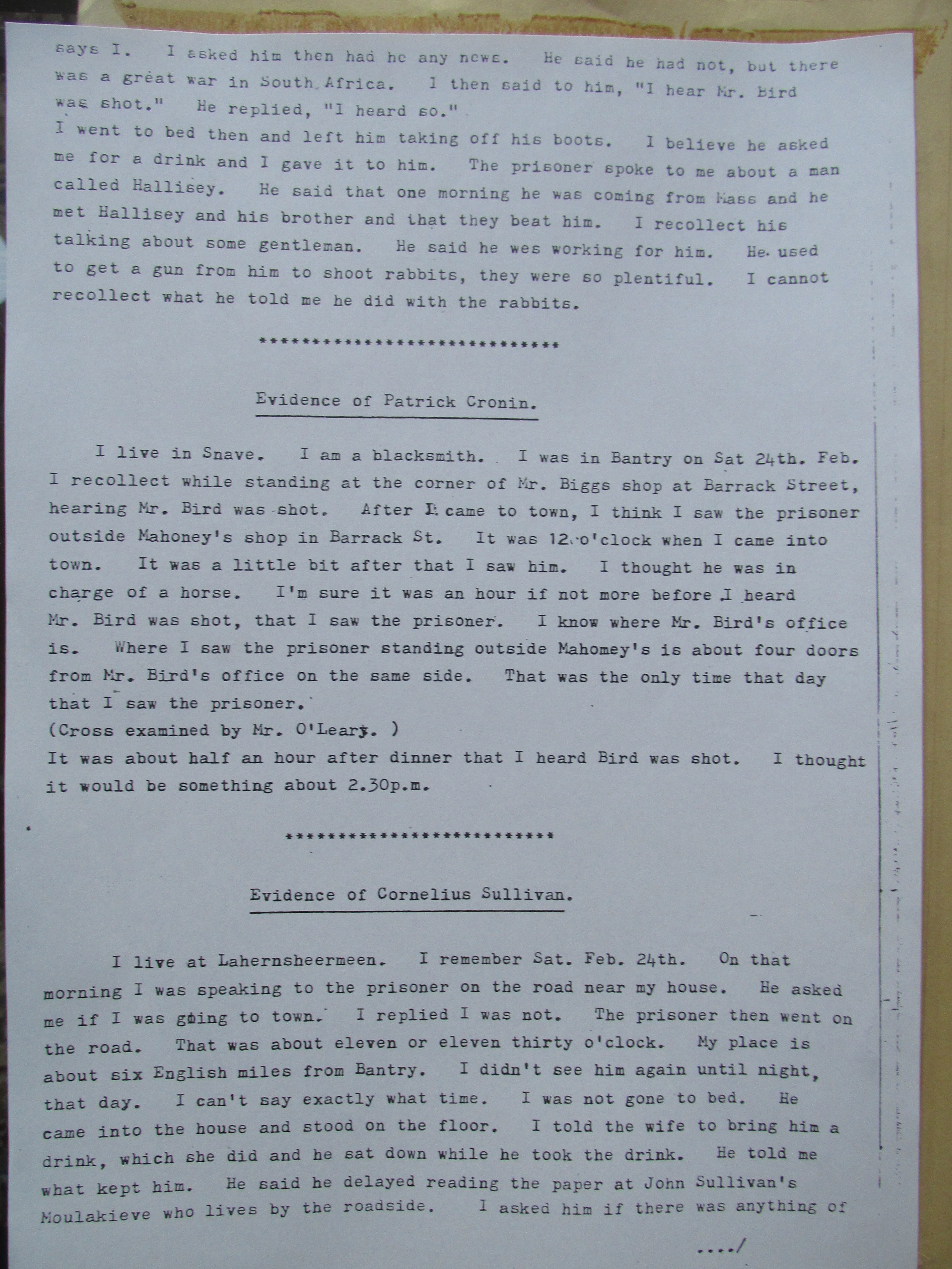 Partial transcript of trial of Tim Cadogan for murder of W.S. Bird, Bantry, West Cork. 1900 and botched Execution. Page 8 is missing.