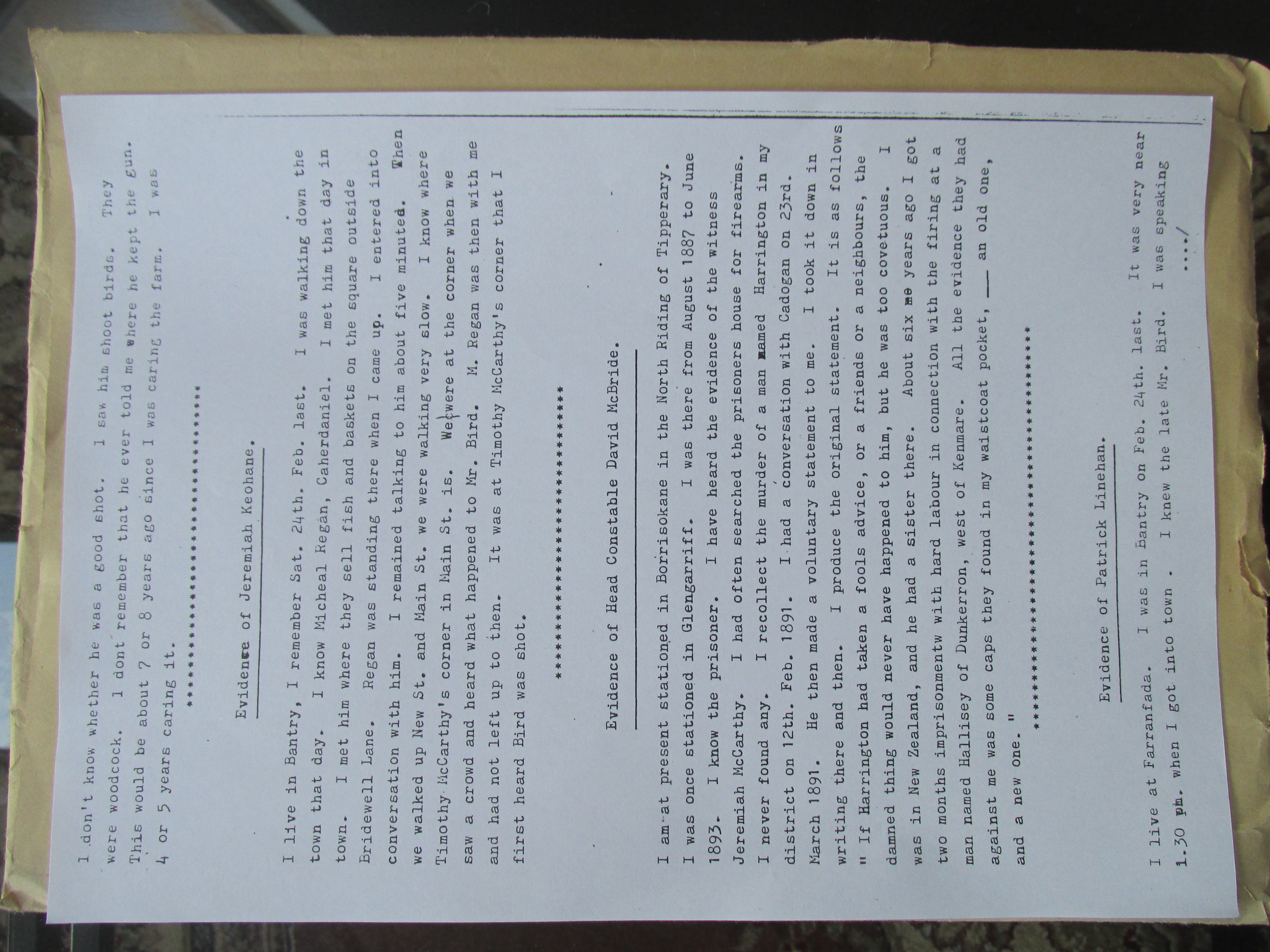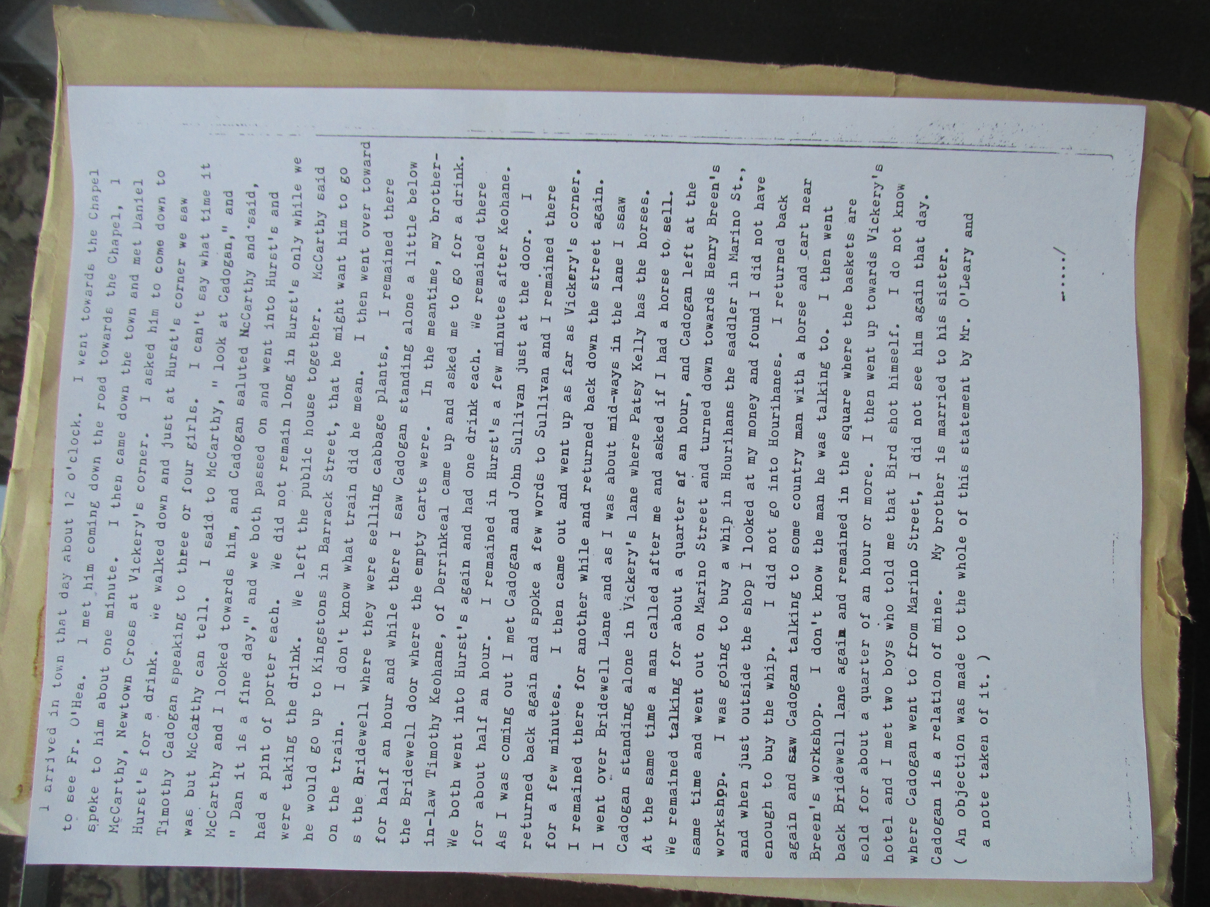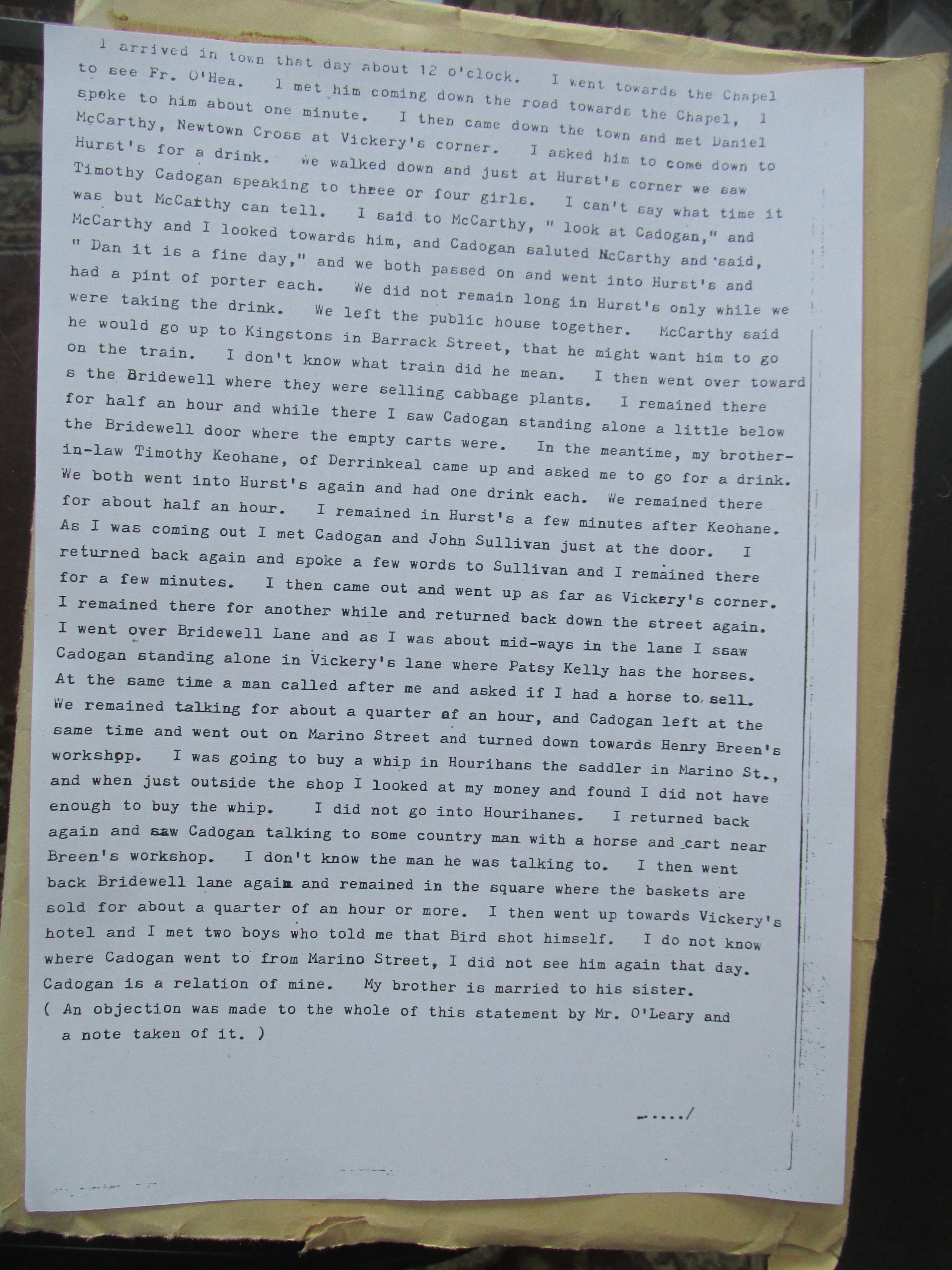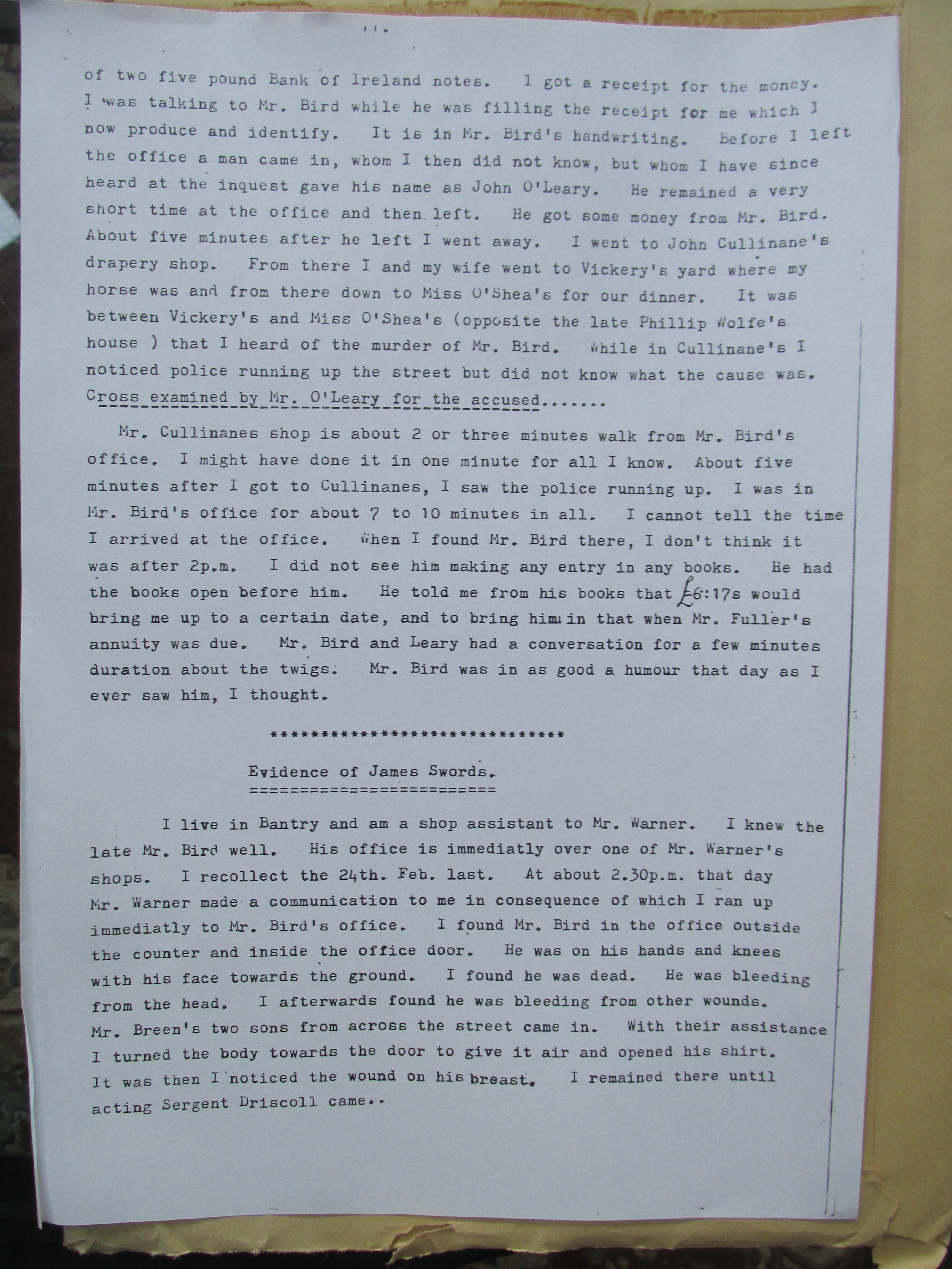 Partial transcript of trial of Tim Cadogan for murder of W.S. Bird, Bantry, West Cork. 1900 and botched Execution. Page 8 is missing.