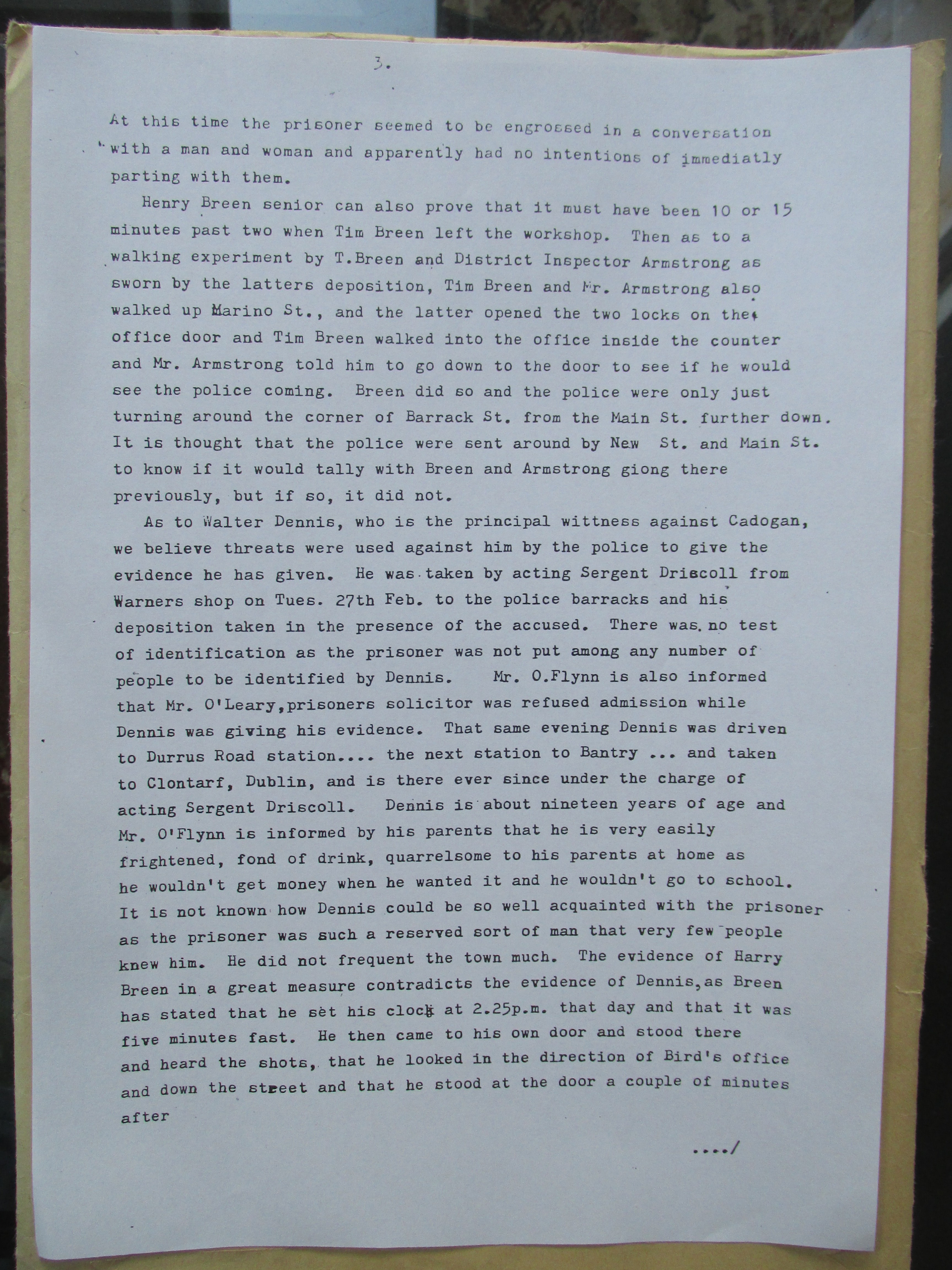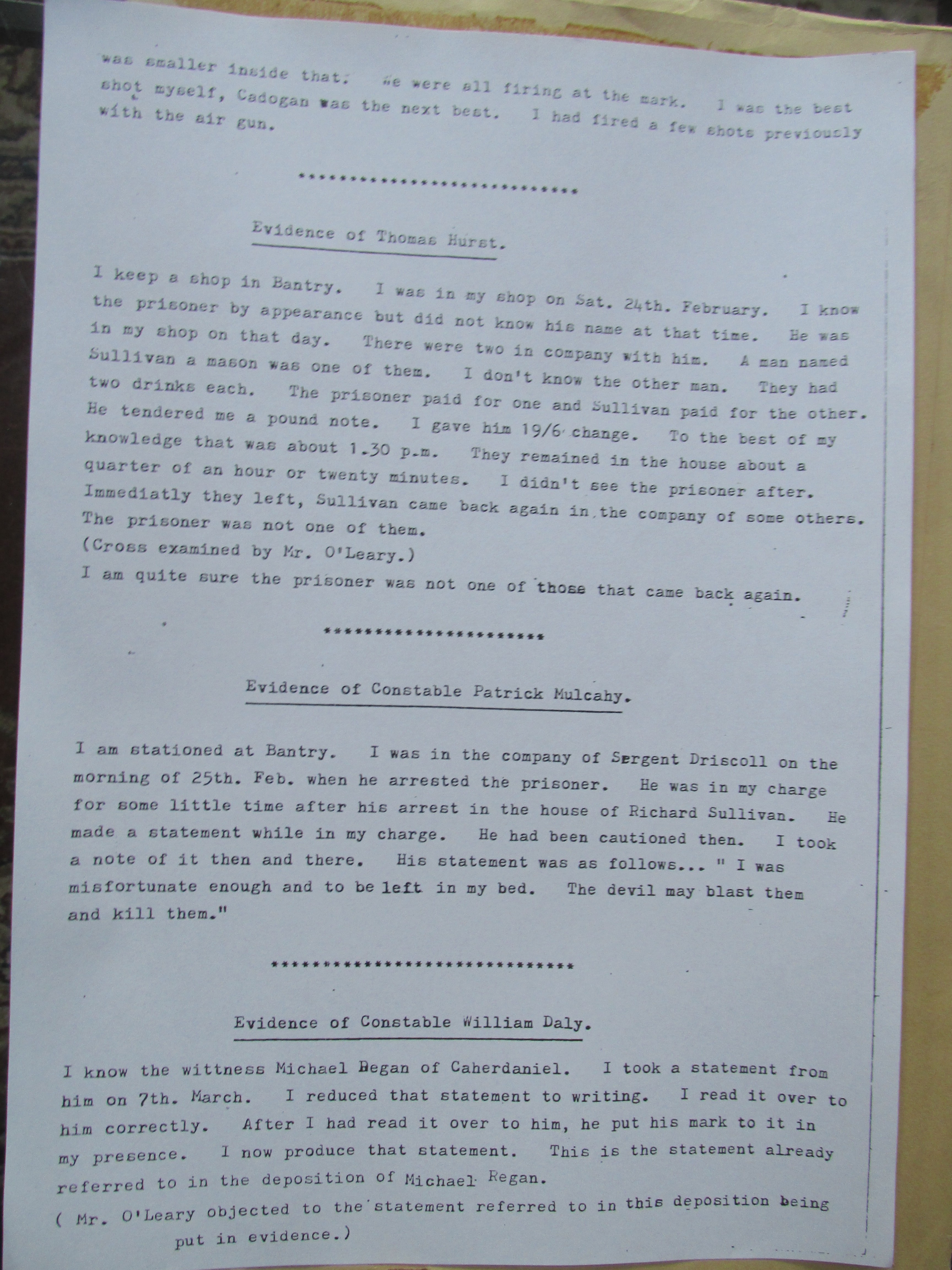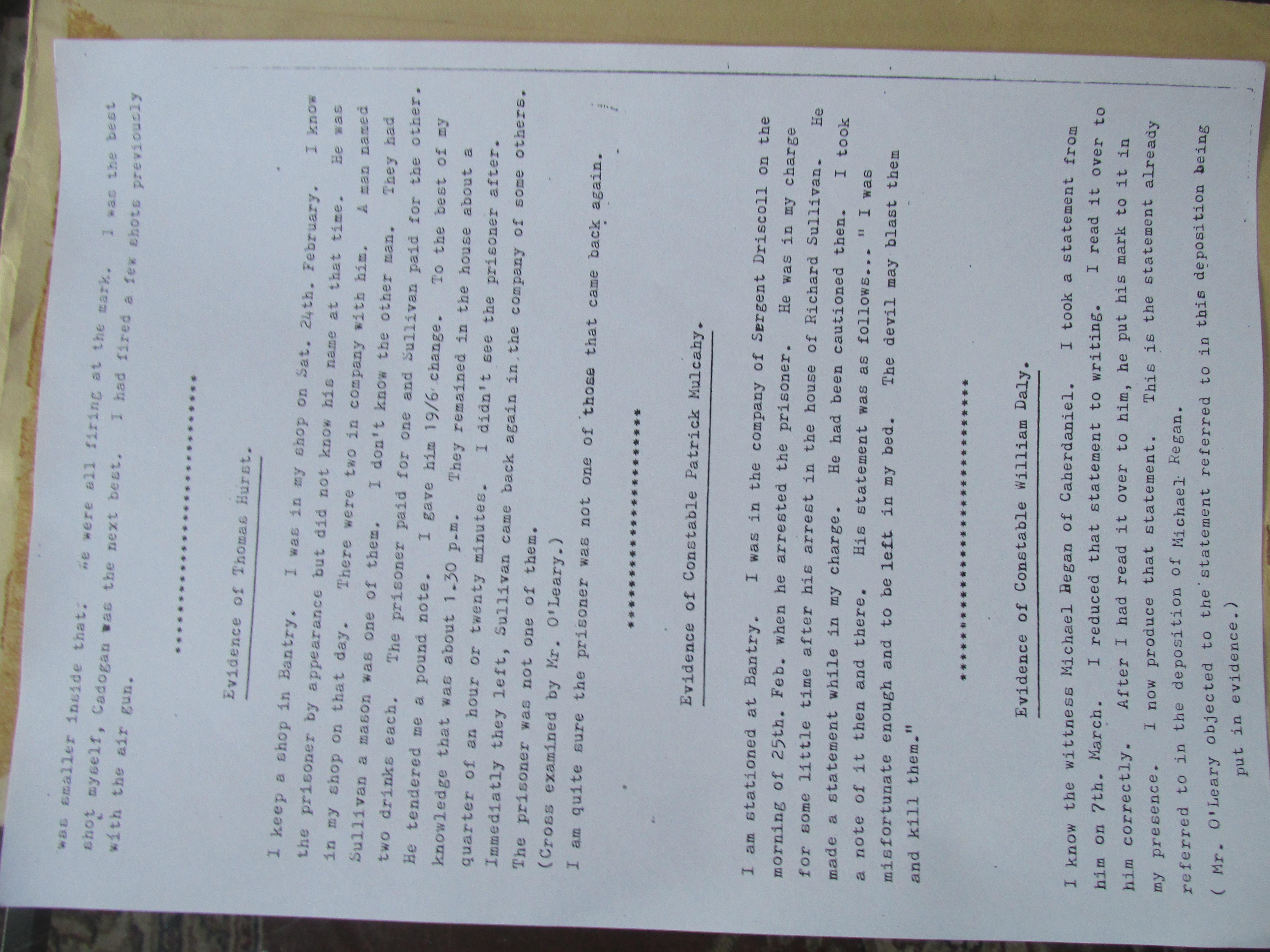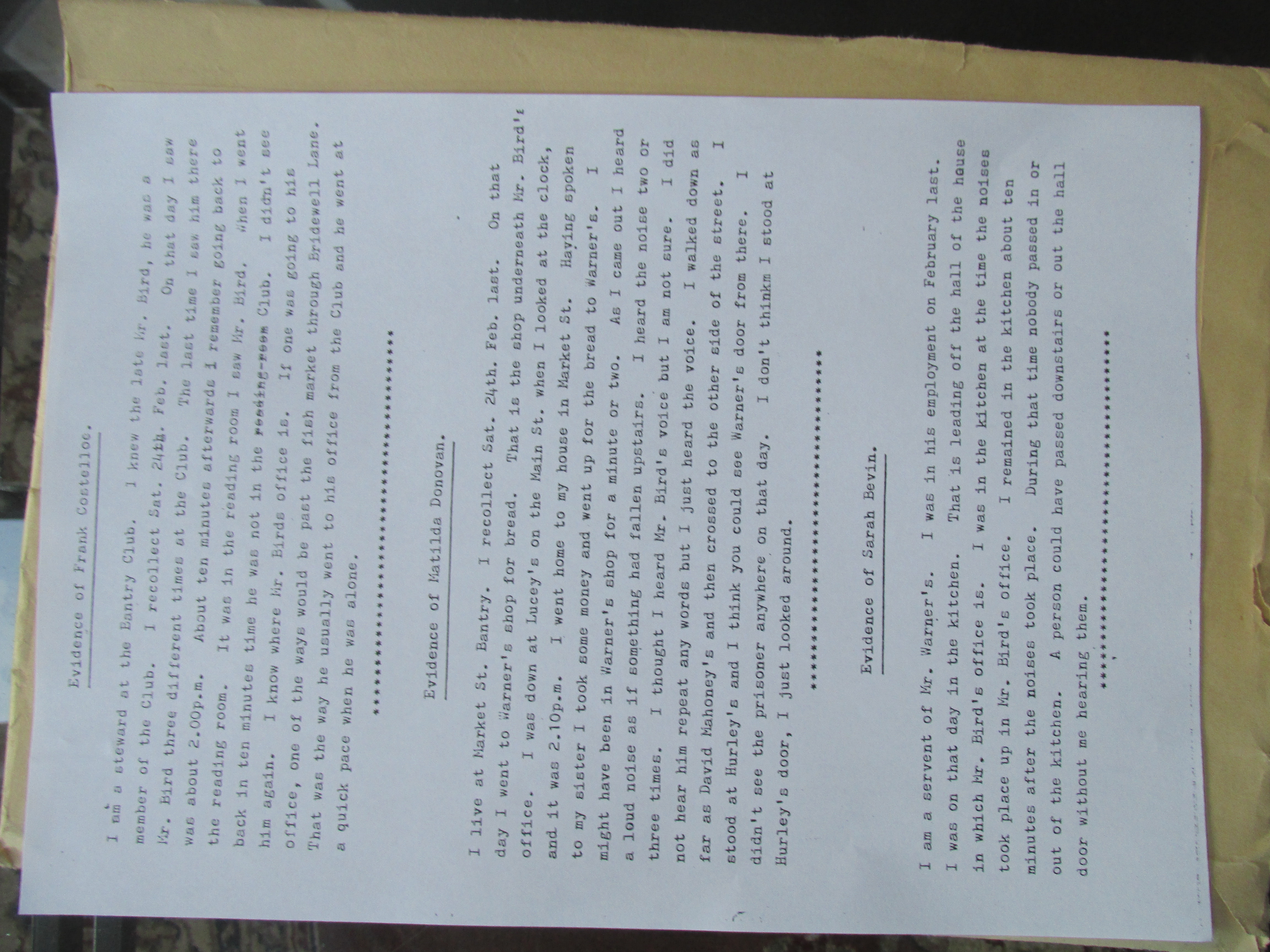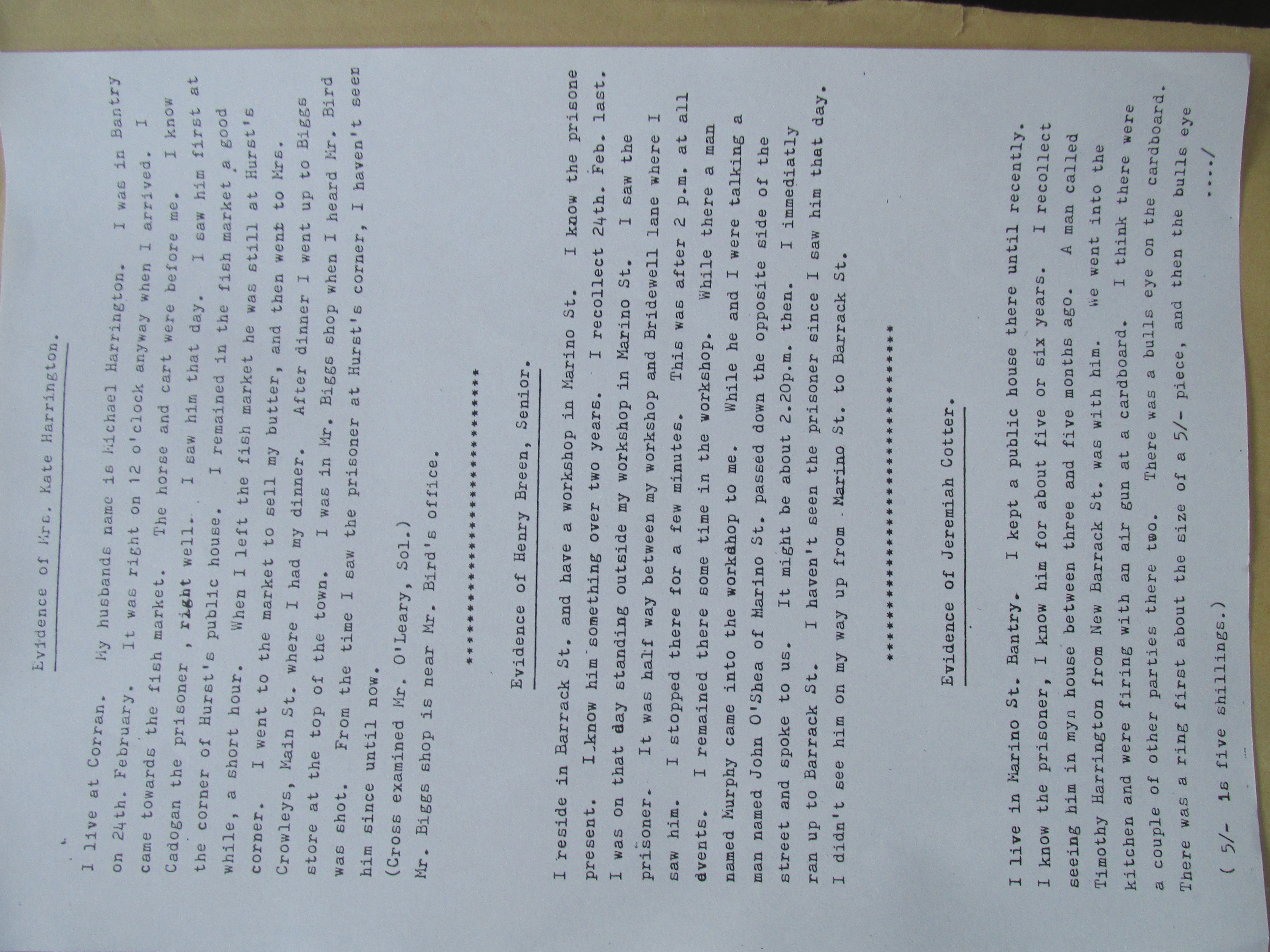 Partial transcript of trial of Tim Cadogan for murder of W.S. Bird, Bantry, West Cork. 1900 and botched Execution. Page 8 is missing.