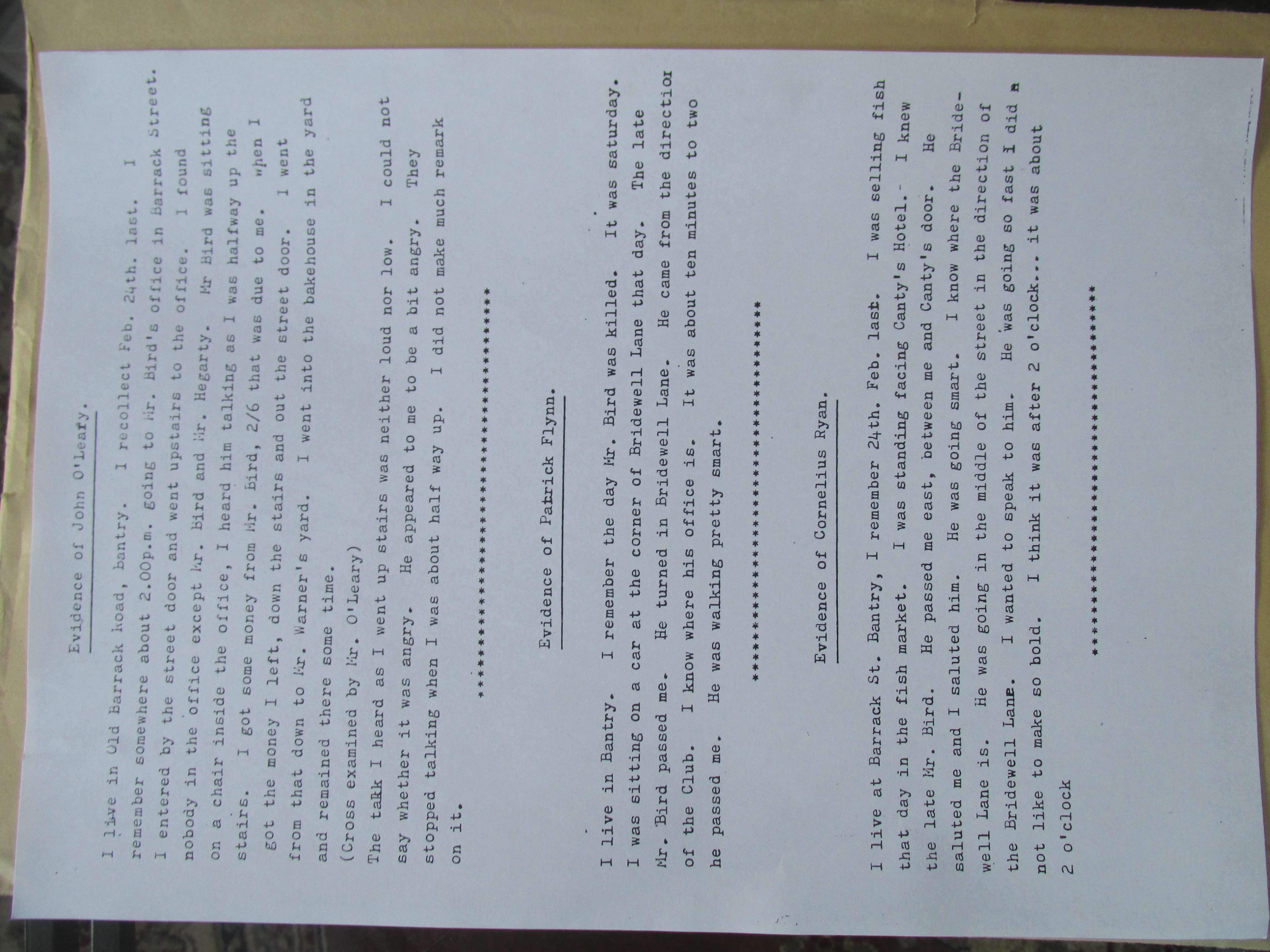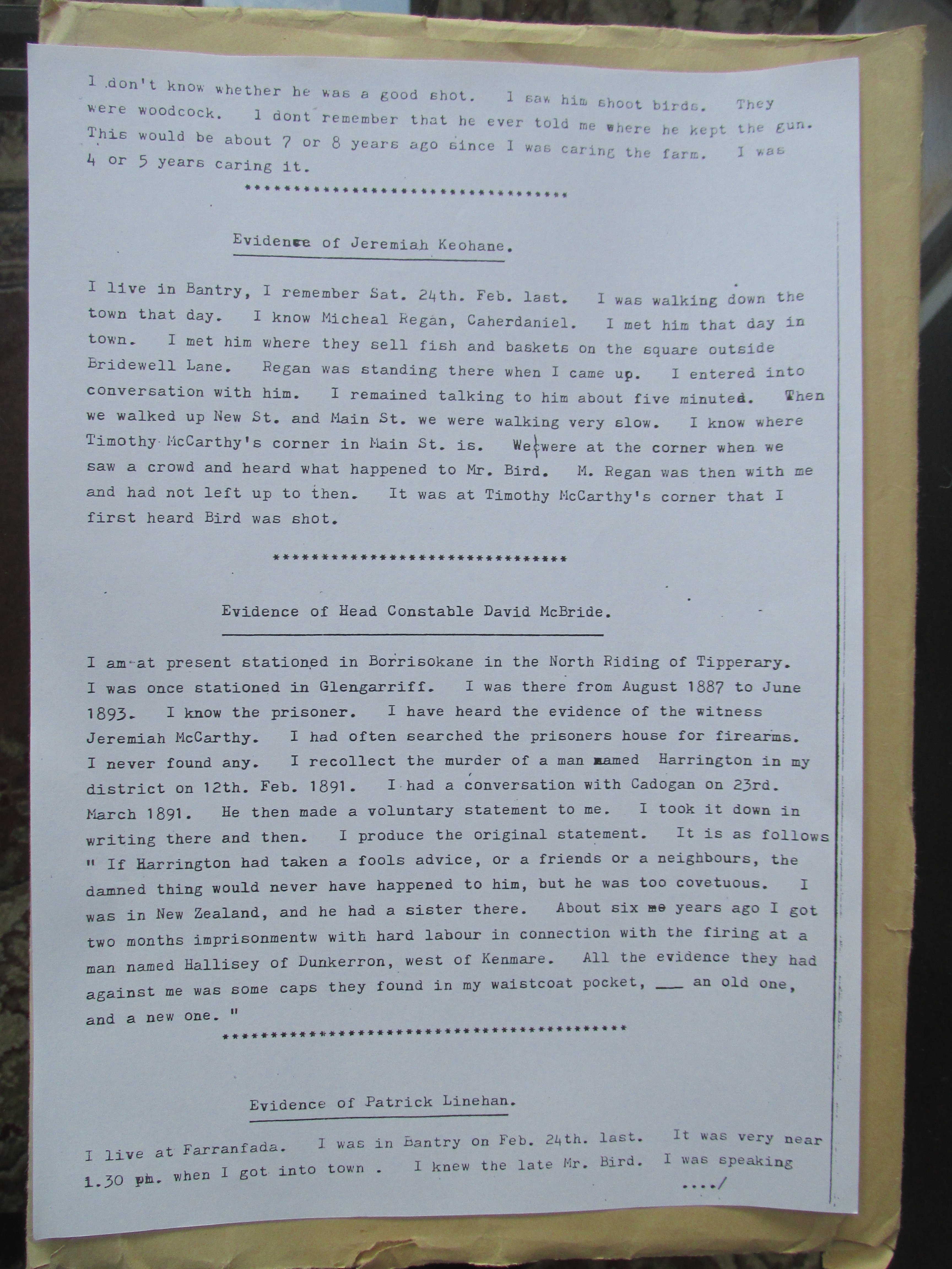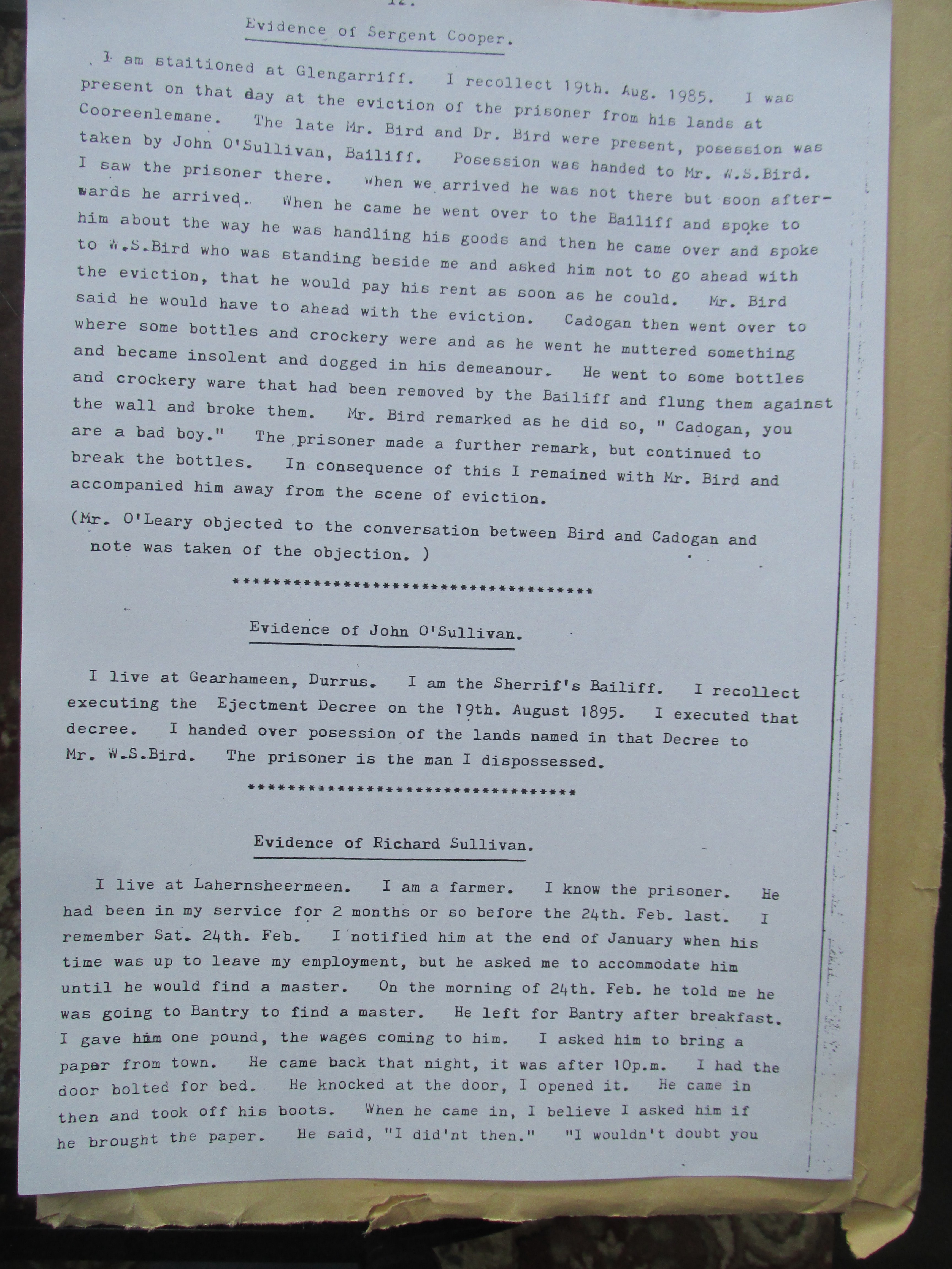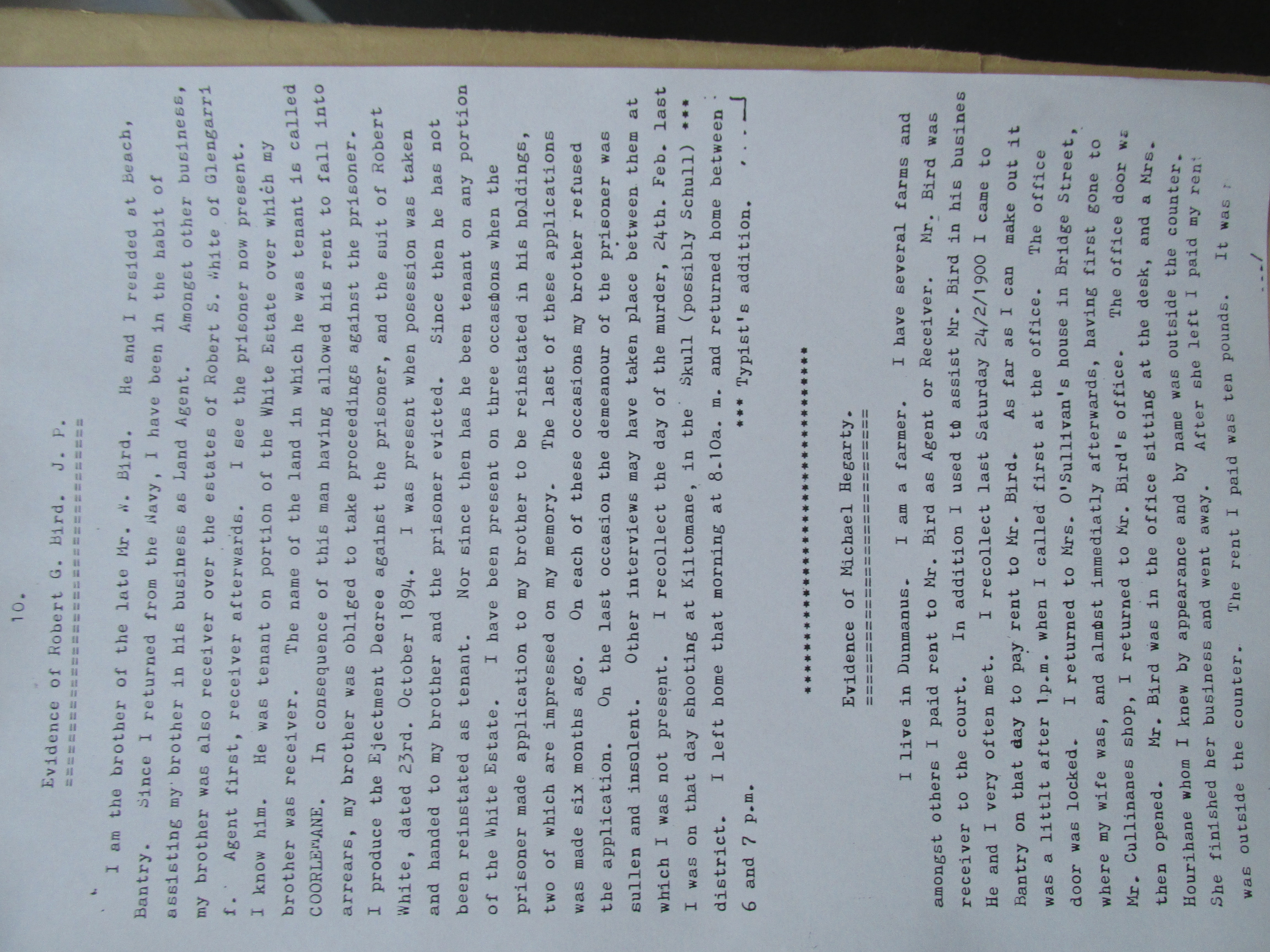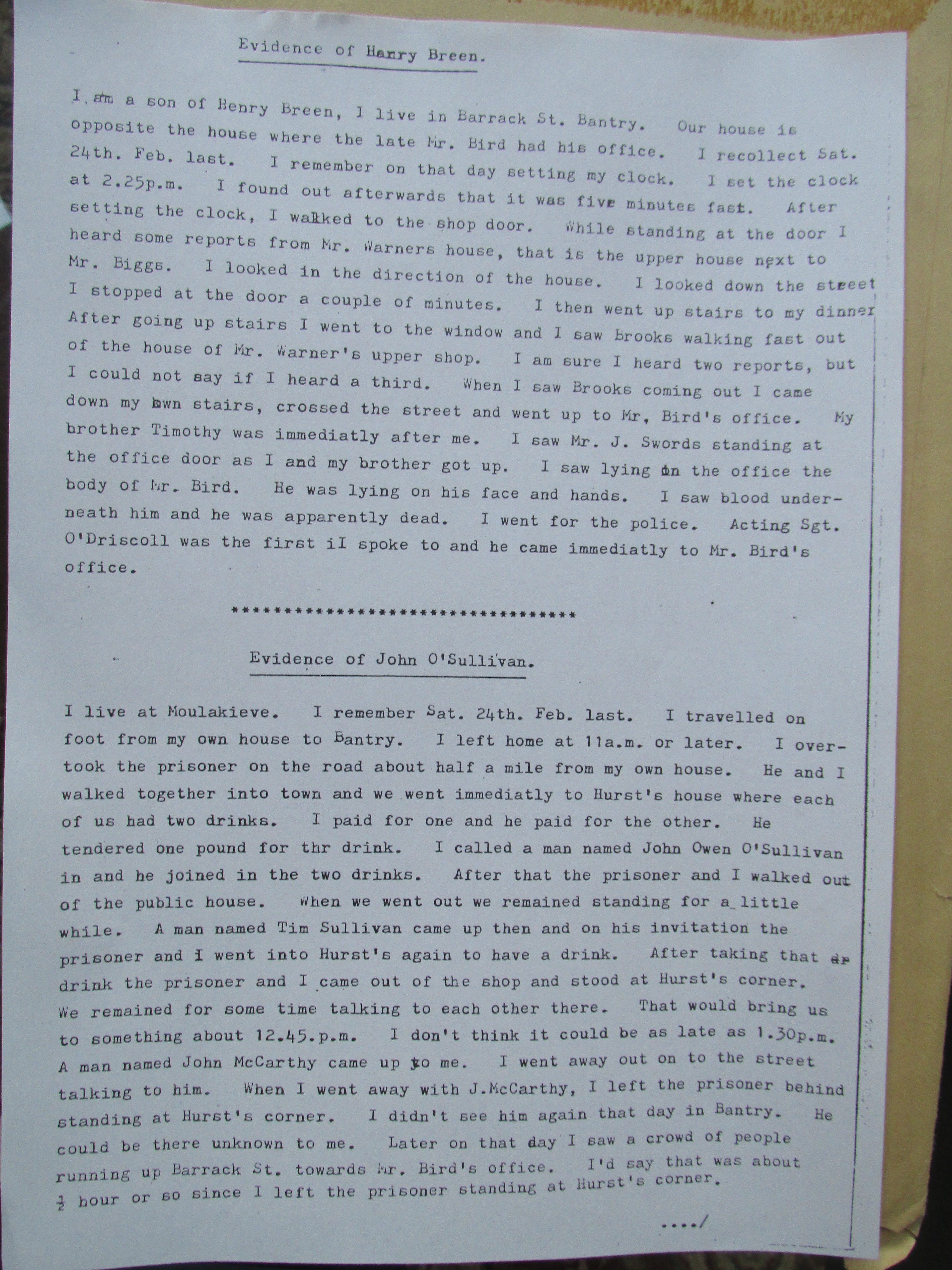 The murder and later trial caused a sensation. Bird was a land agent and one of the estates he managed the White estate of Glengariff, Cadogan was evicted for non payment of rent, despite three requests Bird refused to re instate him. The Brooks mentioned working in Warners was also a Methodist.