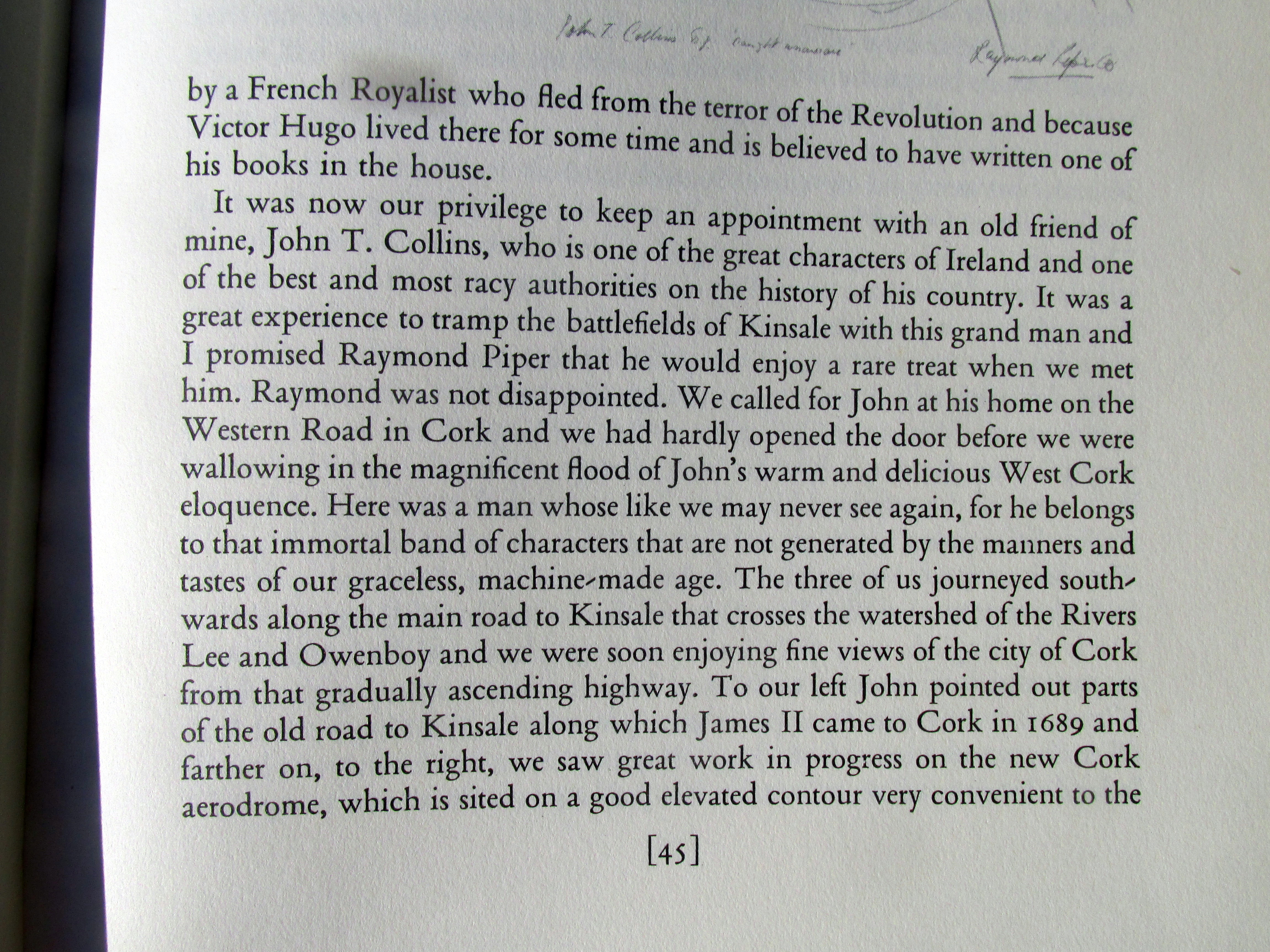 John T Collins was a Cork Historian, he was associated with Paddy O’Keeffe in Bantry, Bernard O’Regan in Aughadown/Skibbereen and Father Walsh in Cork. Extracts of is correspondence with the Paddy O’Keeffe papers in the Cork Archives show a remarkable grasp of Cork History he was a regular newspaper contributor in the 1950s and 1960s.