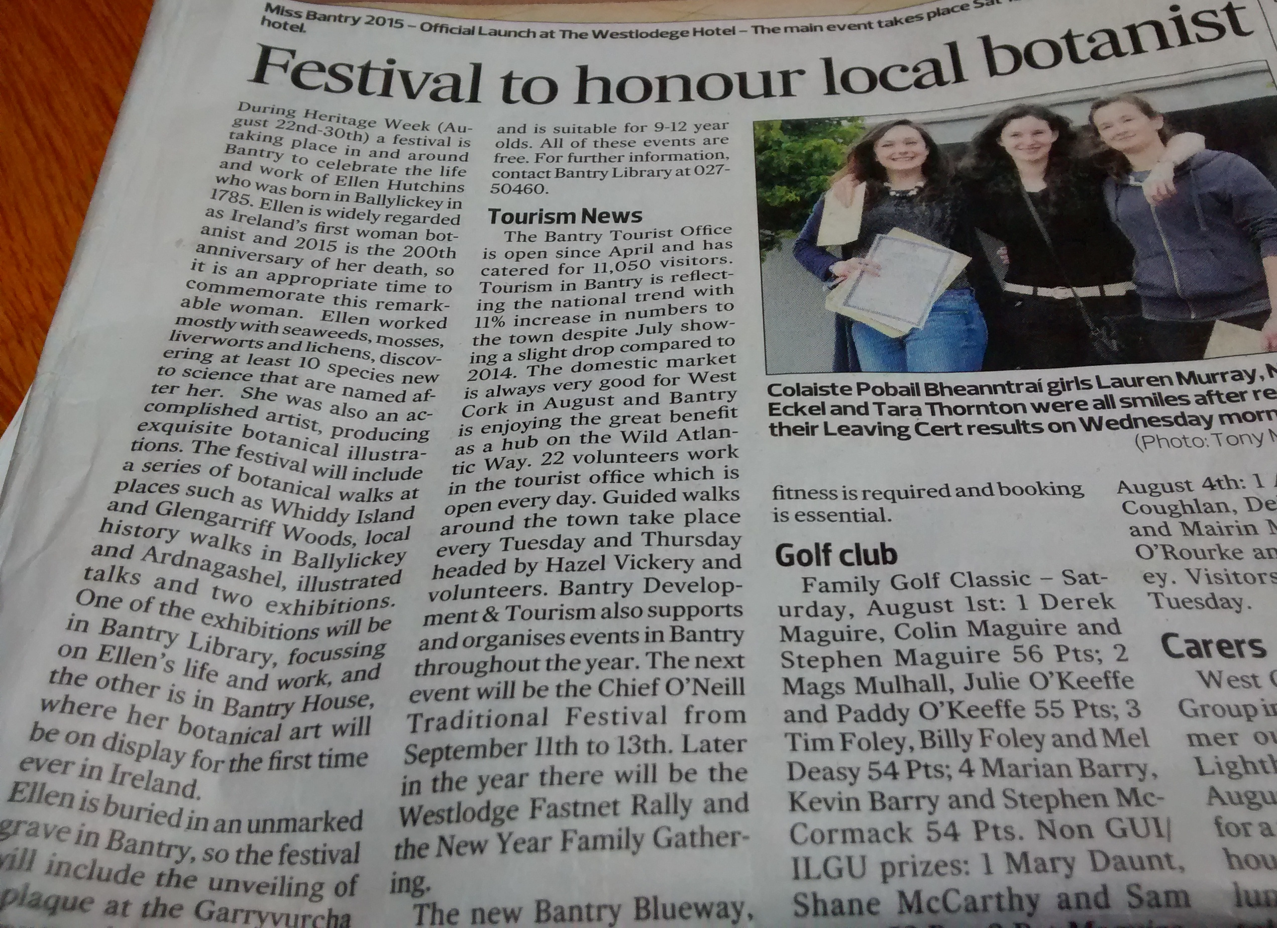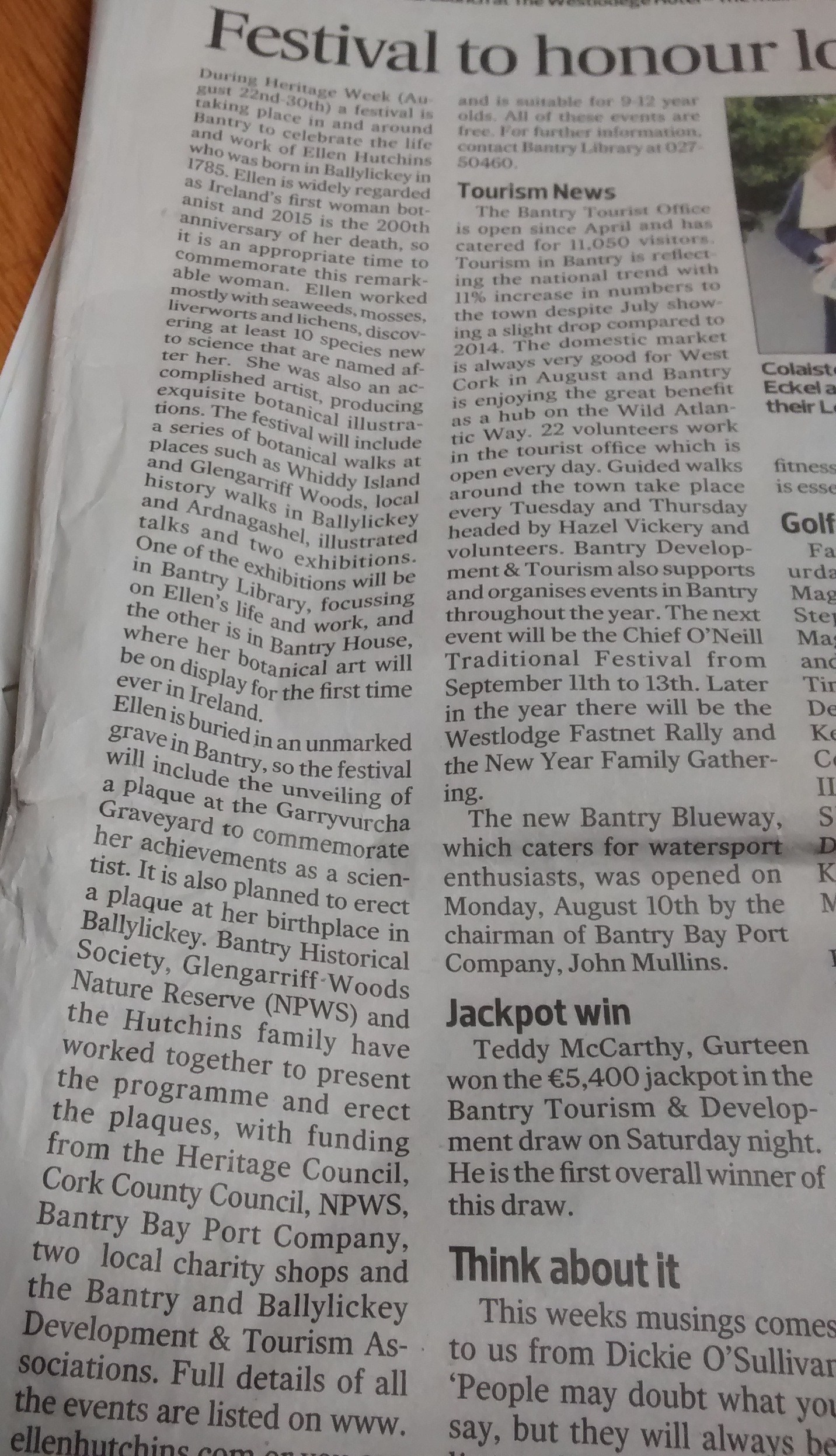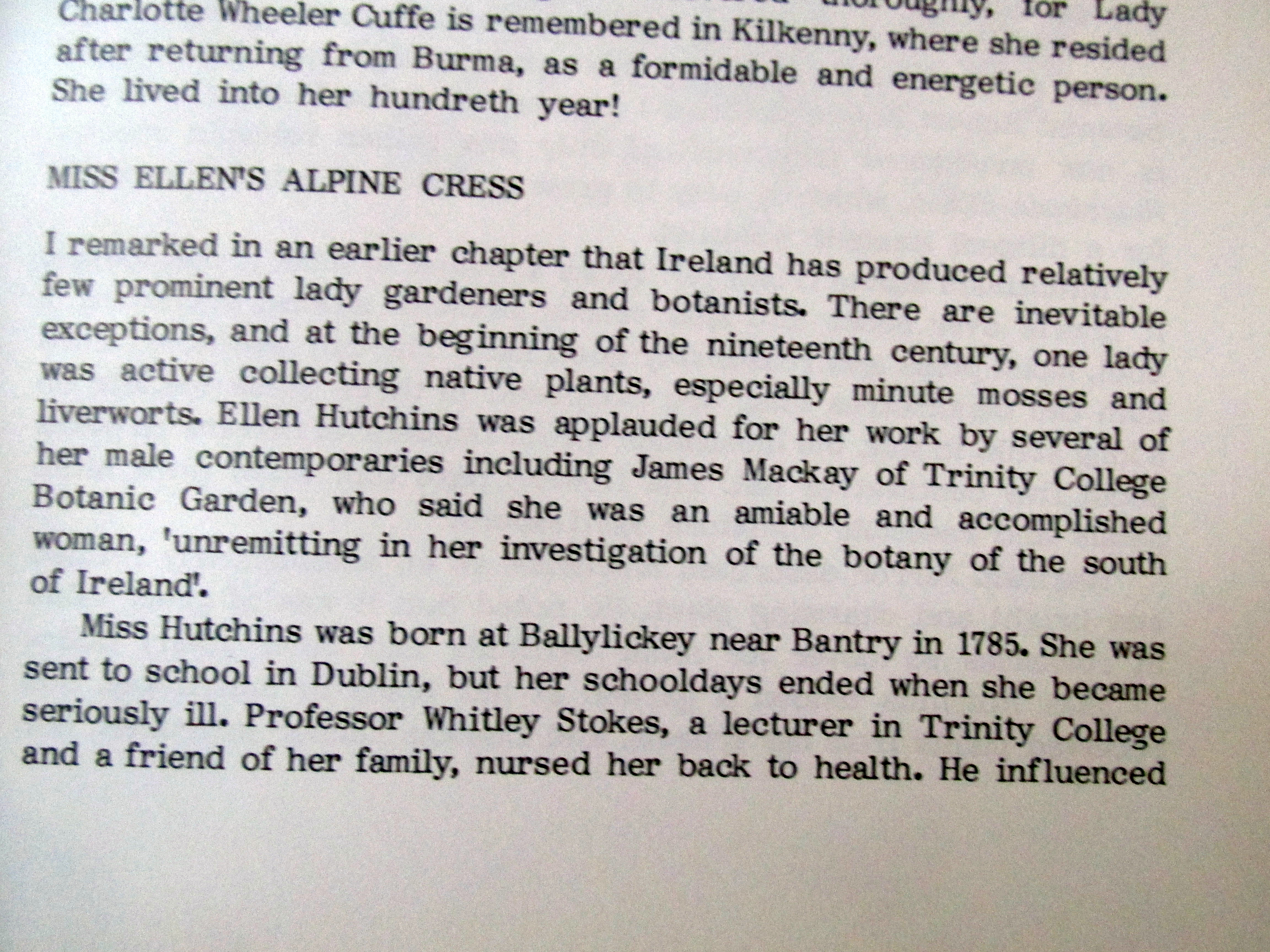 Ellen Hutchins Festival, Bantry, 2015, Tribute to Irish Botanist Ellen Hutchins (1785-1815), Ballylickey, Bantry, West Cork, by Dawson Turner of Yarmouth (1775-1858), ‘In every native of the hill and veil She found attraction, and, where beauty fail’d Applauded odour or commended use Genus ‘Hutchinsia Alpina’ named after her and the Bantry Hutchins family.