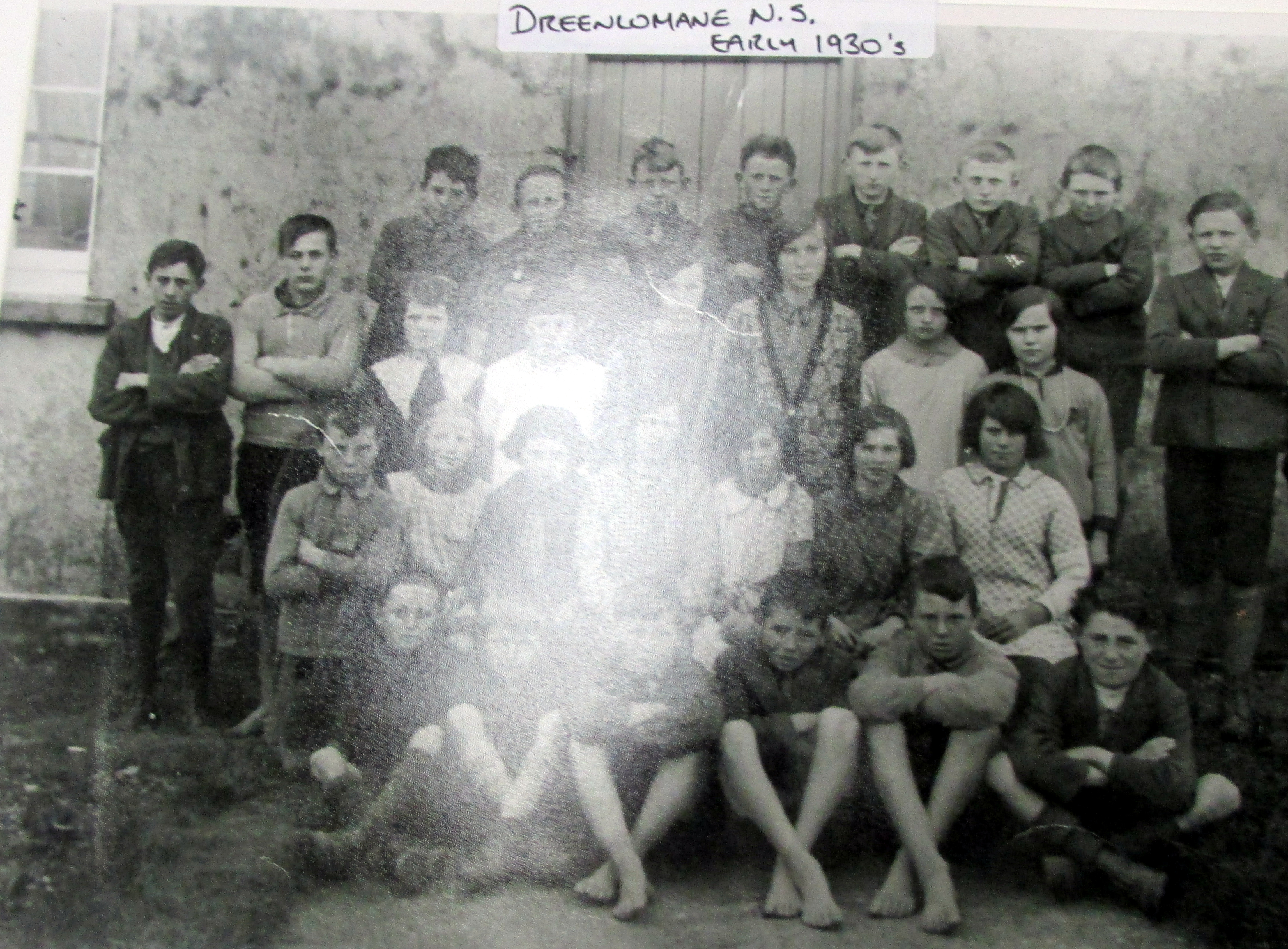 Photo, 1930s and 1955, with names, Dreenlomane, (Doirín na Lomán: Little Oakwood) National School, Ballydehob, West Cork.