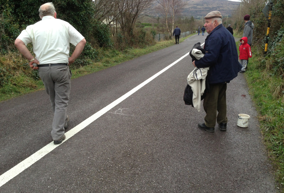 A damp, grey, Sunday afternoon seemed as good a time as any to find out about a strong West Cork tradition – Road Bowling – the title of this post is the Irish for that. I had come across this ancient sport on a previous visit to Ireland and was intrigued. Friends enlightened me that it was a traditional local pastime which has spread to Armagh and, through emigration, to London and the United States – while other versions of the game exist in Holland and Germany. But the county of Cork – and particularly our western part of the county – is its true home.