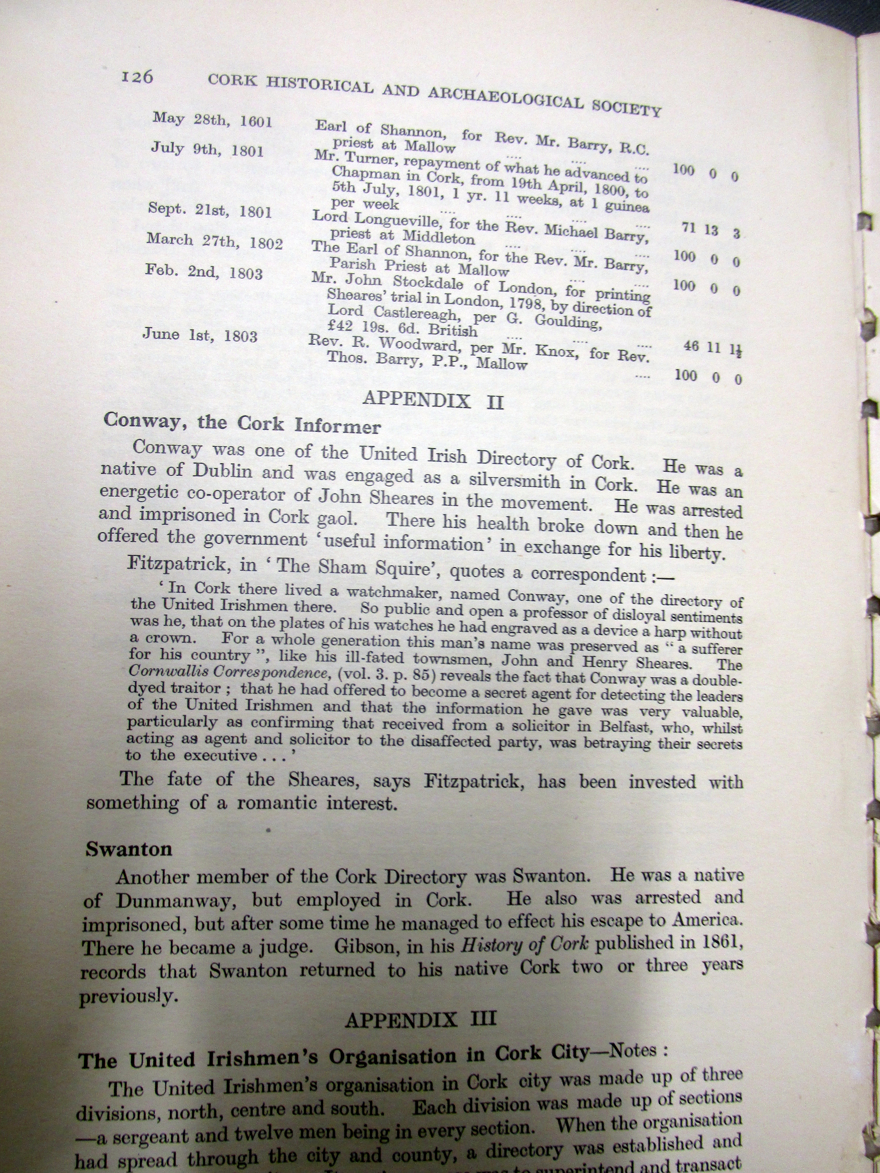 SWANTON, ROBERT – ‘Conway [ see JOHN AND HENRY SHEARES, above] and [ROBERT] SWANTON [1759-1840], both Cork men, were very actively engaged. Conway was a watchmaker, and one of the Directory of Cork. Both he and his friend SWANTON were arrested and sent to Cork jail, where Conway lost his health, and offered the government ‘useful information’ for his liberty.’