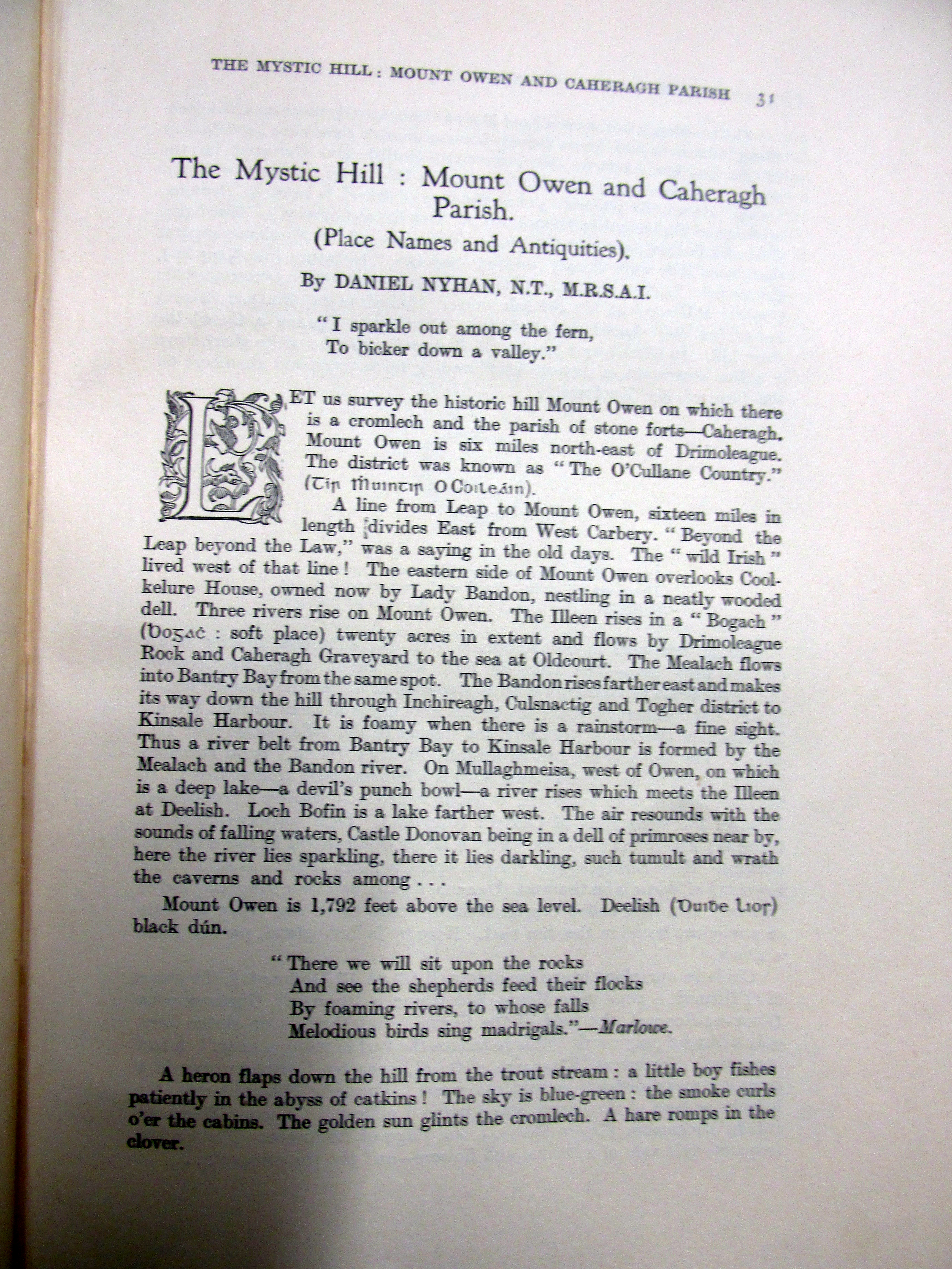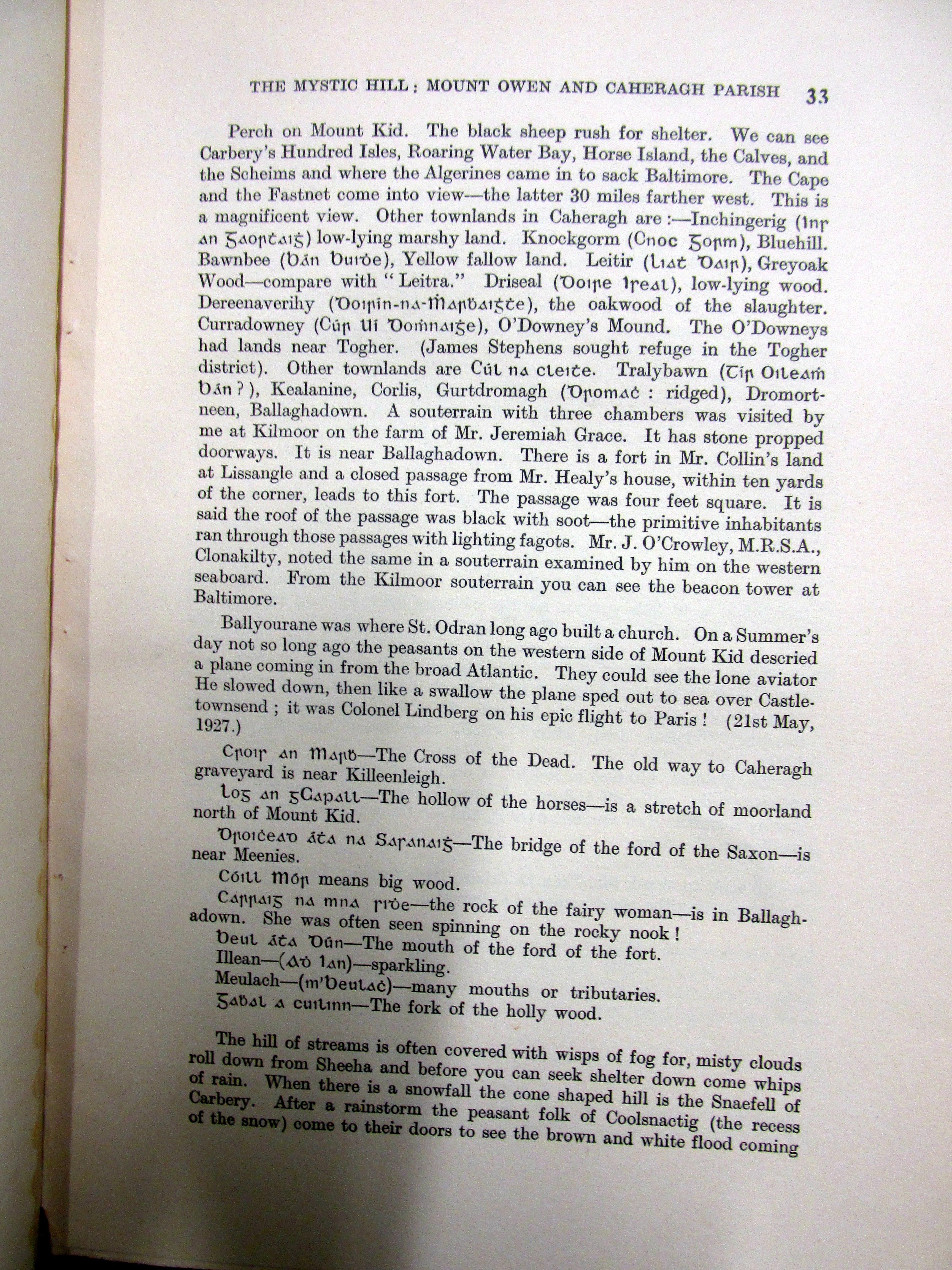 The Mystic Hill of Mount Owen and Caheragh Parish, West Cork, place of origin of Ilen, Bandon and Meelagh Rivers, 21st November 1927 Charles Lindbergh flies over Castletownsend. Article 1932 Daniel Nyhan, National Teacher, Member Royal Society of Antiquarians of Ireland.