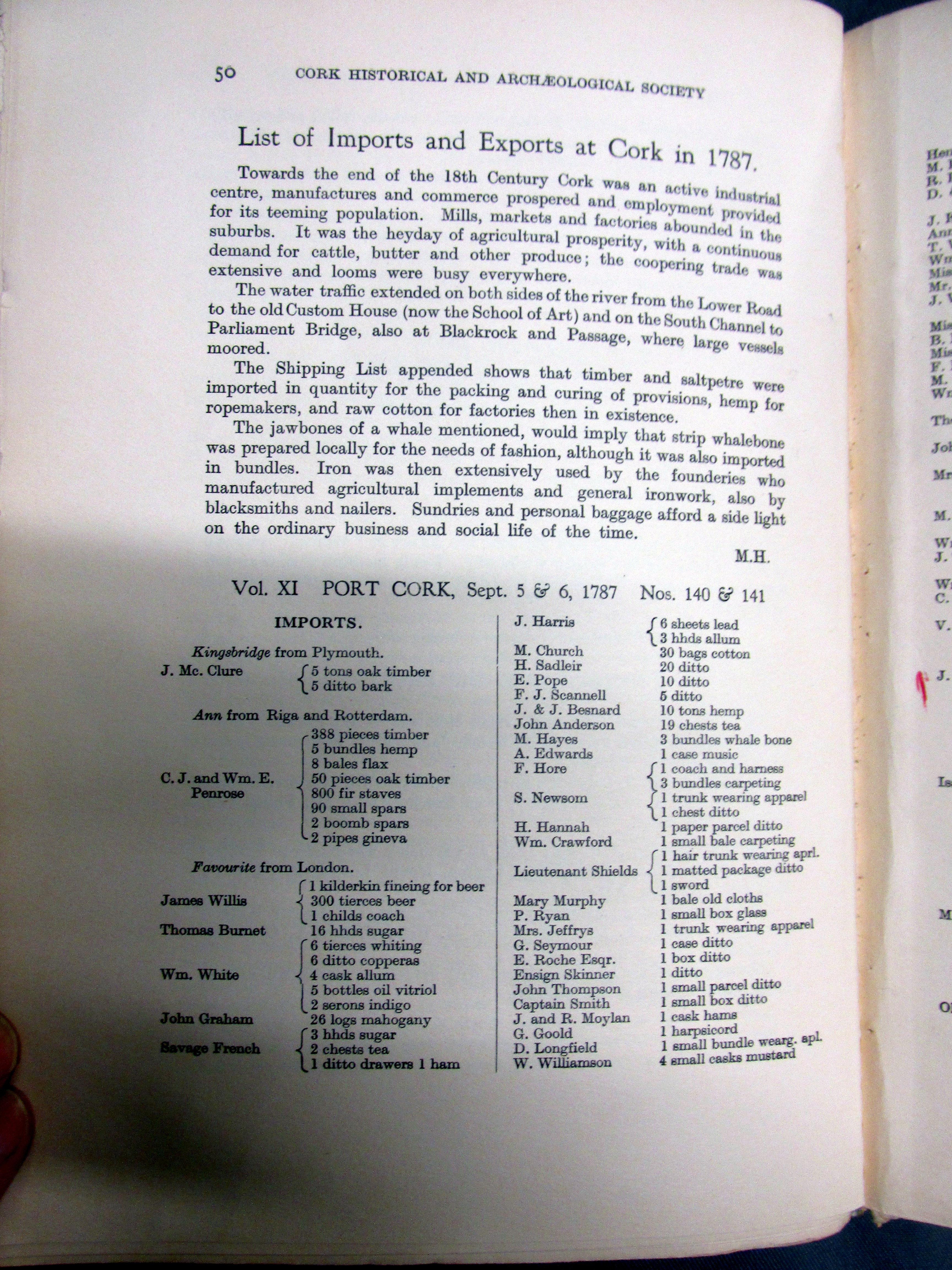 Some Exports and Imports from Cork 1787 merchants and consignees mentioned, Ports involved