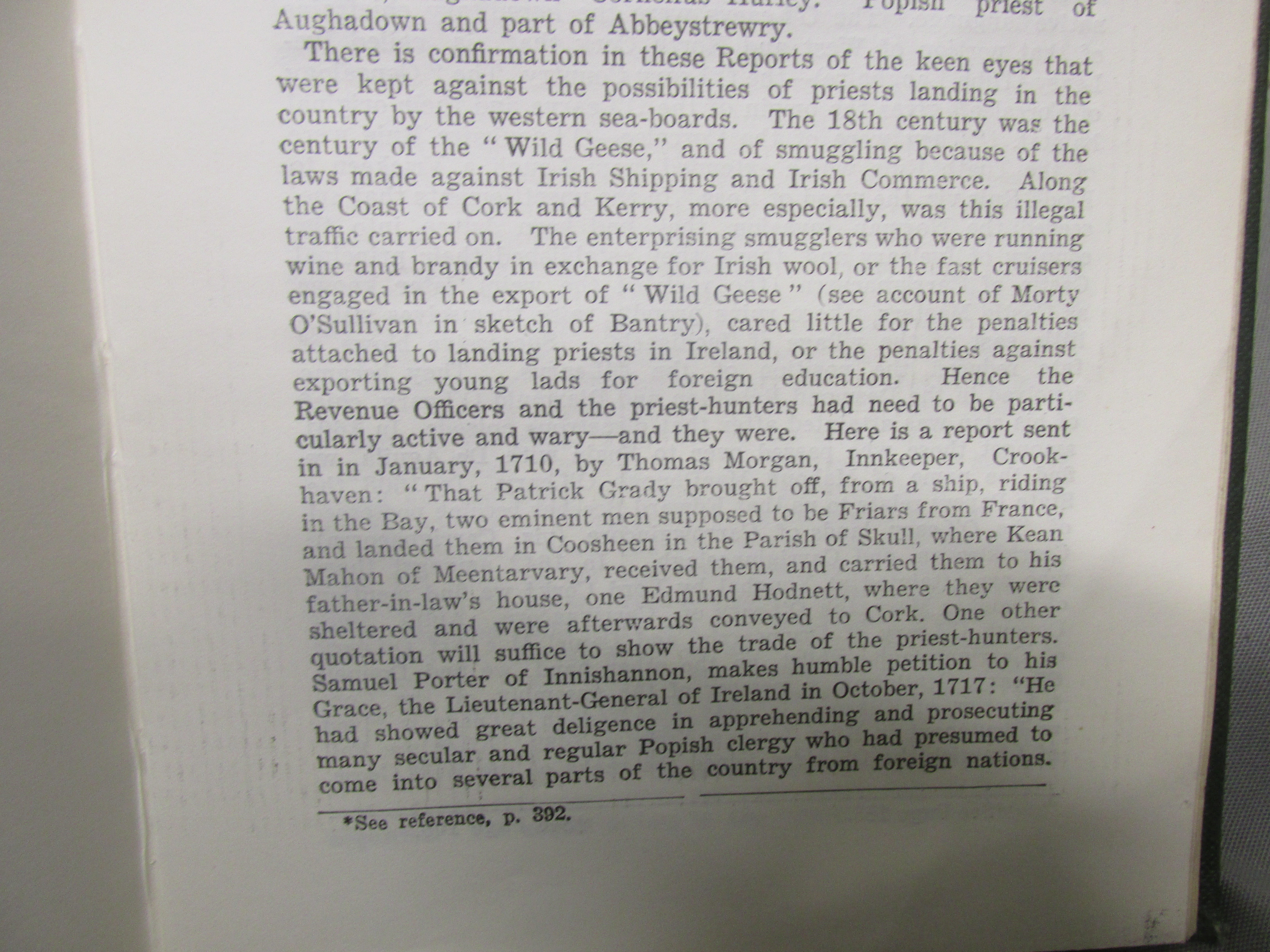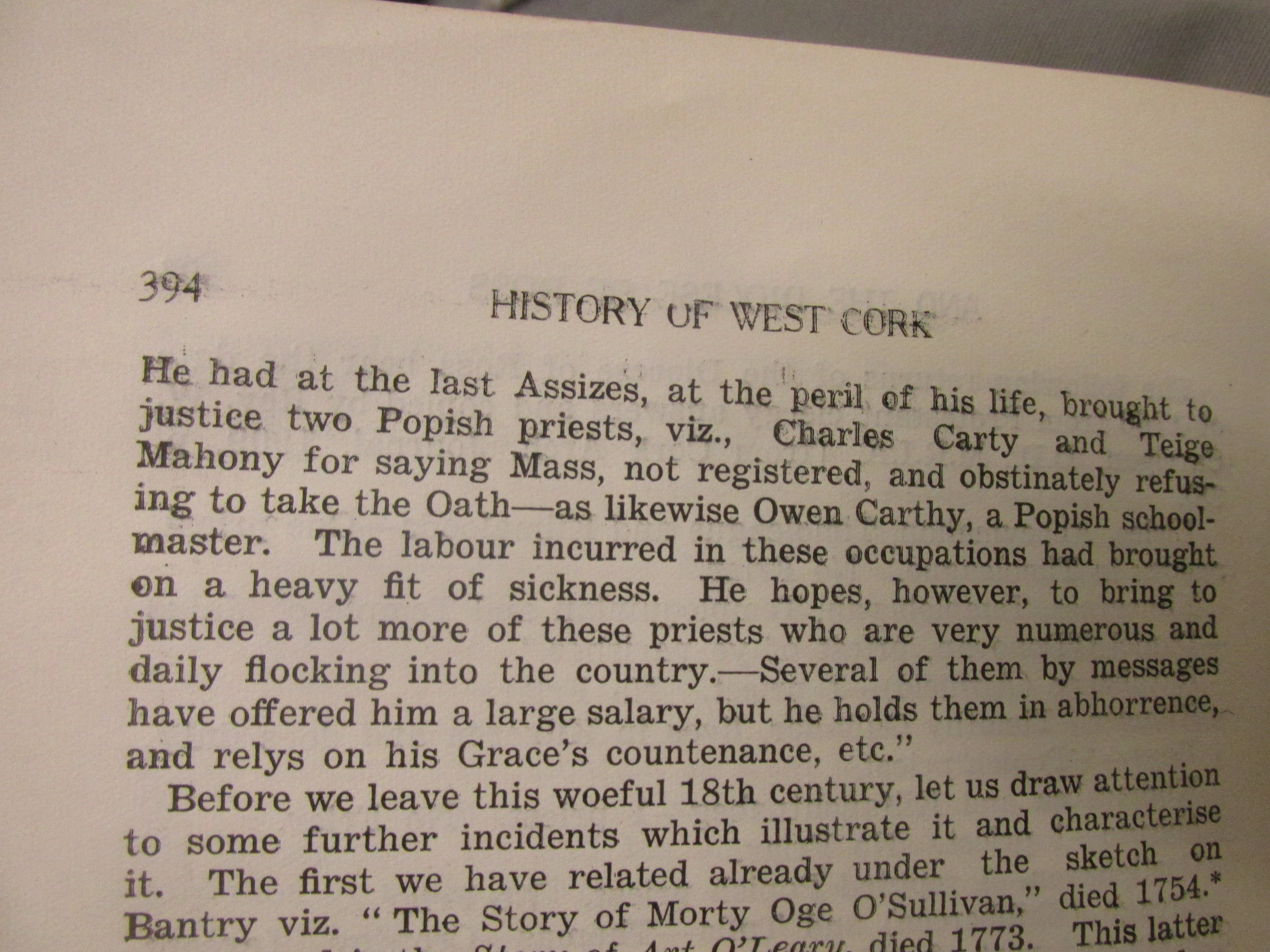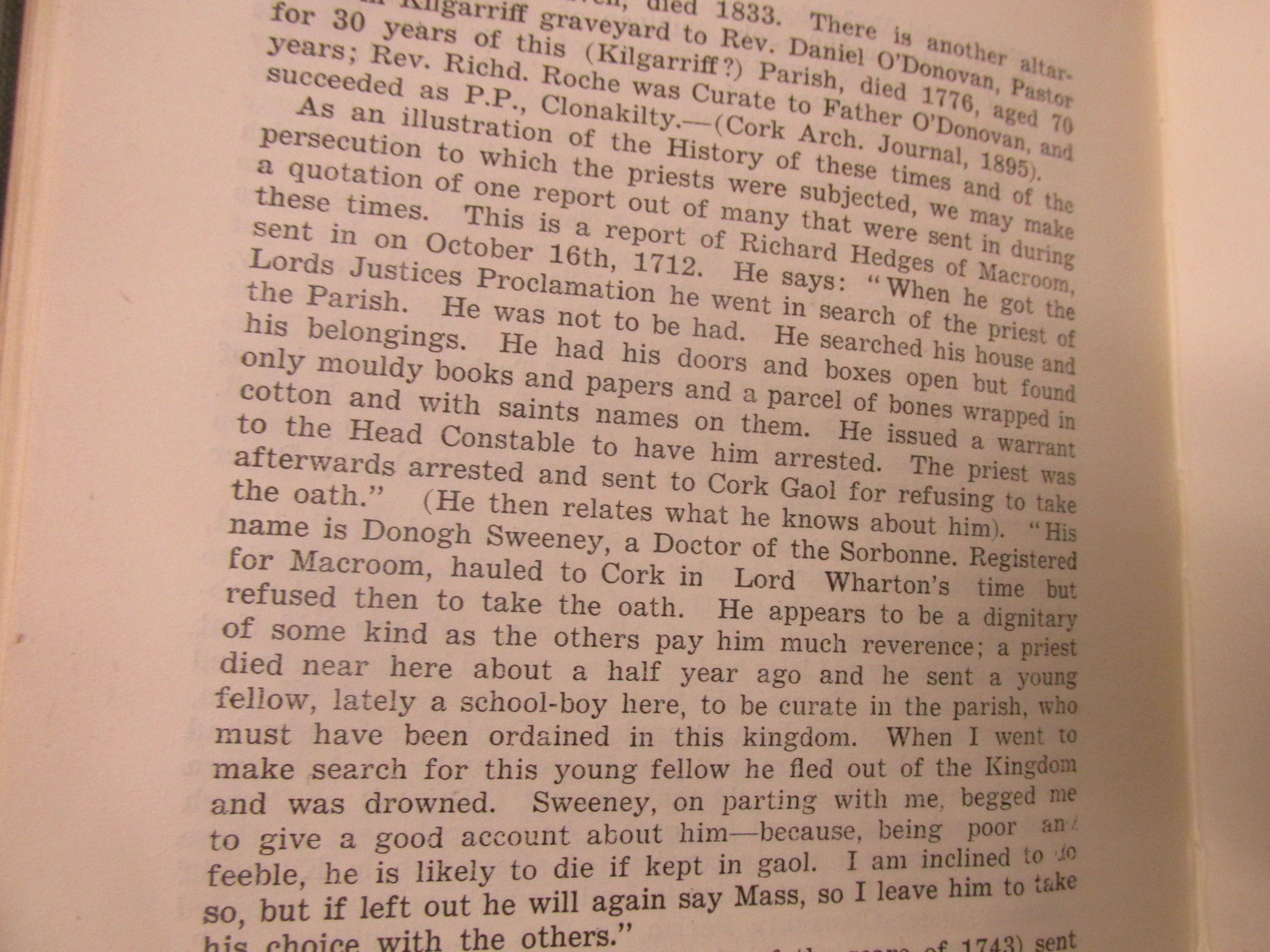 Penal Laws in Co. Cork early 18th century, Father Donogh Sweeney, Doctor of Sorbonne, Paris, , arrested like common criminal for saying Mass by Richard Hedges, Macroom, Warrant 16th October 1712. Petition of 1717 of Samuel Potter Innishannon to Lord Liutenant re ‘Bringing to Justice’ two Popish priests Charles Carthy and Teige Mahony for saying Mass and a Popish Schoolmaster Owen Cartie and who has shown great diligence in apprehending and prosecuting many secular and regular Popish clergy
