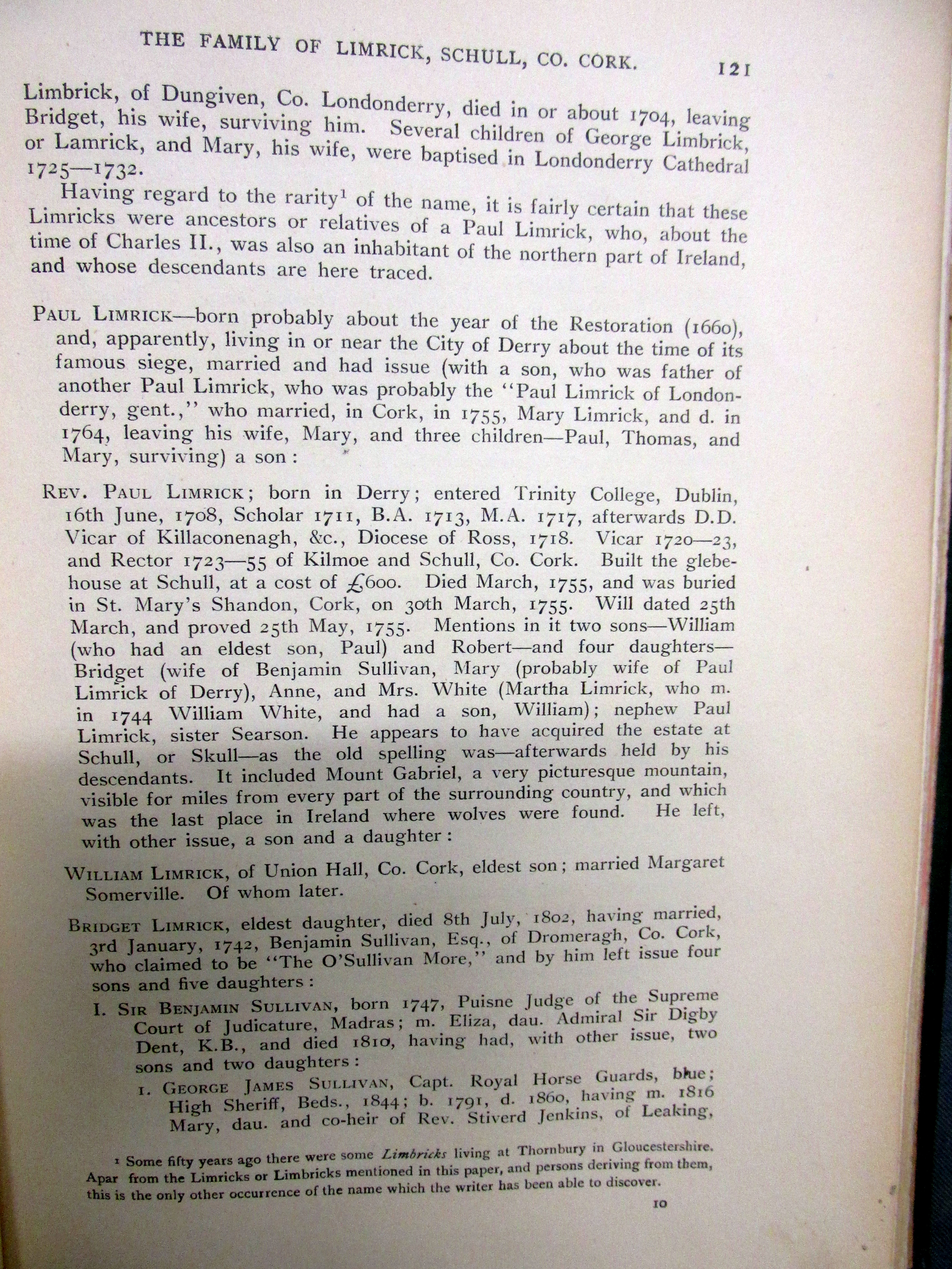 Revised: Genealogy of Limrick family of Schull, West Cork from 1720 with their relations Benjamin Sullivan, (O’Sullivan Mór), Cork, Lawyers, East India Men, MPs