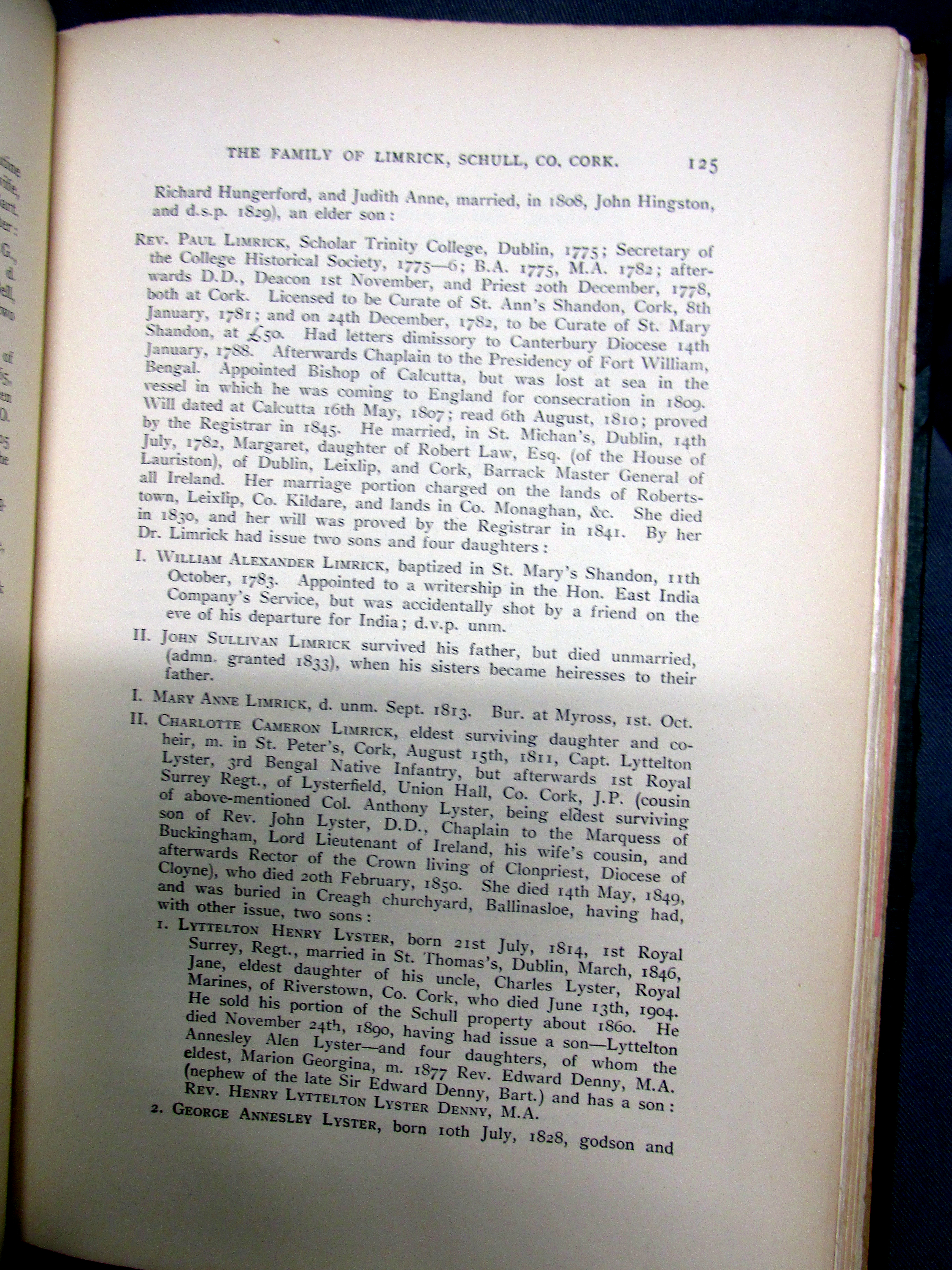 Research by Brian Limrick shows that Colonel Limrick actually had 8 children all born in Cork after his return from India (now aged 50ish), including William, John and Paul plus another son, Thomas Hingston Limrick, and four daughters. Margaret English was mother to John (and was probably mother to all the others but no proof).
