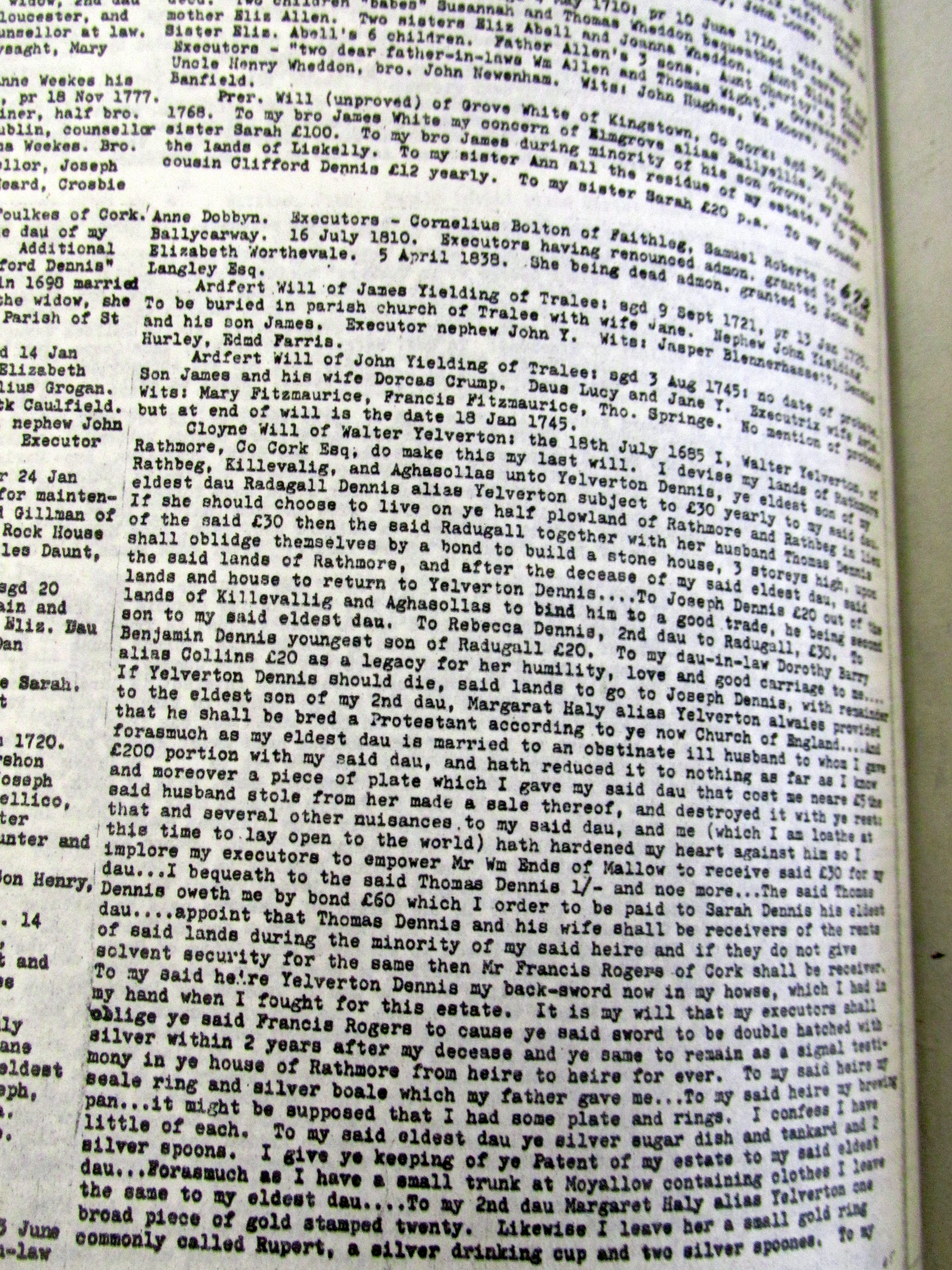Will dated 18th July 1685, William Yelverton, Rathmore, Co. Cork, embittered father of Margaret who married a Hely an ‘obstinate ill husband’ probably a Catholic, exhorts grandson to be ‘bred a Protestant according to the Church of England’
