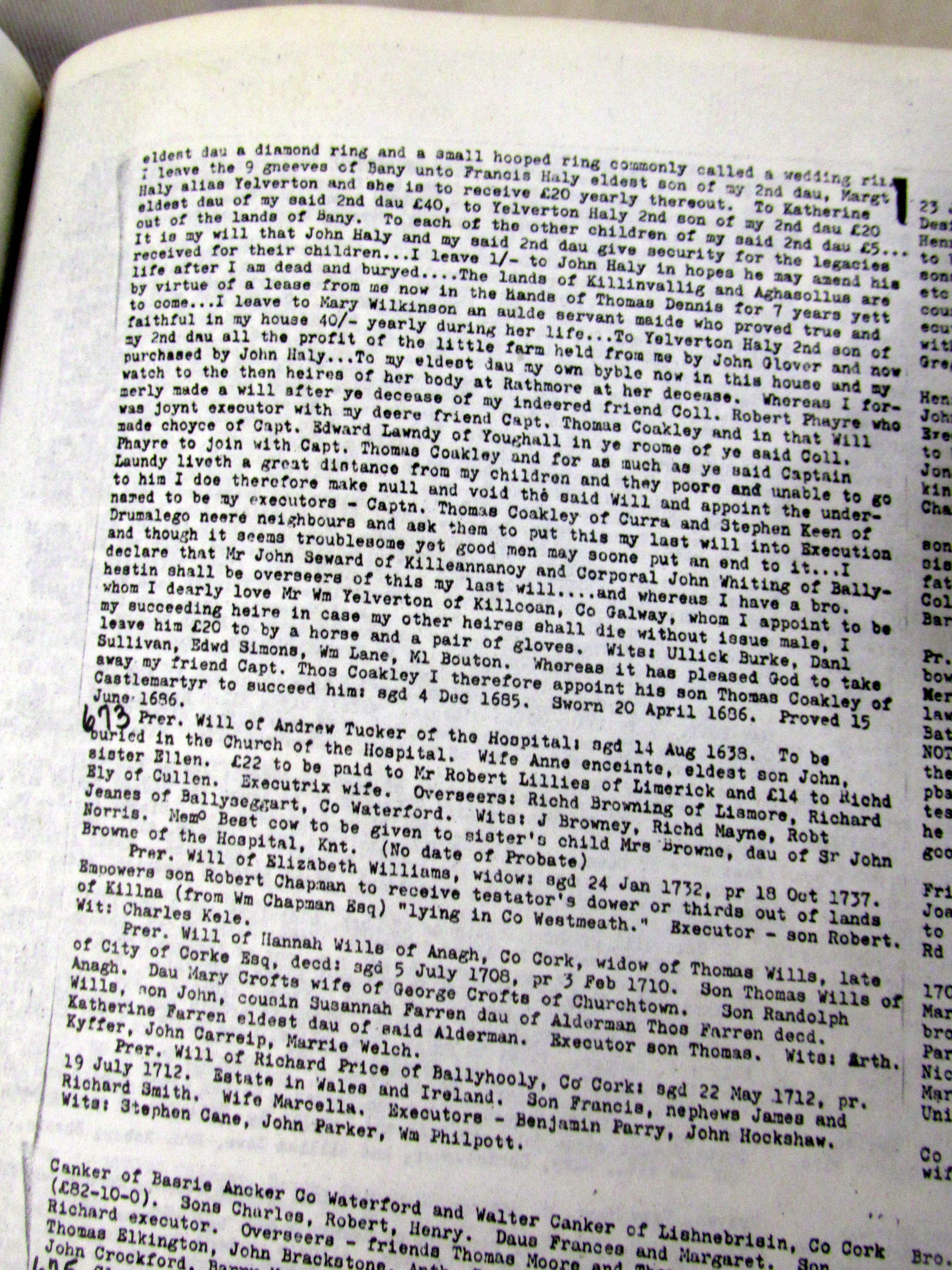 From Welply’s wills in the Casey Collection. An example of the documents destroyed in 1922 Public Records Office copied by William Henry Welply of Ballineen