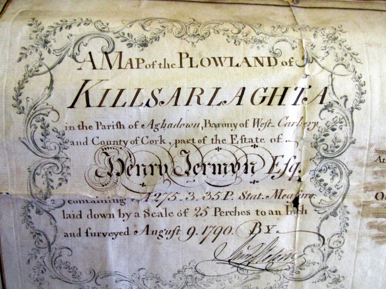 Estate of Henry Jermyn Esq, Aughadown, Skibbereen, West Cork, 1,275 acres, part survey of Killsarlaghta, Aughadown, 1790 by John Molony, Ploughland occupied by Denis Driscoll and Syeey/Gosnell?? 275 acres, showing also Bishop of Cork and Ross holdings at Aughadown, Dromnacaharagh, Upper and Lower Lisheen, Killhilleen, Bawngoree, Whitehall Roaring Water Road, Deed 1788, and Exchequer Bill 1771 from Stephen Warner Lands of 1740, 1710 Deed Warner/Jermyn, Richard Baldwin v Jermyns, Warners, John O’Hea, Deed 1788, and Exchequer Bill 1771 from Stephen Warner Lands at Tullnaeasky, of 1740, Denis Fenn, Various Jermyns, Warners, 1788 Party of Deeds for Minor Children of The O’Donovan, Only child, Catherine, heiress, married Henry Becher Esq., 1805. Party to 1807 pre Marriage Agreement, Elizabeth McCarthy only daughter of Owen, Caheragh to John Woulfe, Coolcrahan