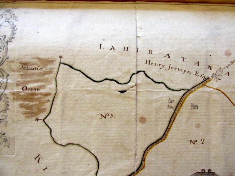 Estate of Henry Jermyn Esq, Aughadown, Skibbereen, West Cork, 1,275 acres, part survey of Killsarlaghta, Aughadown, 1790 by John Molony, Ploughland occupied by Denis Driscoll and Syeey/Gosnell?? 275 acres, showing also Bishop of Cork and Ross holdings at Aughadown, Dromnacaharagh, Upper and Lower Lisheen, Killhilleen, Bawngoree, Whitehall Roaring Water Road, Deed 1788, and Exchequer Bill 1771 from Stephen Warner Lands of 1740, 1710 Deed Warner/Jermyn, Richard Baldwin v Jermyns, Warners, John O’Hea, Deed 1788, and Exchequer Bill 1771 from Stephen Warner Lands at Tullnaeasky, of 1740, Denis Fenn, Various Jermyns, Warners, 1788 Party of Deeds for Minor Children of The O’Donovan, Only child, Catherine, heiress, married Henry Becher Esq., 1805. Party to 1807 pre Marriage Agreement, Elizabeth McCarthy only daughter of Owen, Caheragh to John Woulfe, Coolcrahan