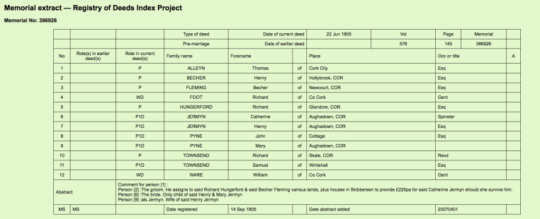 Estate of Henry Jermyn Esq, Aughadown, Skibbereen, West Cork, 1,275 acres, part survey of Killsarlaghta, Aughadown, 1790 by John Molony, Ploughland occupied by Denis Driscoll and Syeey/Gosnell?? 275 acres, showing also Bishop of Cork and Ross holdings at Aughadown, Dromnacaharagh, Upper and Lower Lisheen, Killhilleen, Bawngoree, Whitehall Roaring Water Road, Deed 1788, and Exchequer Bill 1771 from Stephen Warner Lands of 1740, 1710 Deed Warner/Jermyn, Richard Baldwin v Jermyns, Warners, John O’Hea, Deed 1788, and Exchequer Bill 1771 from Stephen Warner Lands at Tullnaeasky, of 1740, Denis Fenn, Various Jermyns, Warners, 1788 Party of Deeds for Minor Children of The O’Donovan, Only child, Catherine, heiress, married Henry Becher Esq., 1805. Party to 1807 pre Marriage Agreement, Elizabeth McCarthy only daughter of Owen, Caheragh to John Woulfe, Coolcrahan