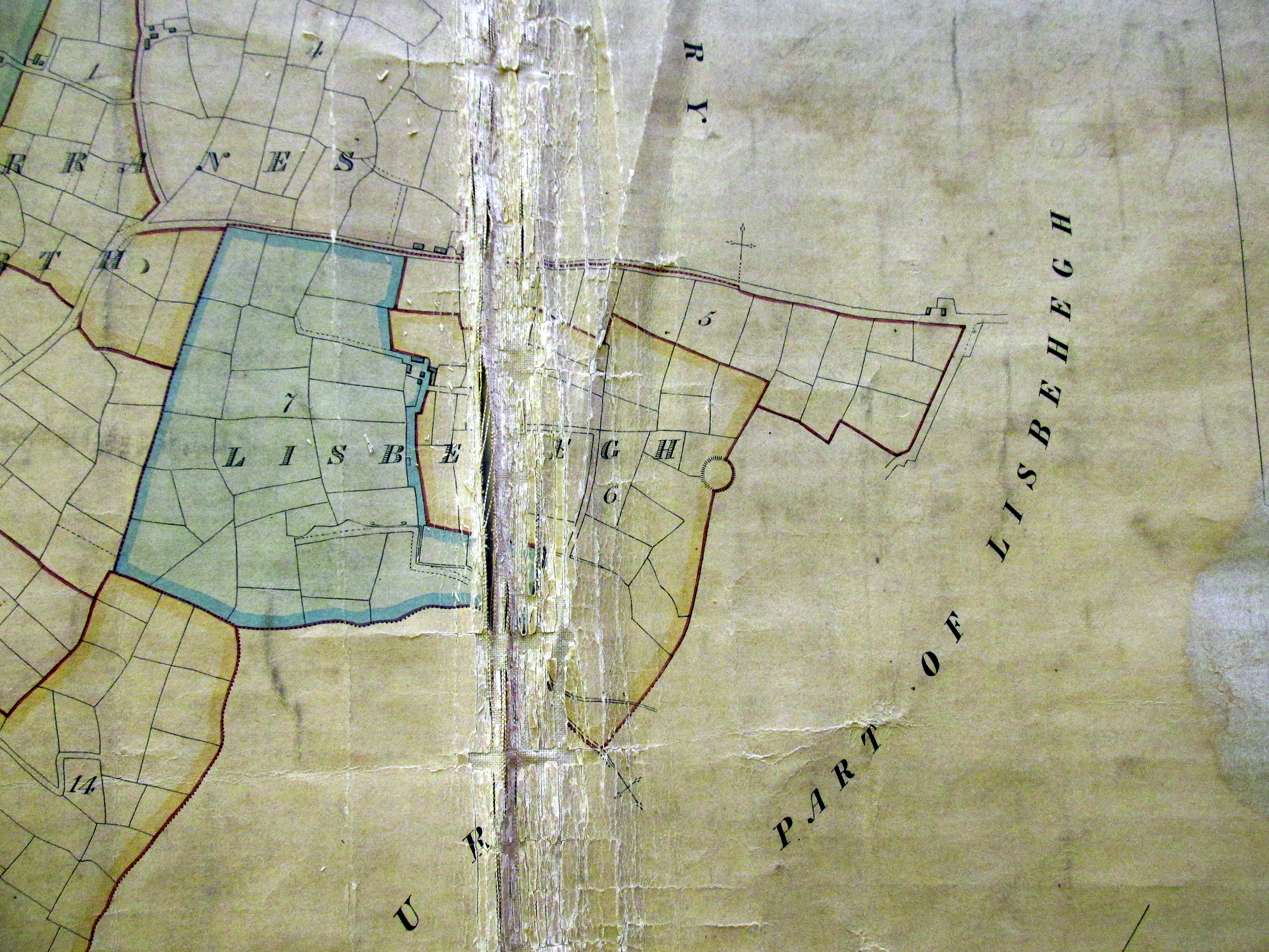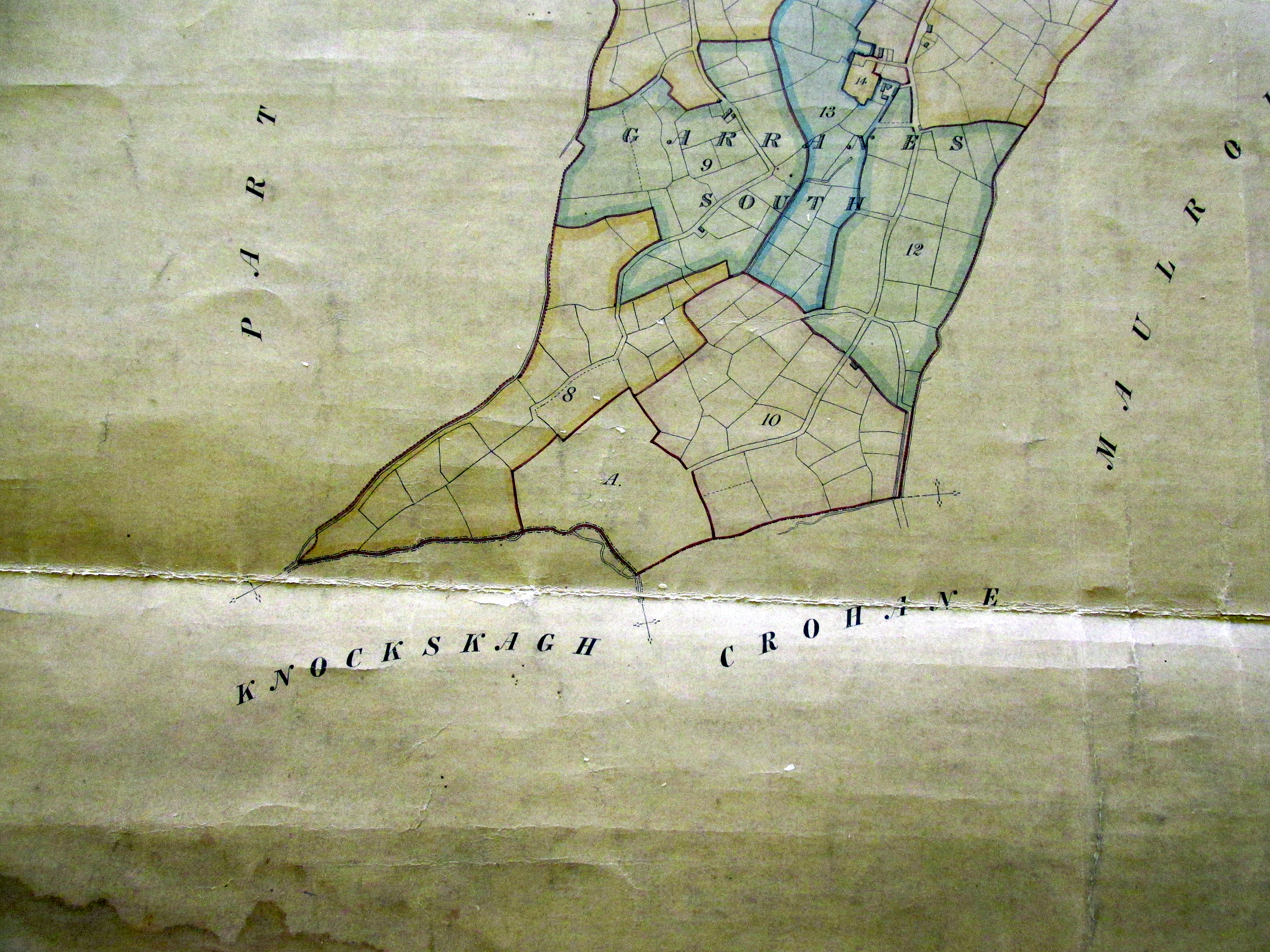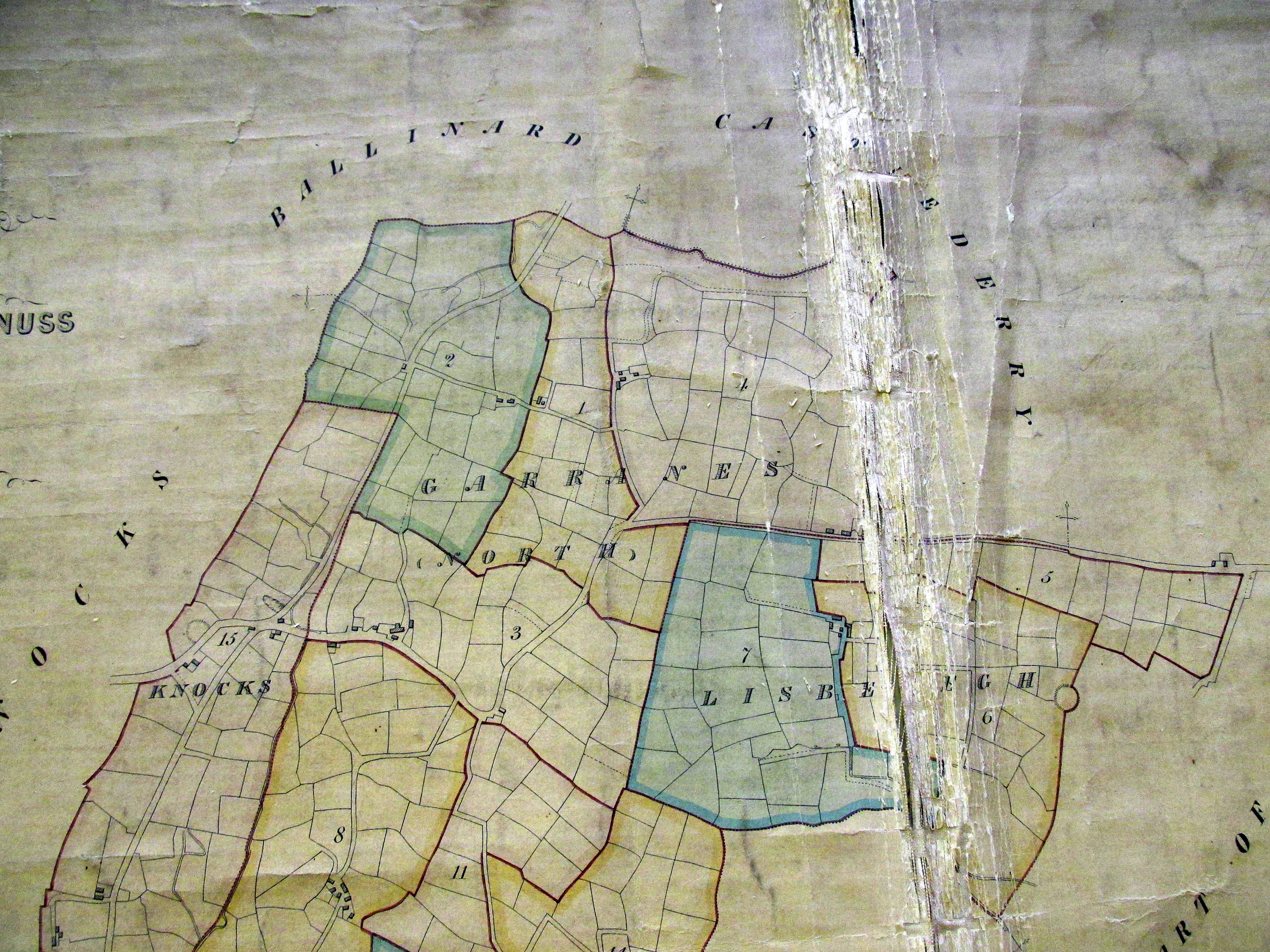 Map of Estate at Carrans part of Knocks, Lisbehegh, Knocknauss, Tenants names and size of holding given for Charles Henry, George Frederick, and John Edward Woodroff Esquires, Parish Desertserges, Barony East Carbery, East Division, executed by Frederick A. Klein, Civil Engineer, 21 South Mall, Cork, 1st January 1866, Townlands mentioned Teadies Kilmoyfergne North, Maulnarougha South, Lisnavnng, Lisbehegh, Castlederry, Ballinard, Garrranes North, Knockskagh, Crohane Henry, George, by Teadies Lower, Derrymeleen, Kilnamela, Farranasheshery.