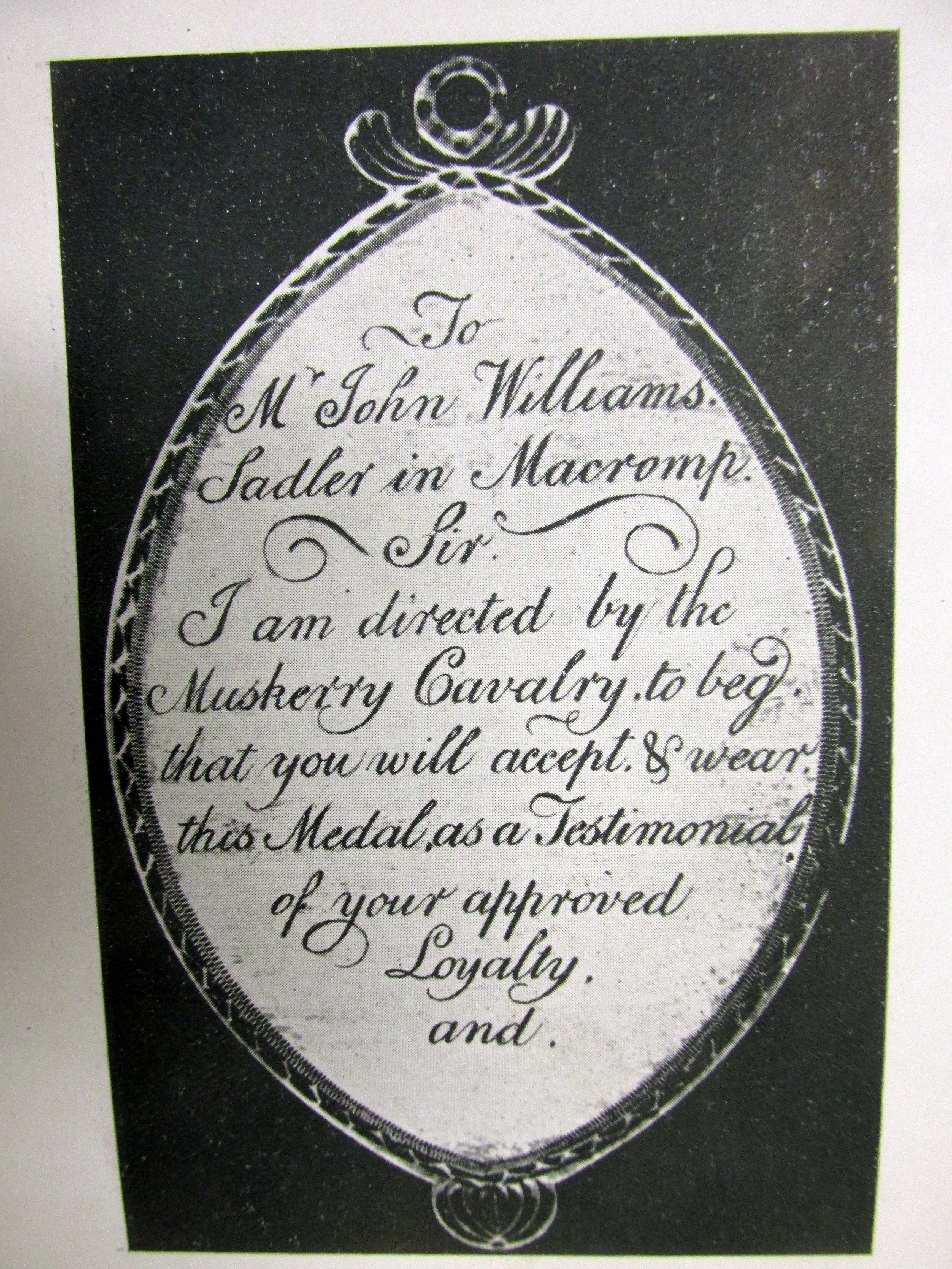 Medal for John Williams, Sadler, Macromp (Macroom), Co. Cork,for Loyalty and protection of Macromp Town and Vicinity signed by John Colthurst, 4th June 1798.