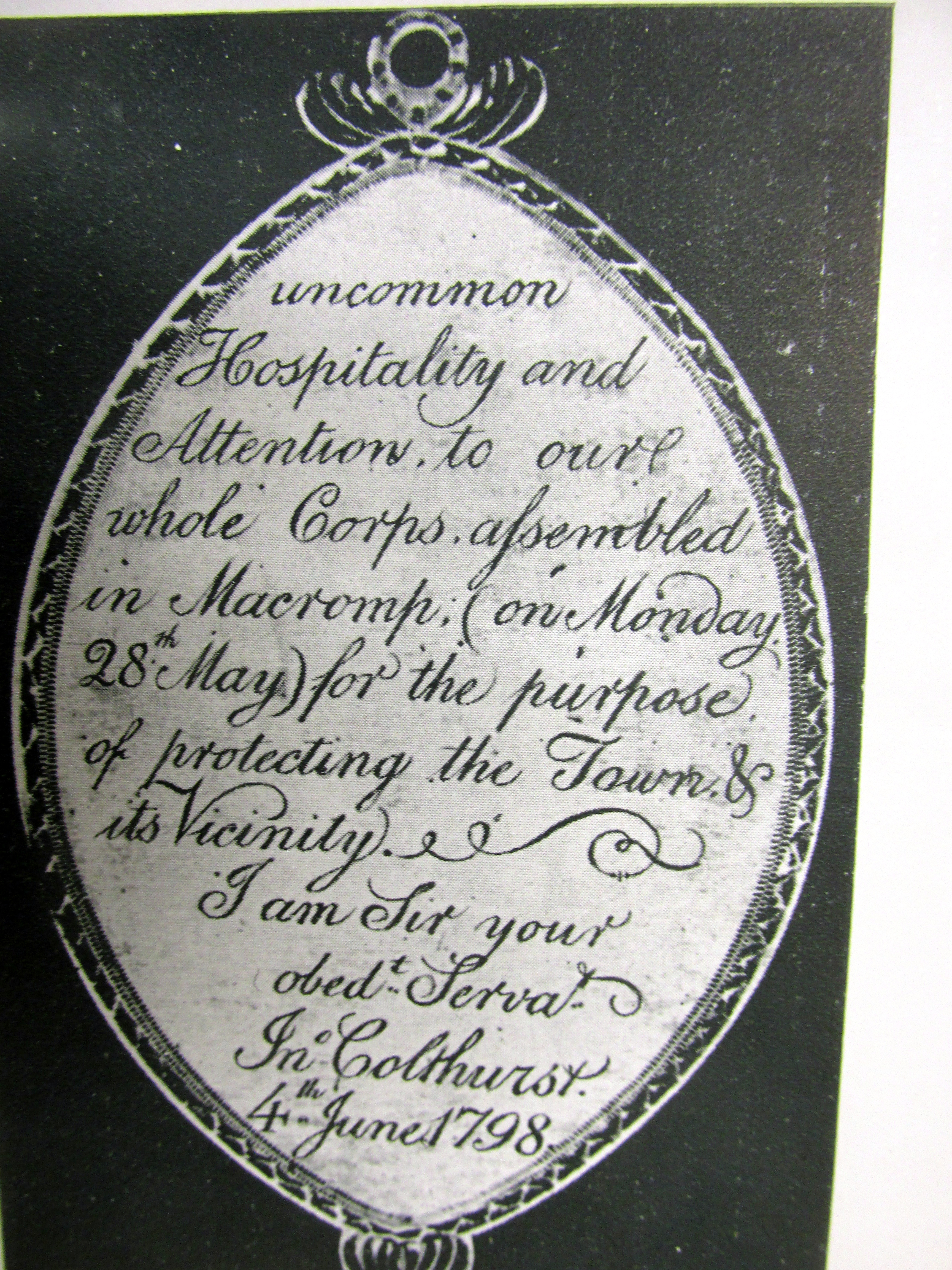 Medal for John Williams, Sadler, Macromp (Macroom), Co. Cork, for Loyalty and protection of Macromp Town and Vicinity signed by John Colthurst, 4th June 1798.