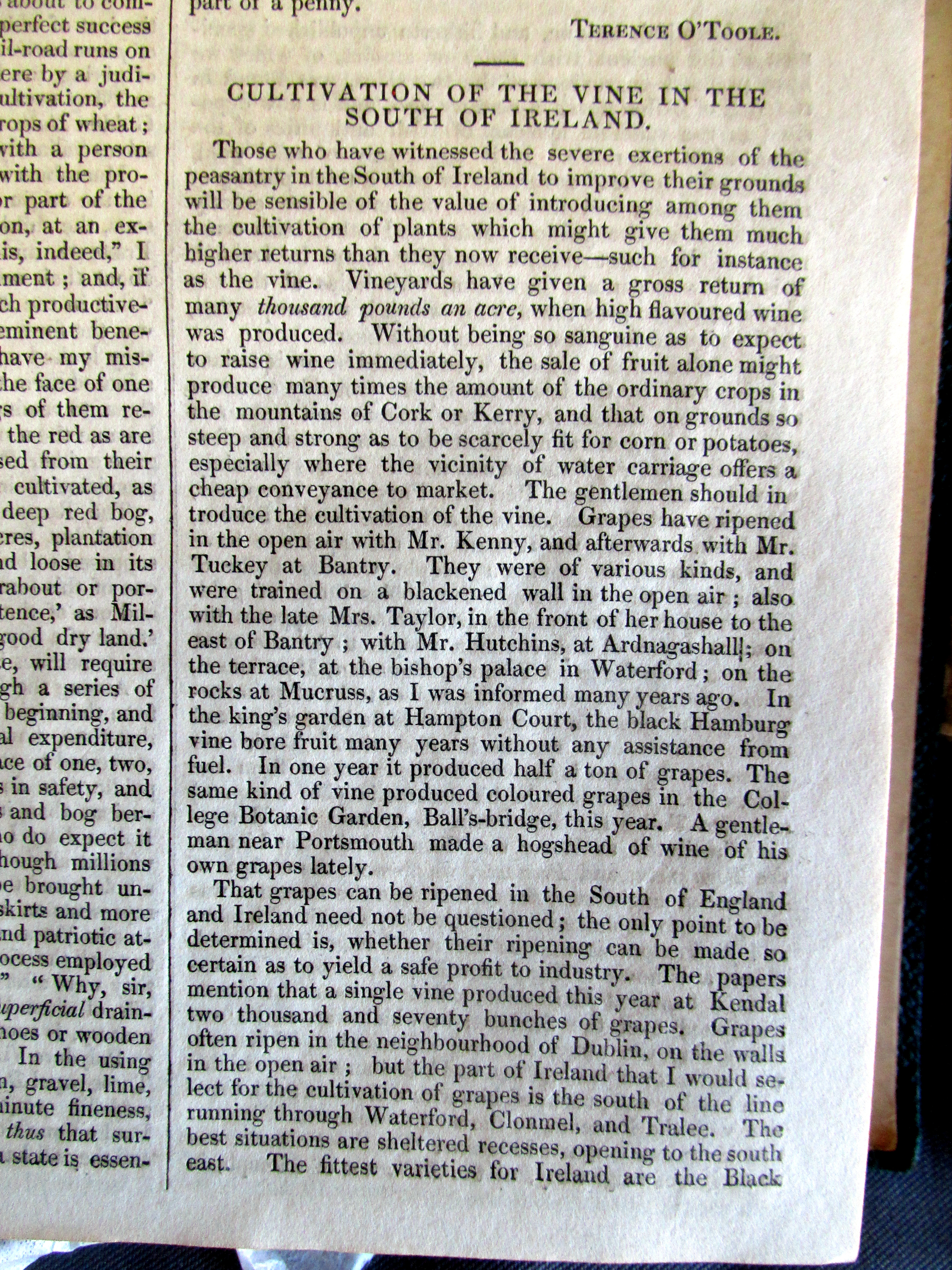 Ripening Grapes in the Open Air in Bantry pre 1832, Mr. Kenny, Mr.Tuckey of Bantry, the late Mrs Taylor East of Bantry Mr Hutchins of Adnagashel near Glengariff. The botanist Ellen Hutchins was of this family the house is now gone but some rare plants remain.