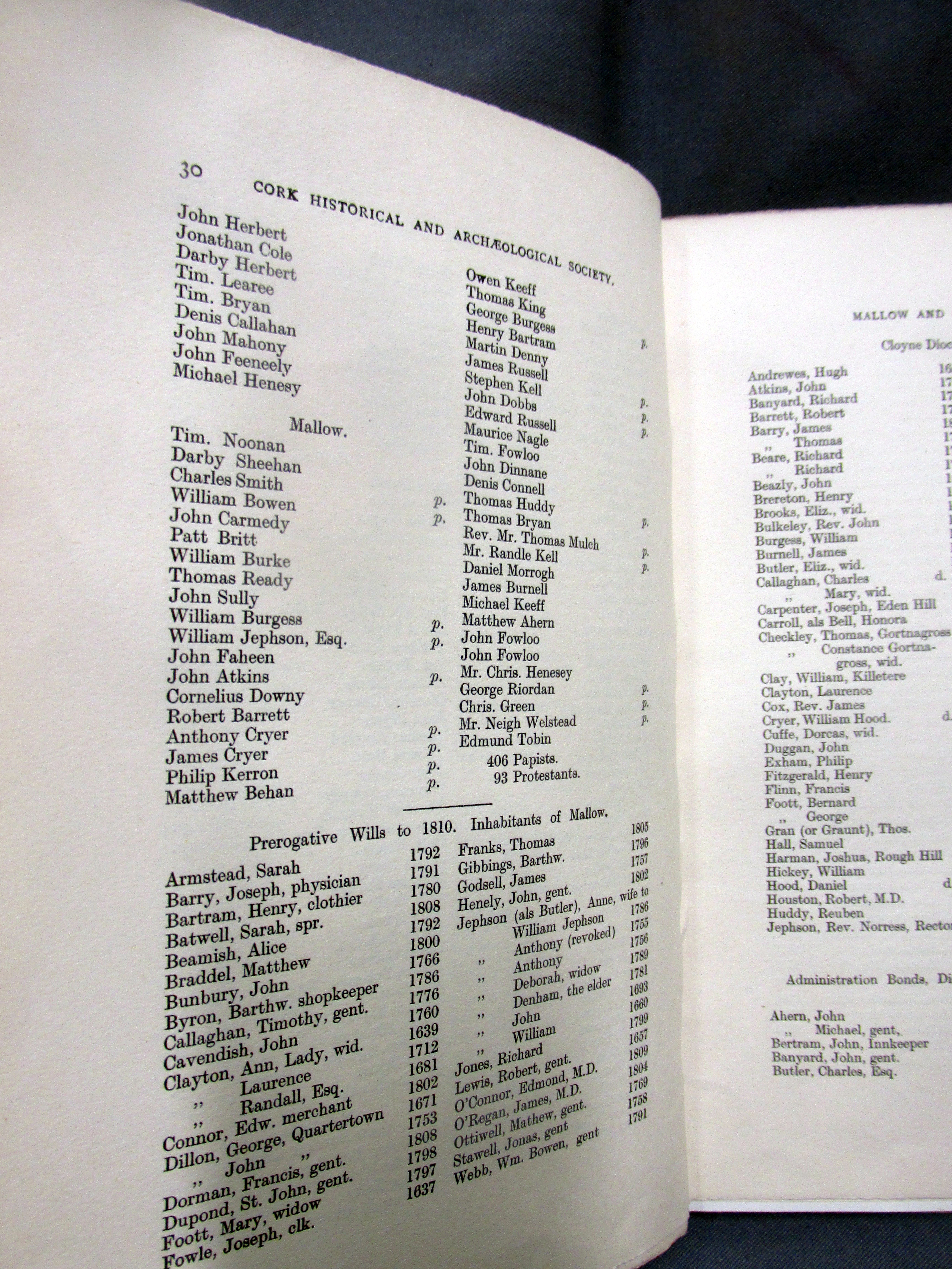 Census of Mallow and Environs, Co Cork compiled from the Public Records Office, Dublin pre 1922, Members Mallow Loyal Protestant Society 1745, Members, Masonic Lodge No 9, Warrant 7th April 1808, Mallow.