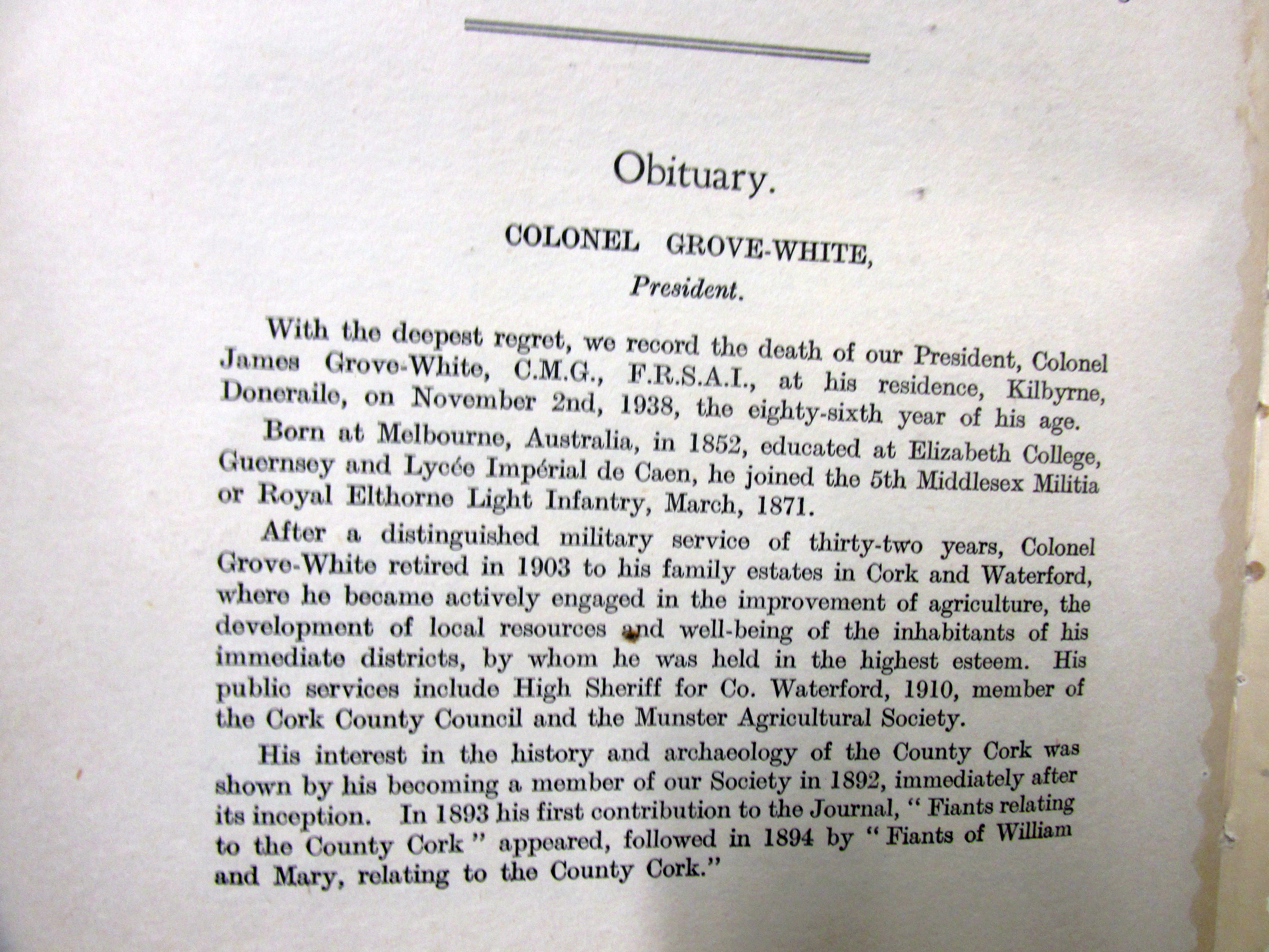 Colonel Grove White, Born Melbourne, Australia 1852 died Cork 1938, Cork Antiquarian, Member County Council, Munster Agricultural Society, Brother-in-Law, Maurice FitzGibbon, ‘The White Knight and Mac an tSen Riddery