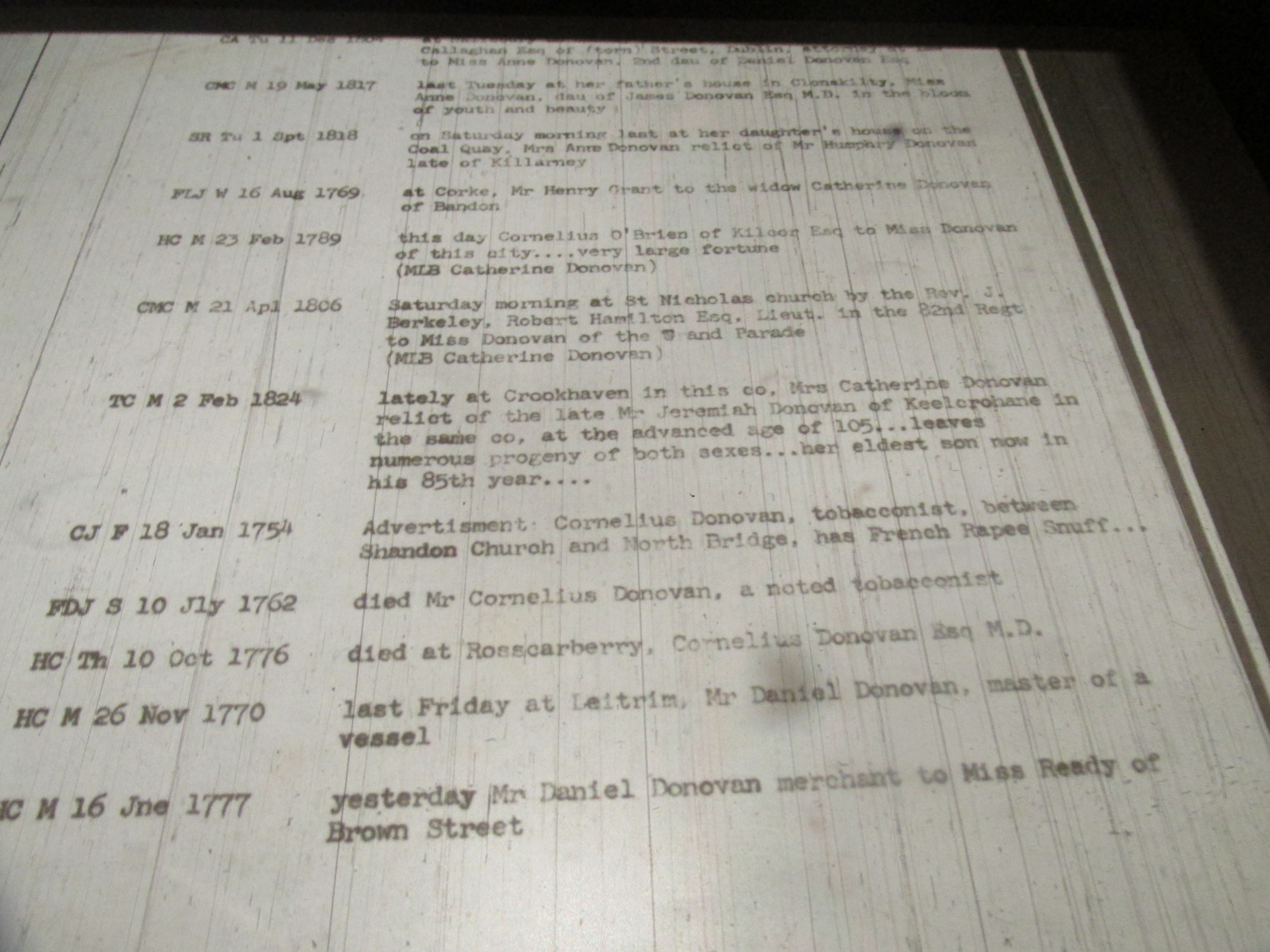 1824, Died at the advanced age of 105 at Crookhaven, West Cork, Mrs. Catherine Donovan, relict of Jeremiah Donovan of Keelcrohane (Kilcrohane), leaving numerous progeny of both sexes her eldest son in his 85th years.