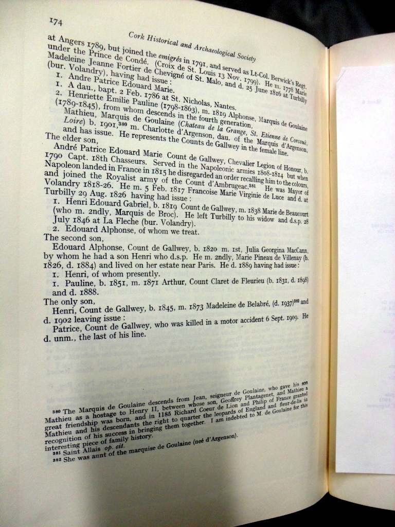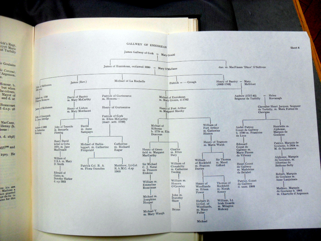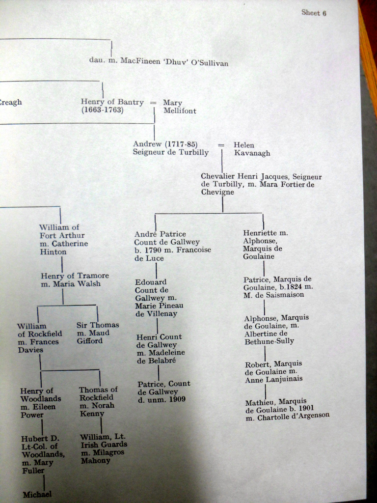 Genealogy Chart of James Gallwey, Outlawed in 1690 and Mary O’Mullane, including French Branch descended from Andrew Gallwey born Enniskeane, Co. Cork, 1717, owner of Chateau and Estate at Turbily, improver of Breton Agriculture, host to Arthur Young, son officer in American War of Independence.