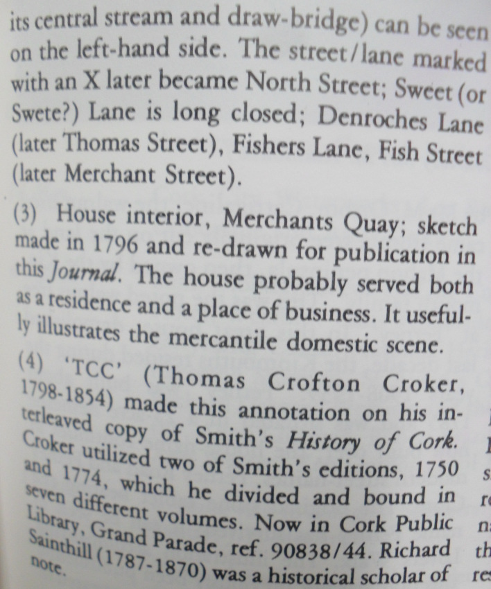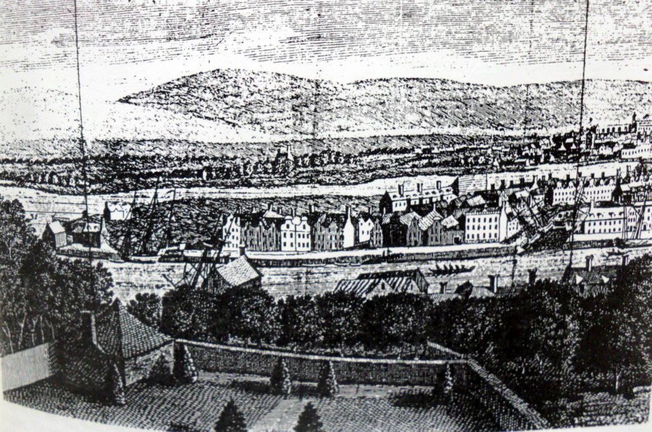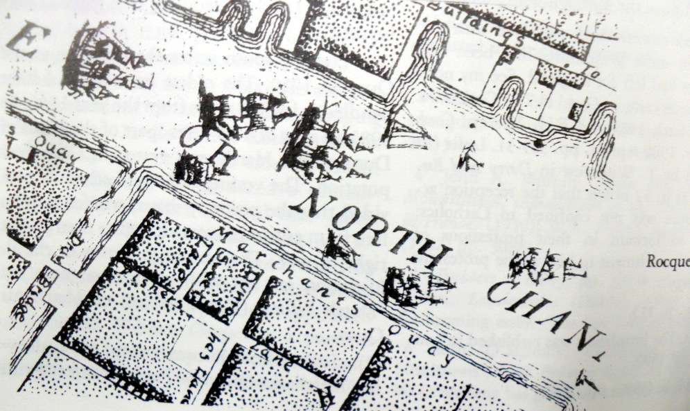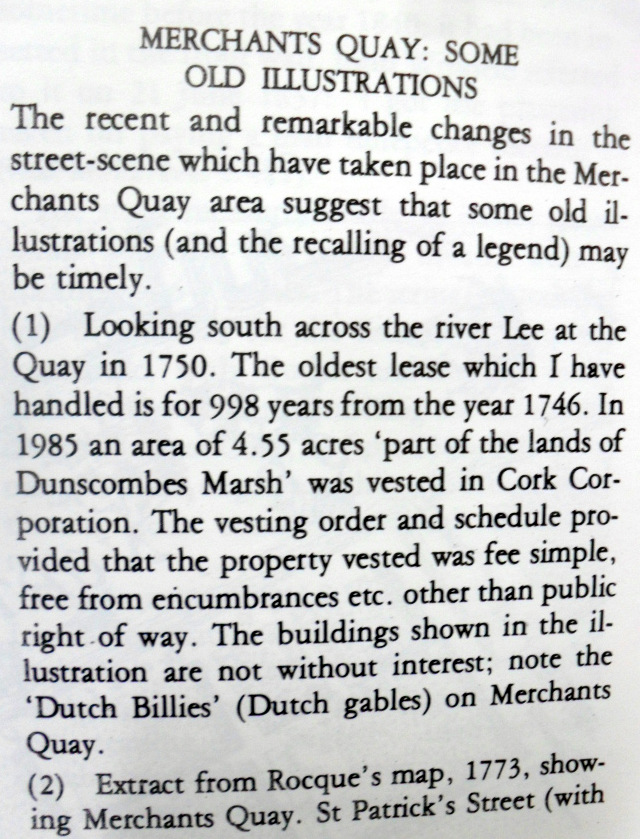 View of Merchant’s Quay (Dunscomb’s Marsh), 1750 with unreclaimed land on river, Dutch Billies, Doorway of Merchant’s House 1796 and Dunscomb Mansion Mount Desert, Cork.