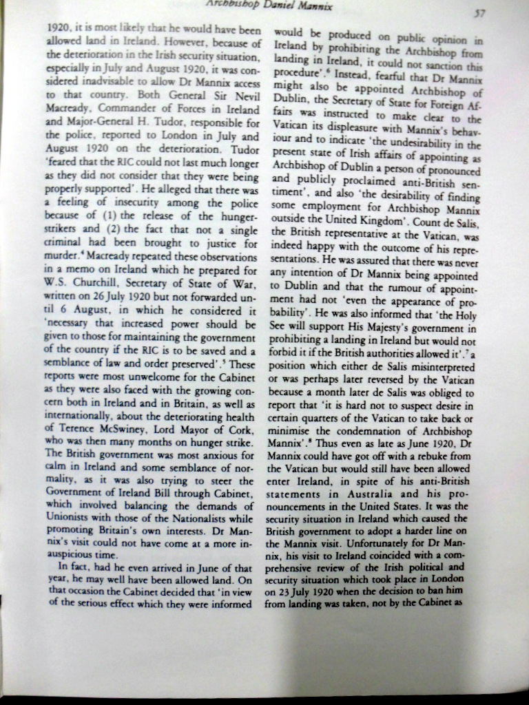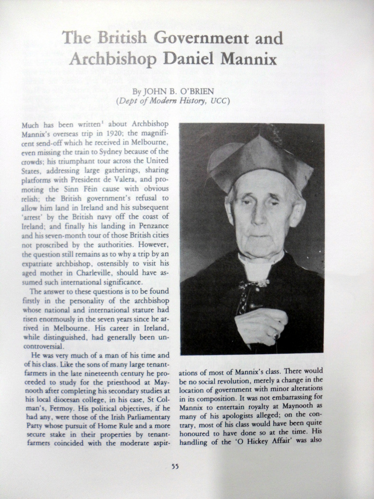 Archbishop Mannix (1864-1963) of Melbourne, Australia, from Charleville, Co. Cork, attempted visit to Ireland 1920 refusal of British Government to allow him land, and later ‘Arrest’.
