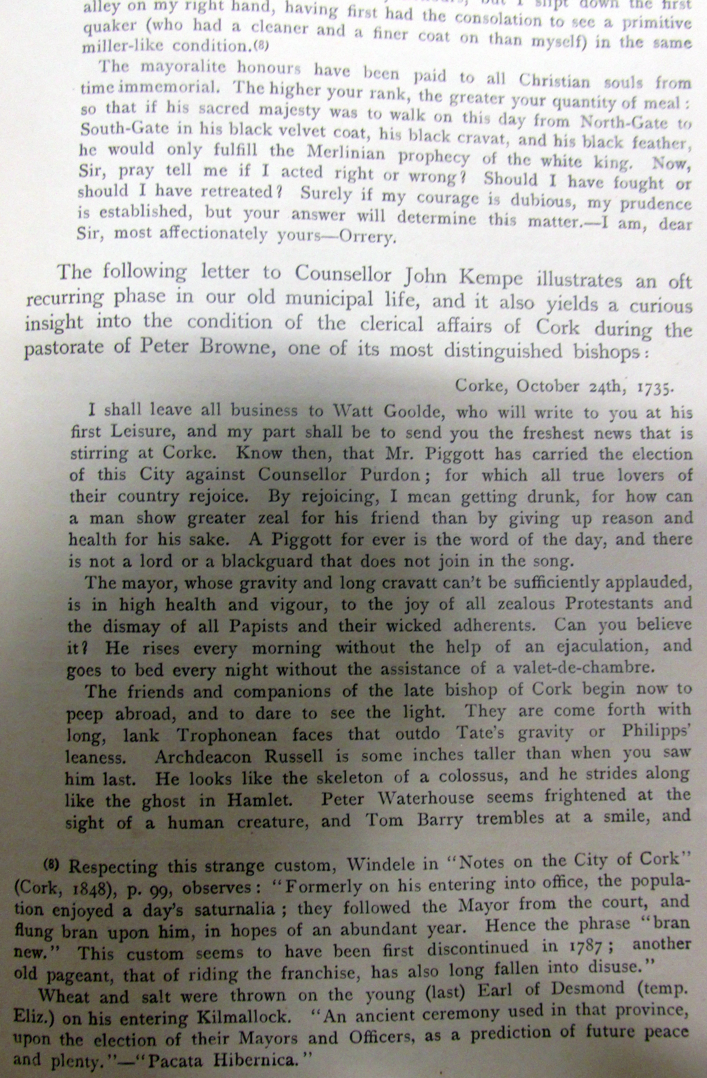 Pre 1787 Custom on the election of Cork Mayor, when he entered office the population enjoyed a day’s saturnalia; they followed the Mayor from the Court, and they threw bran upon him in hope of an abundant year, another Custom then falling into disuse the pageant of riding the franchise.