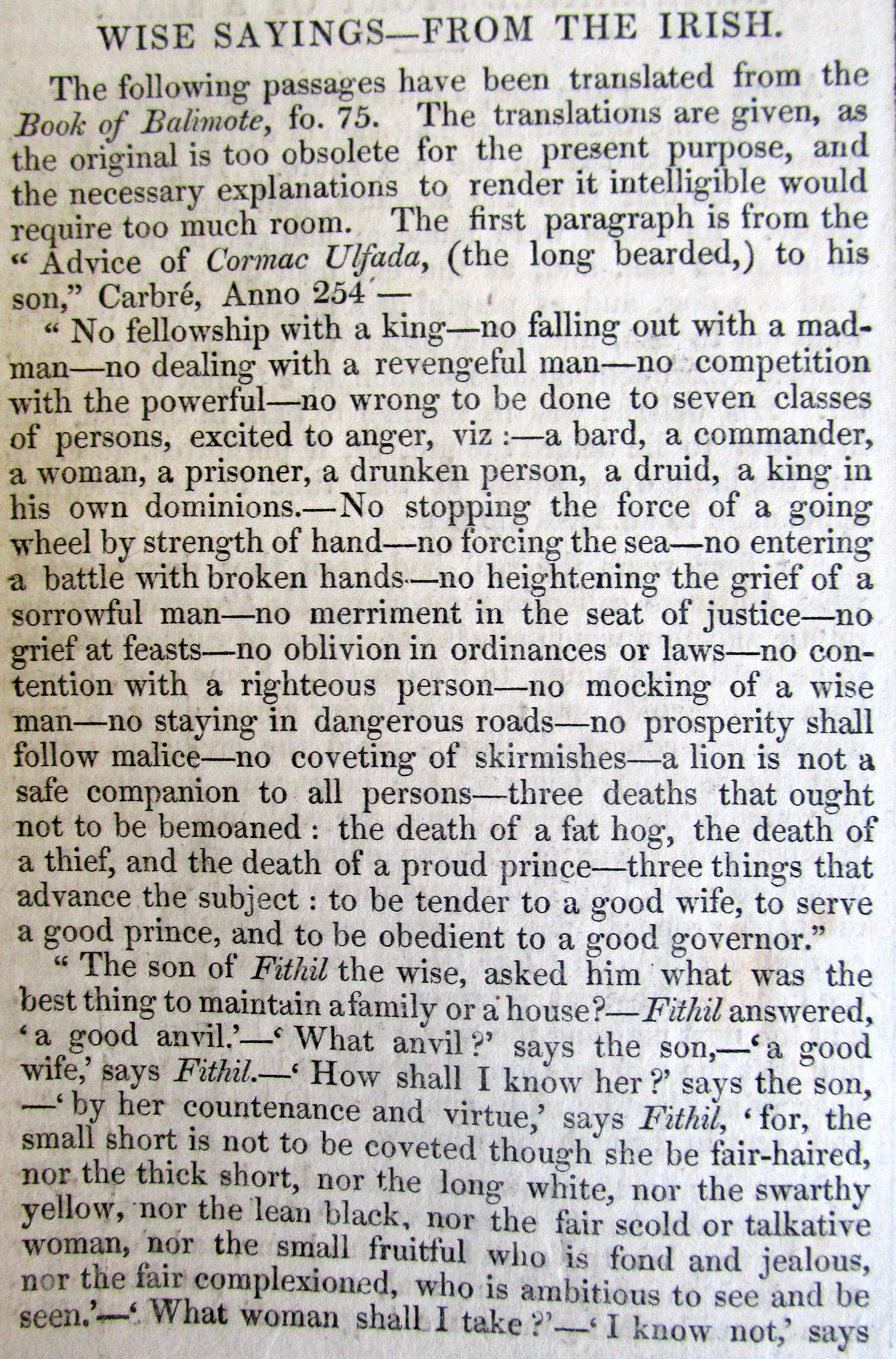 No wrong to be done to seven classes of person excited to anger, a Bard, a Commander, a Woman, a Prisoner, a Commander, a Drunken person, a Druid, a King in his own Dominance from the Book of Ballymote, 1390.