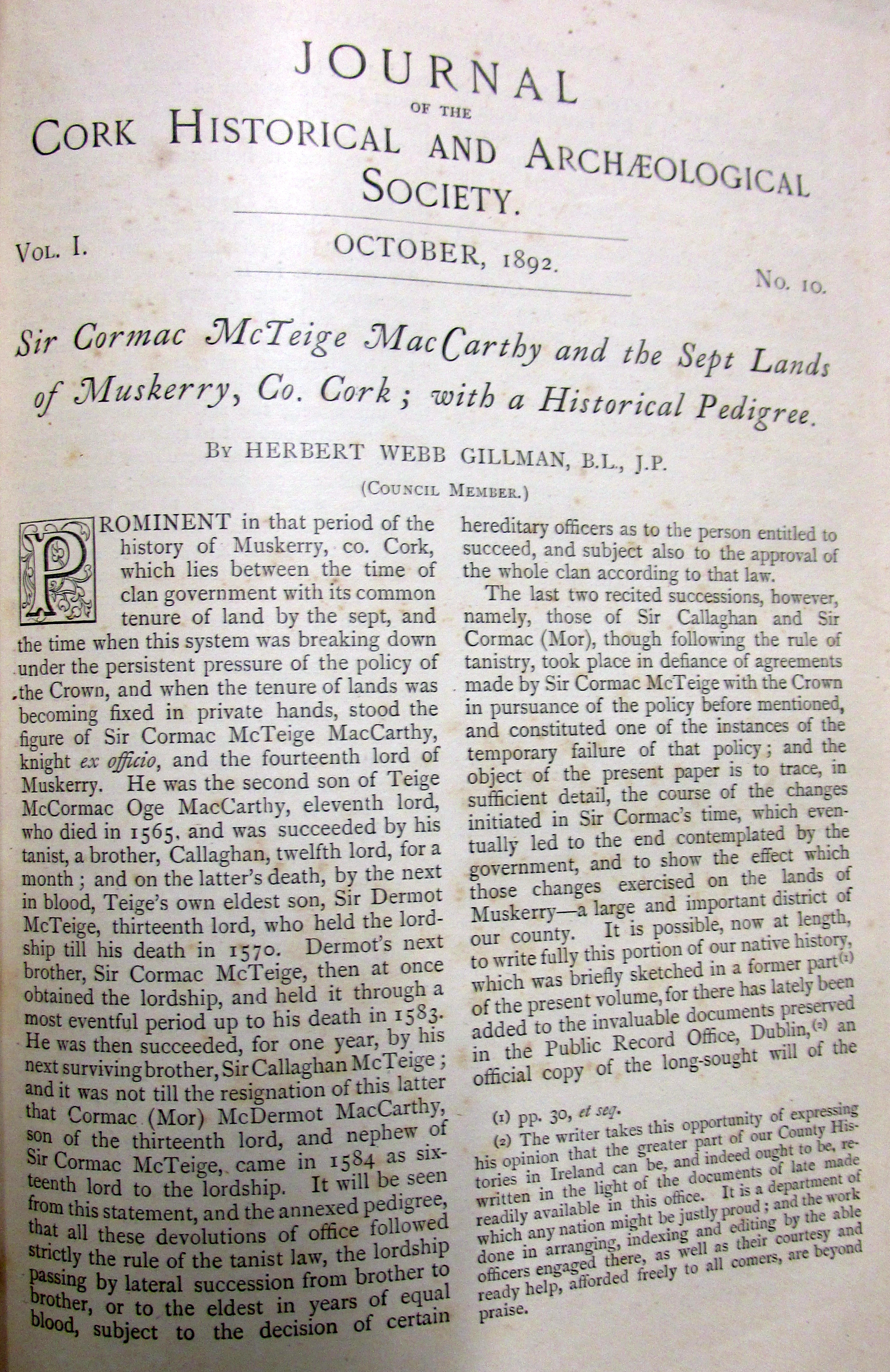 Herbert Webb Gillman, BL, JP, Cork Antiquarian, in 1892 ‘The writer takes the opportunity of expressing his opinion that the greater part of our County Histories in Ireland can be, and indeed ought to be, rewritten in the light of the documents of late being made readily available by the Public Record Office. It is a Department of which any Nation ought to be justly proud; and the work done in arranging, indexing and editing by the able officers engage there, so well by their courtesy and ready help, afforded freely to all comers are beyond praise.
