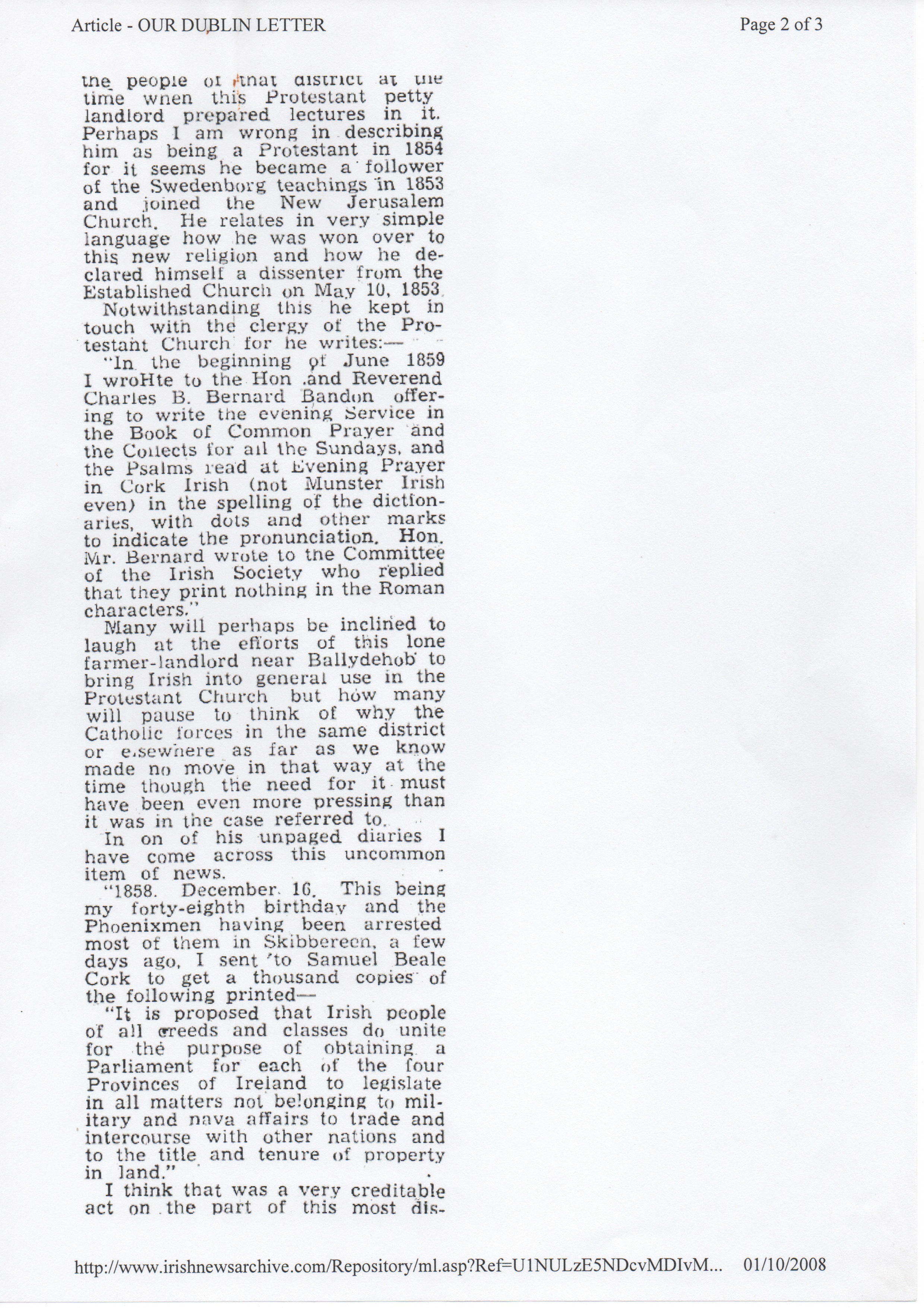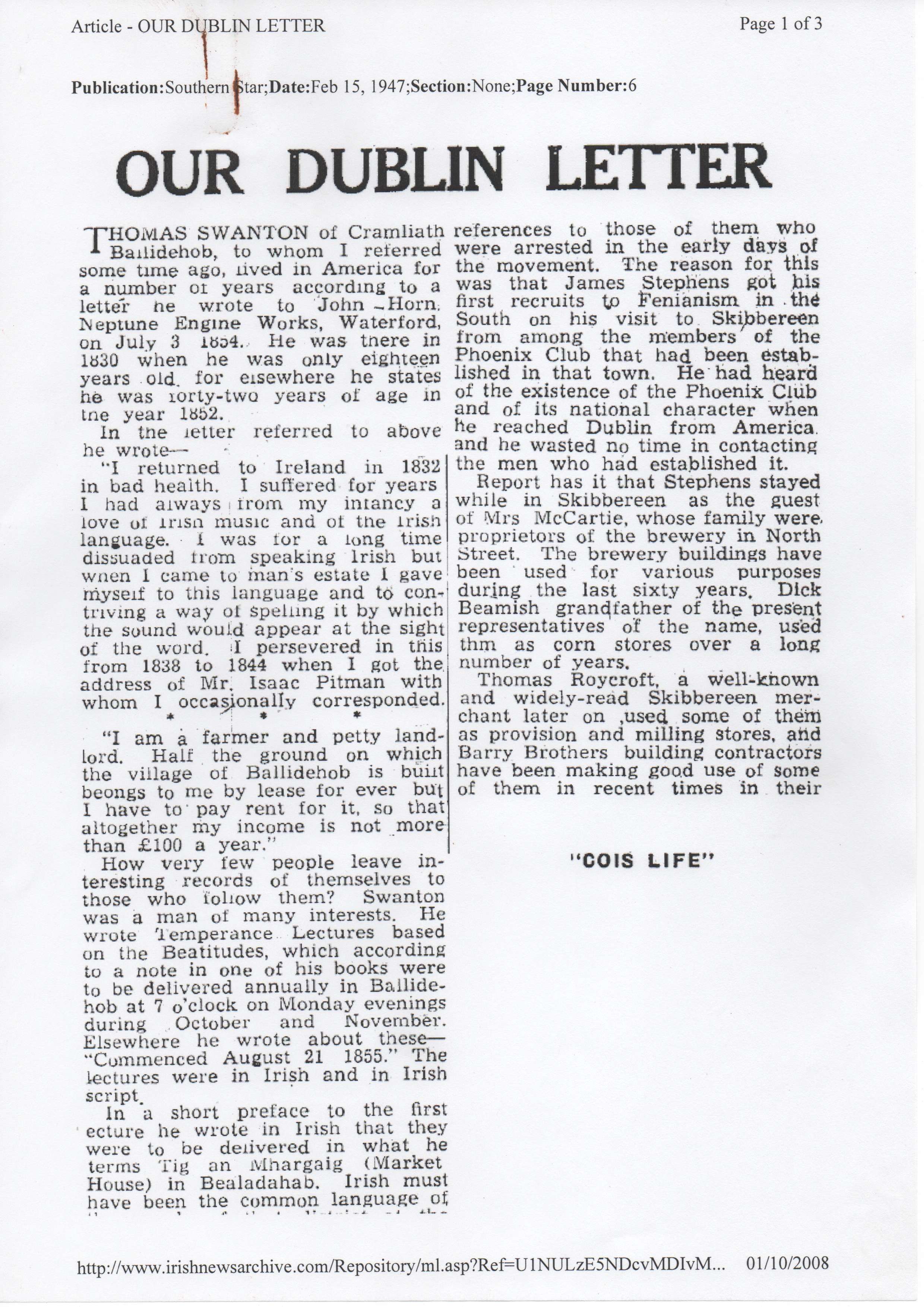 Peadar Ó hAnnracháin, Gaelic League Organiser, Cois Life, in the Southern Star, Skibbereen, West Cork, 15th February 1947 additional article on Thomas Swanton (1812-), Farmer and petty Landlord, Crianliath, Ballydehob, Correspondence with John Horn, Neptune Engine Works, Waterford, Temperance Lectures based on the Beatitudes, delivered annually in Irish and in the Irish Script in Tig an Mhargig (Market House), Ballydehob, follower of Swedenborg Teachings Joining New Jerusalem Group, offering to write Evening Service in Bandon in Cork Irish, Proposal for Parliament of each of the 4 provinces of Ireland, references to Phoenix men (Fenians).