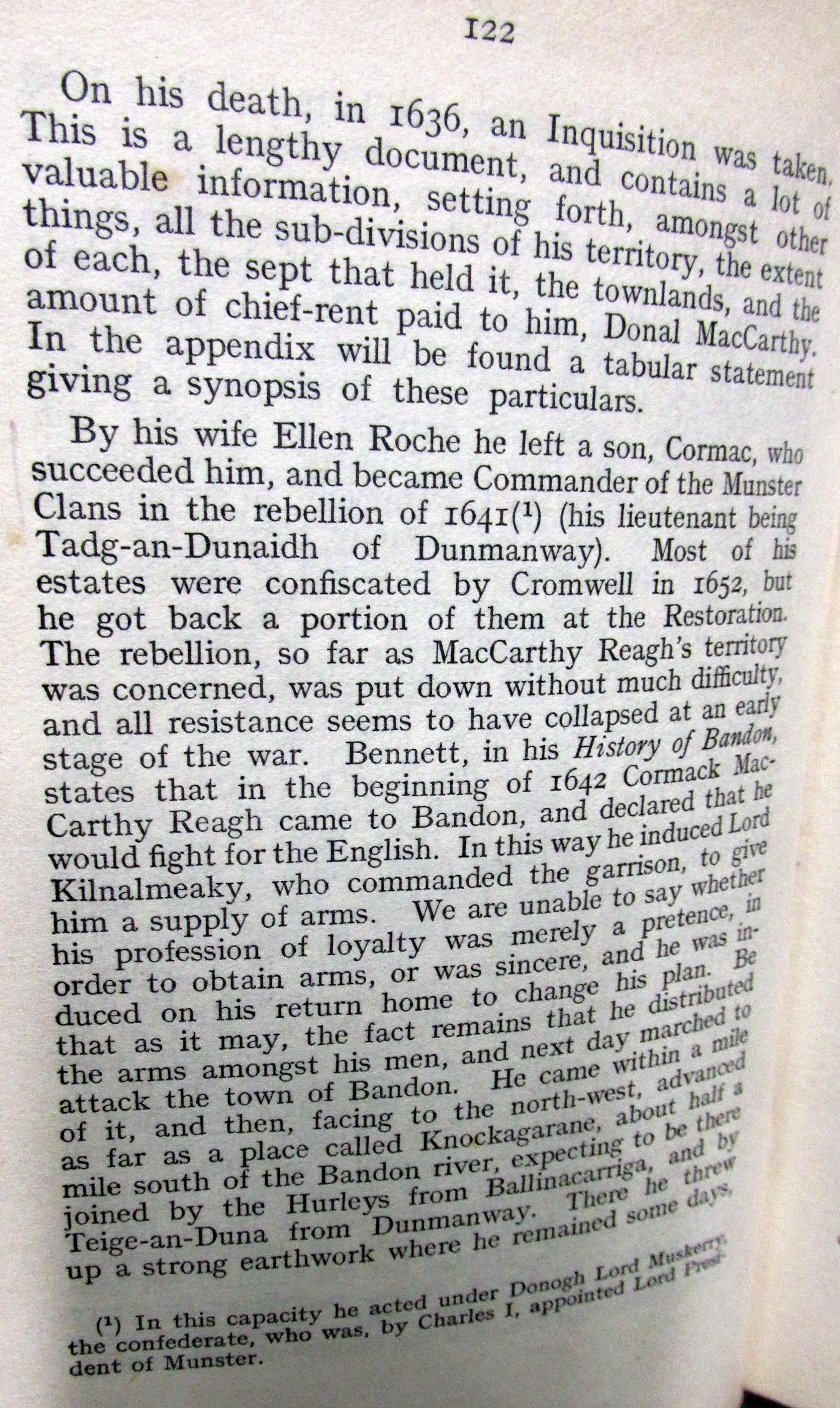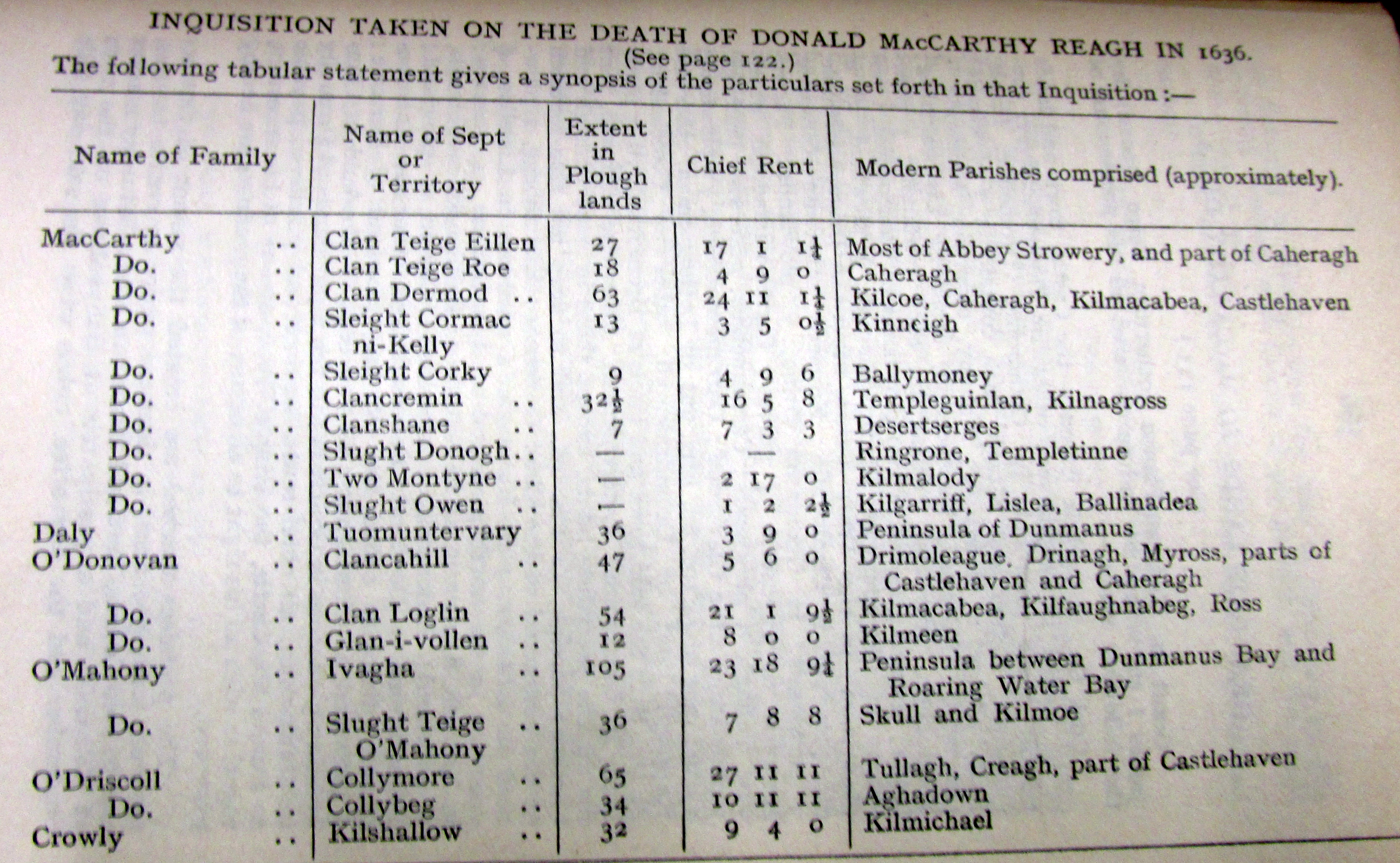 1636 Inquisition on death of Donald McCarthy Reagh, Families mentioned Dalys, Crowleys, O’Driscolls, McCarthys, O’Mahonys, Areas include, Aughadown, Caheragh, Castlehaven, Drimoleague, Kilgariff, Kilcoe, Muintervara/Kilcrohane, Myross, Schull