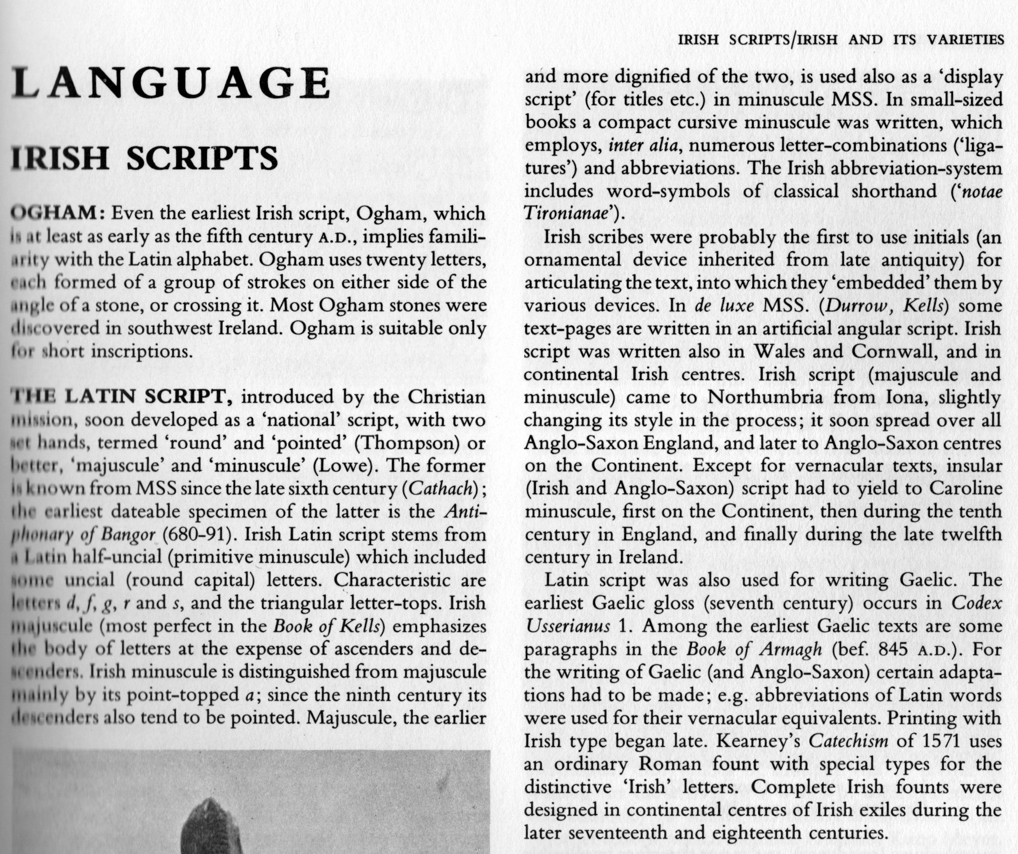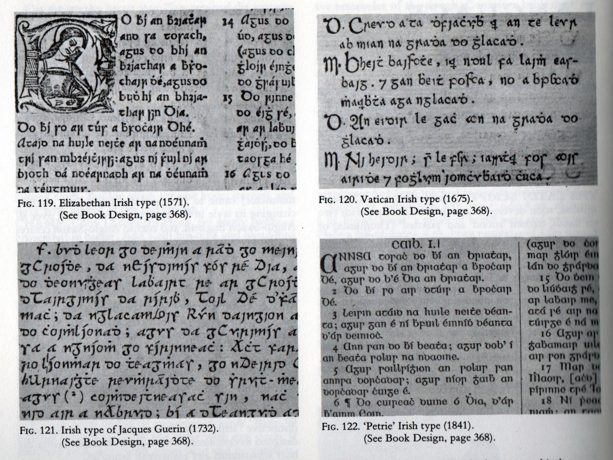 Earliest Irish script in Latin Antiphony of Bangor, 680 AD, Irish Scribes First to use initials for articulating texts, Late Printing in Irish with Kearney’s Catechism 1571, examples of Gaelic Script, Elizabethan 1571 AD, Vatican, 1675 AD, Jacques Guerin 1732 AD, Petrie 1841 SD.