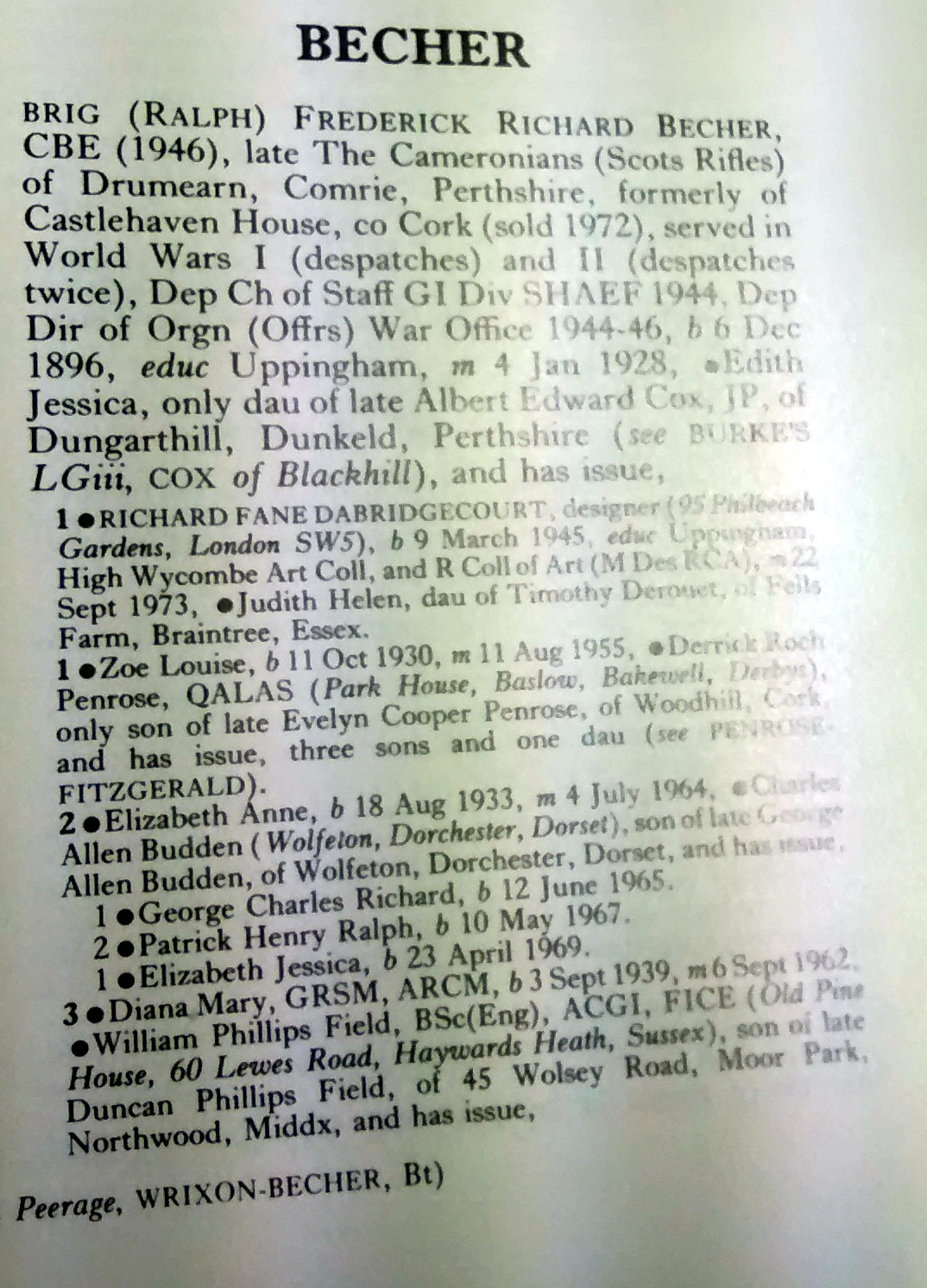 11 March 1708. Brothers in Law, Henry Turner, Richard Turner and John Roberts, Trustees and Executors. Wife Elizabeth Becher. Sons Edward and Michael Becher both married. His Henry John and Lionell Becher daughter Susan Becher. Kinsman Francis Becher Tallough (Tallow), Co Waterford Clerk. Legacy to Parish of Ballymodan (Bandon)