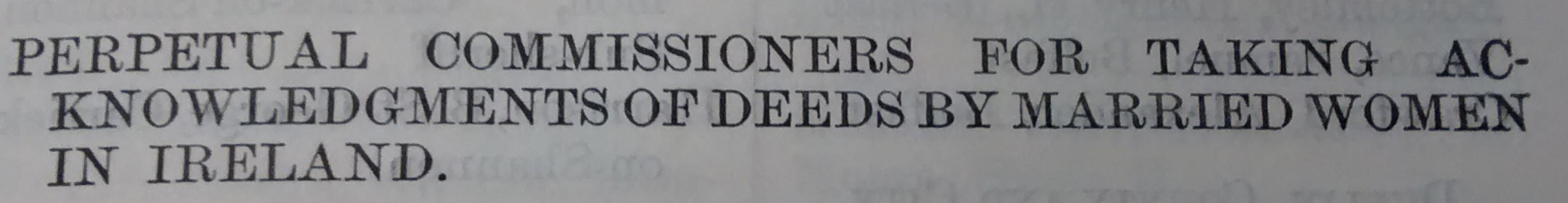 Perpetual Commissioners For Taking Acknowledgement Of Deeds By Married Women In Ireland For Co. Cork, 1886. 23 Monday Feb 2015 Posted by durrushistory in Uncategorized ≈ Leave a comment Perpetual Commissioners For Taking Acknowledgement Of Deeds By Married Women In Ireland For Co. Cork, 1886. Share this: Click to share on X (Opens in new window) X More Click to share on Facebook (Opens in new window) Facebook Like Loading...