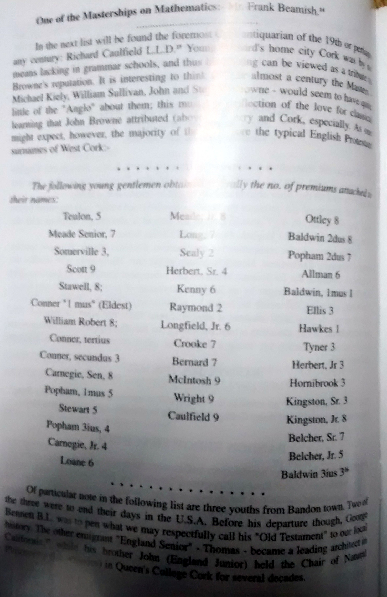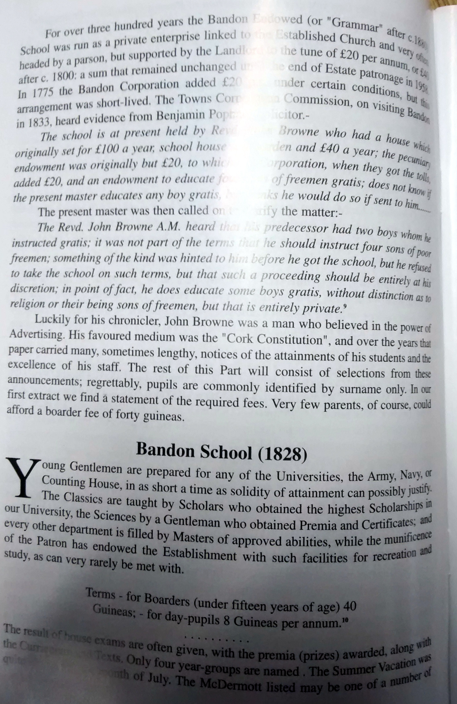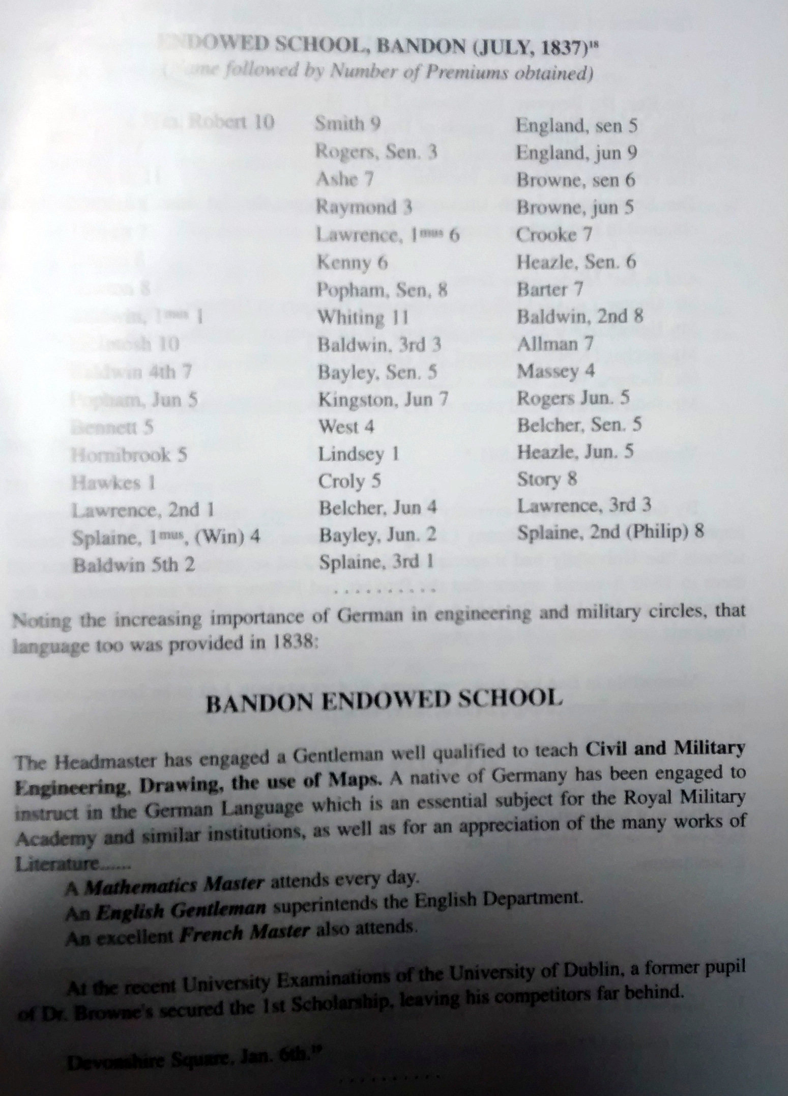 Doctor John Browne (born Elphin Roscomon) (1798-1870), Master Bandon Endowed School, Evidence 1855, some boys gooing for East India Company Clerkships, Curriculum, Bandon Grammar School. Co. Cork, 1906 and 1924, Photograph Pupils names included.