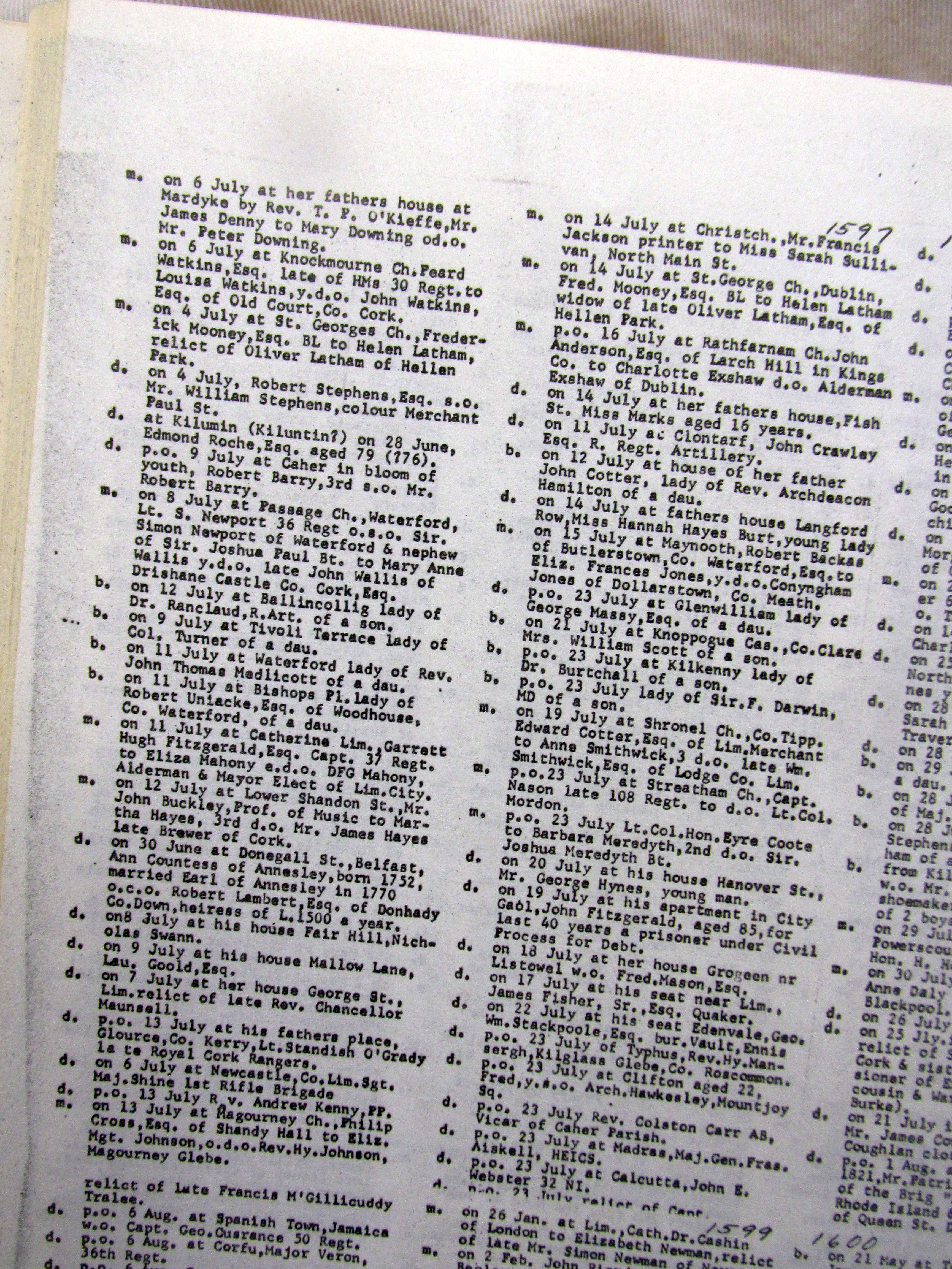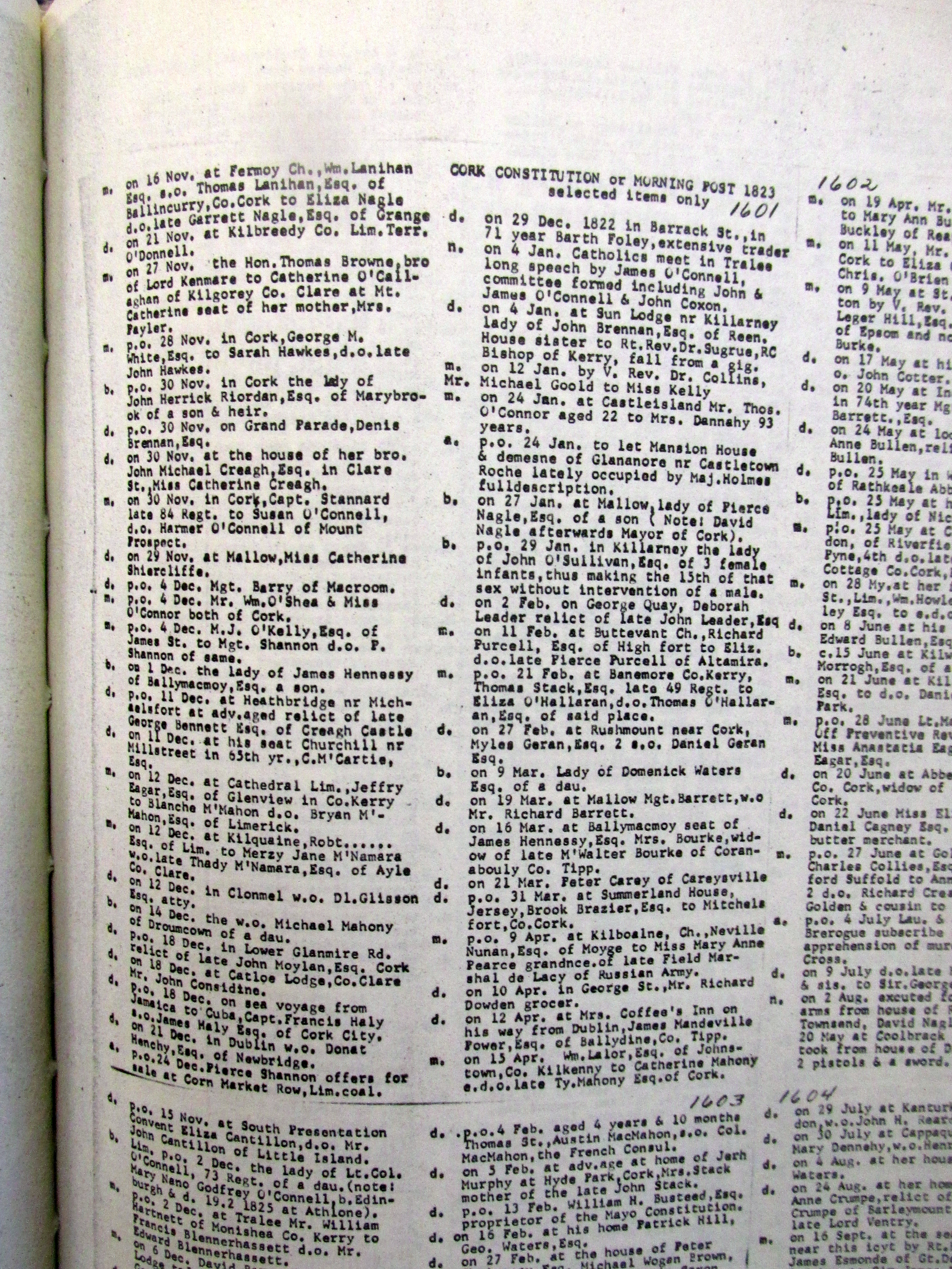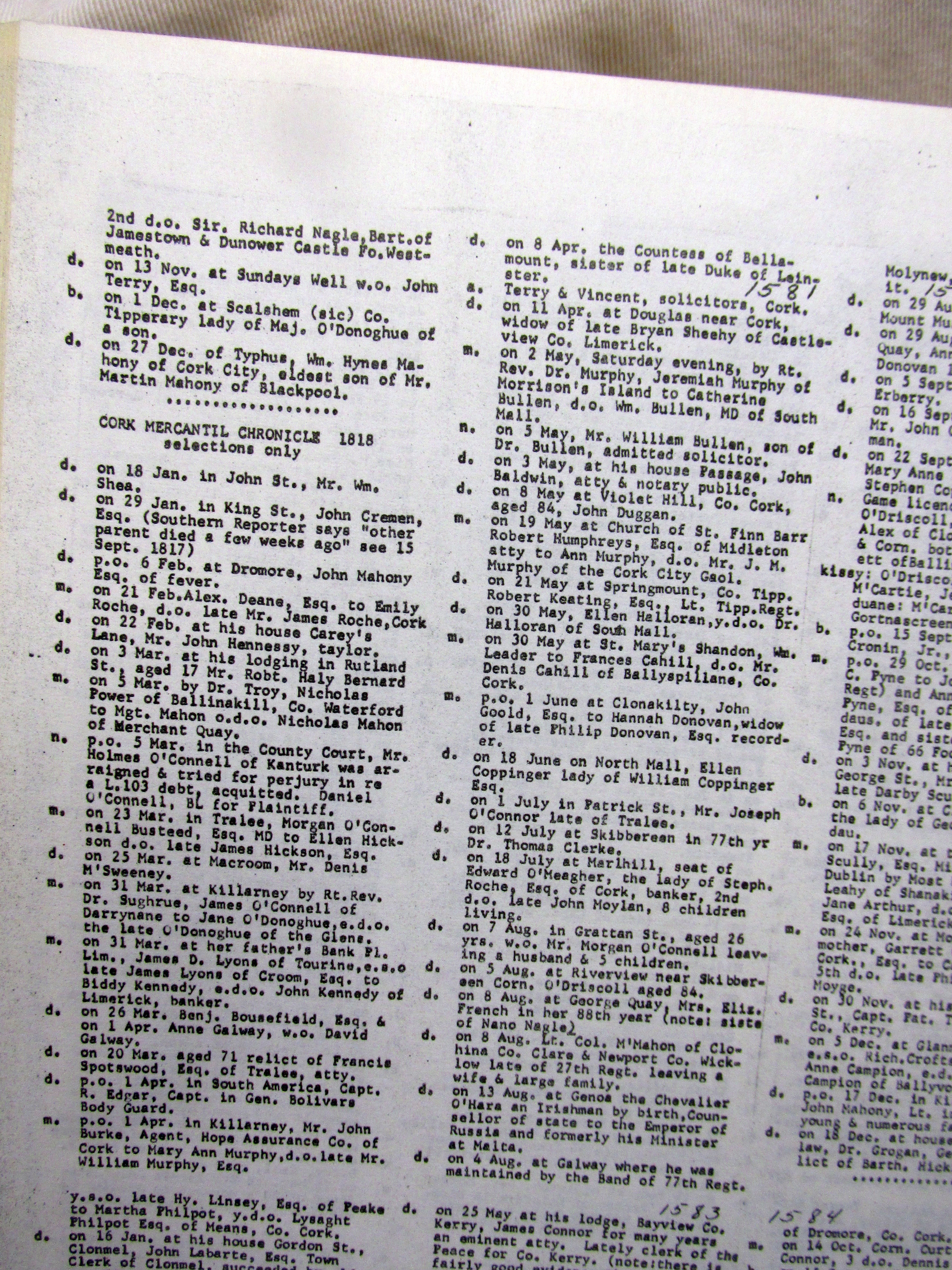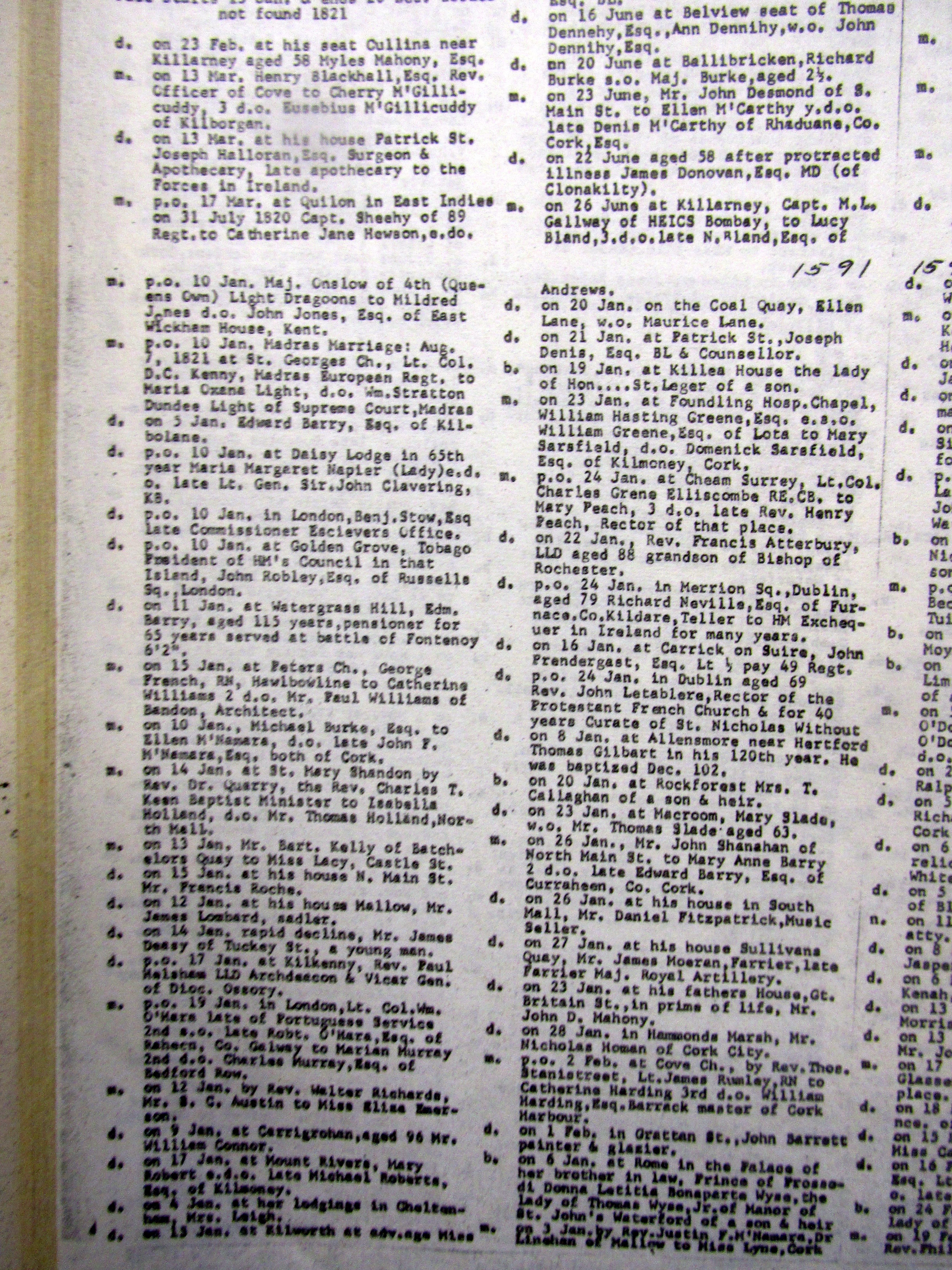 “Died, 24th November 1820, Baltimore, Carolina, USA, Dr. Mathew O’Driscoll. of Creagh and Baltimore USA, 64, son of the late ‘The’ O’Driscoll, Creagh brother of Michael O’Driscoll Esq., and Died on the 7th May 1823, at Baltimore House, West Cork, of a Decline induced by too Severe Studies of Medicine which he had completed with great Distinction at Edinburgh Denis O’Driscoll Esq. aged 21, only son of ‘The’ O’Driscoll., Esq., of Baltimore and death of youngest daughter of ‘The O’Driscoll’ July 1826 from The Southern Reporter.