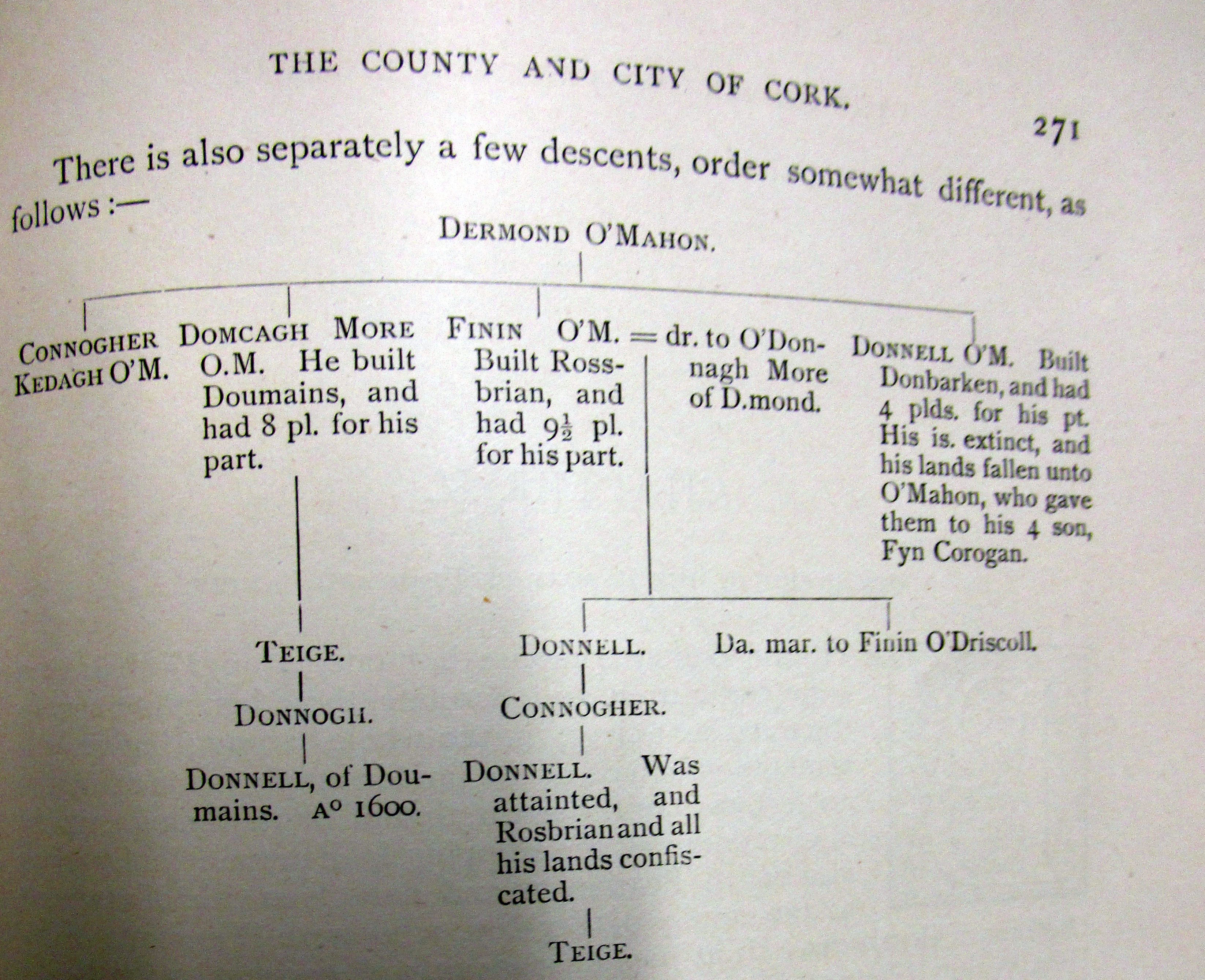 1600, The O’Mahonys, 63 Ploughlands of Ivagh (Mizen Peninsula), West Cork and the Custom of Tanistry whereby O’Mahony is made Lord of the Country by McCarthy Reagh by delivering to him a White Rod and he in turn pays to the McCarthys 10 shillings for every ploughland and the Genealogy of this O’Mahony Sept.